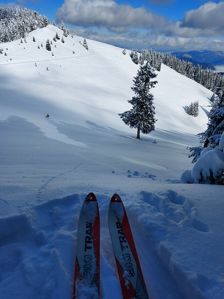 Takže nazad a na prekvapenie relatívne v pohode aj dole brehom, ani som v strmšom vyzúvať nemusel, na pásoch ma čerstvý sneh tak akurát dobrzďoval. Južné orientácie už ale okolo obeda začali vlhnúť, dvíhajúci sa vietor sa postaral o „sekundárne sneženie“ a miestami sa ozvalo aj poriadne žuchnutie, keď niektorý strom zhodil väčšiu čapicu. Pohľad doprava, do diaľky, ukazoval tragicky sivé rúbaniská na severných svahoch Nízkych Tatier: