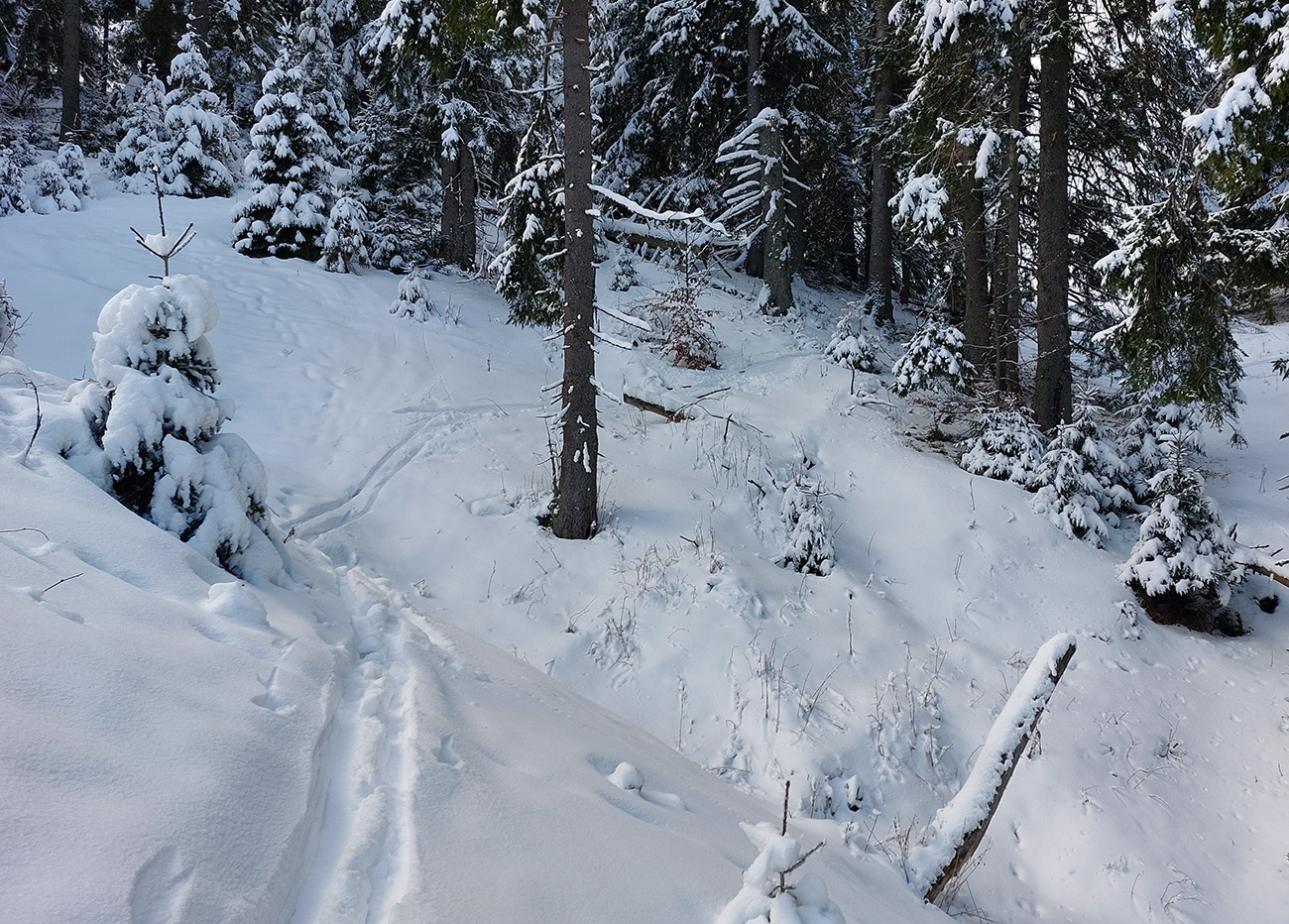 Na zvážnicu cez rúbaň nad záverom Čutkovskej doliny som to vytlačil relatívne komfortne, snehu je tam pod stromami málo, ale aj tých stromov je tam málo :-) A potom som sa už bezpečne zviezol dole do lesa, snehu dosť, lebo ani tam moc slnko nezasvieti: