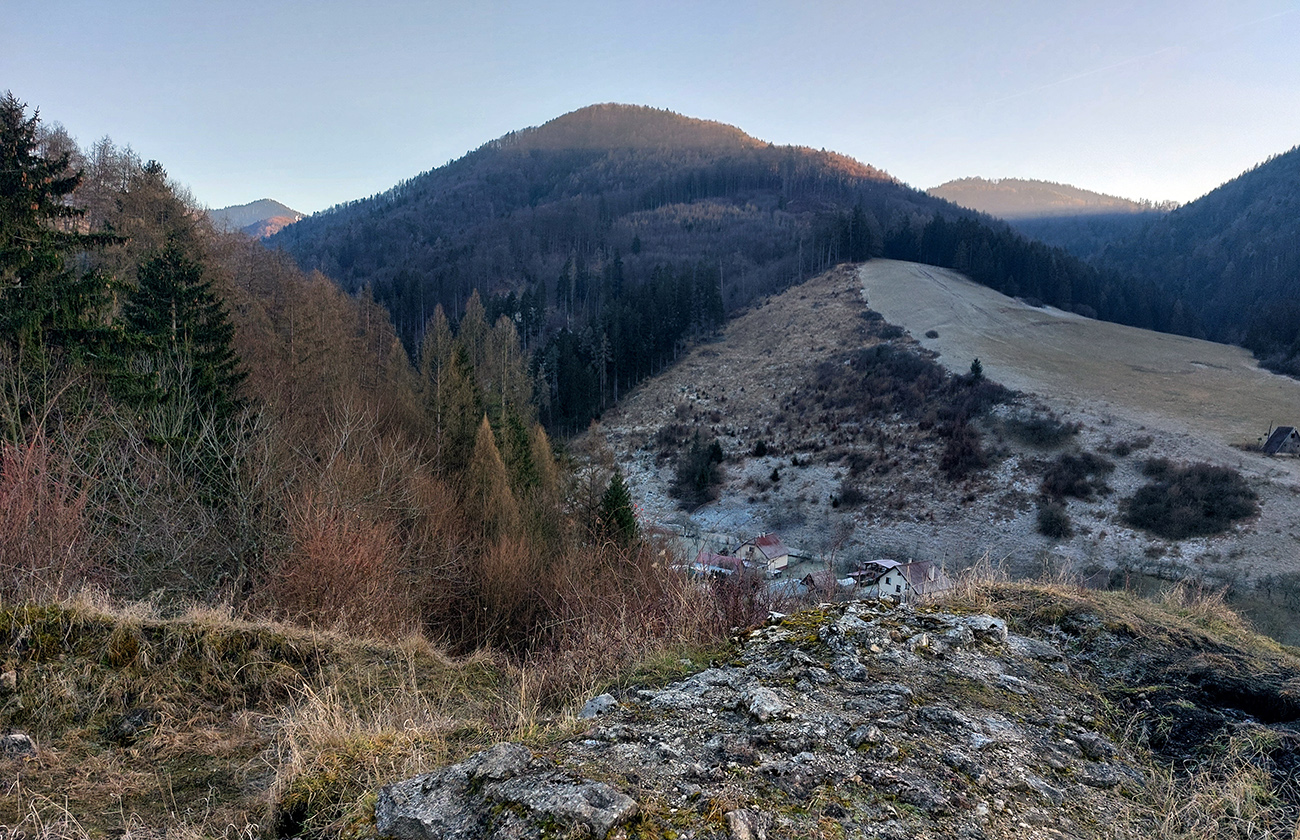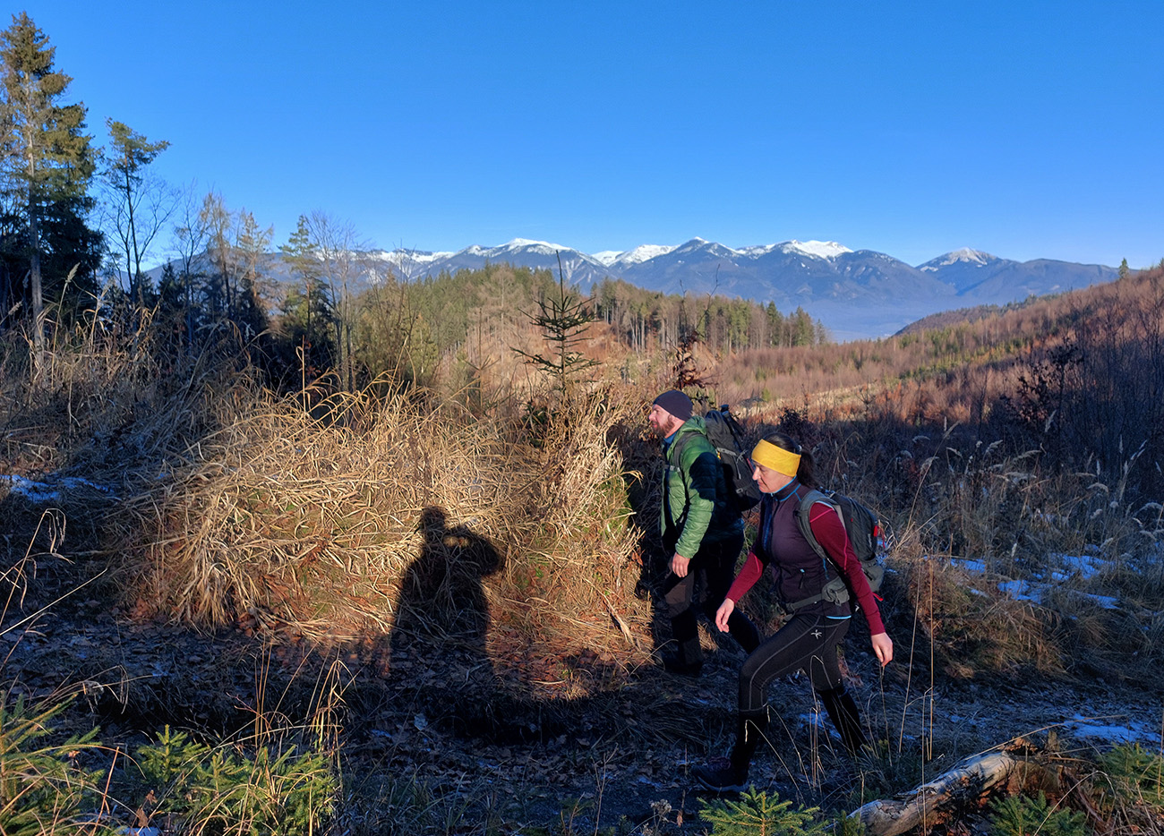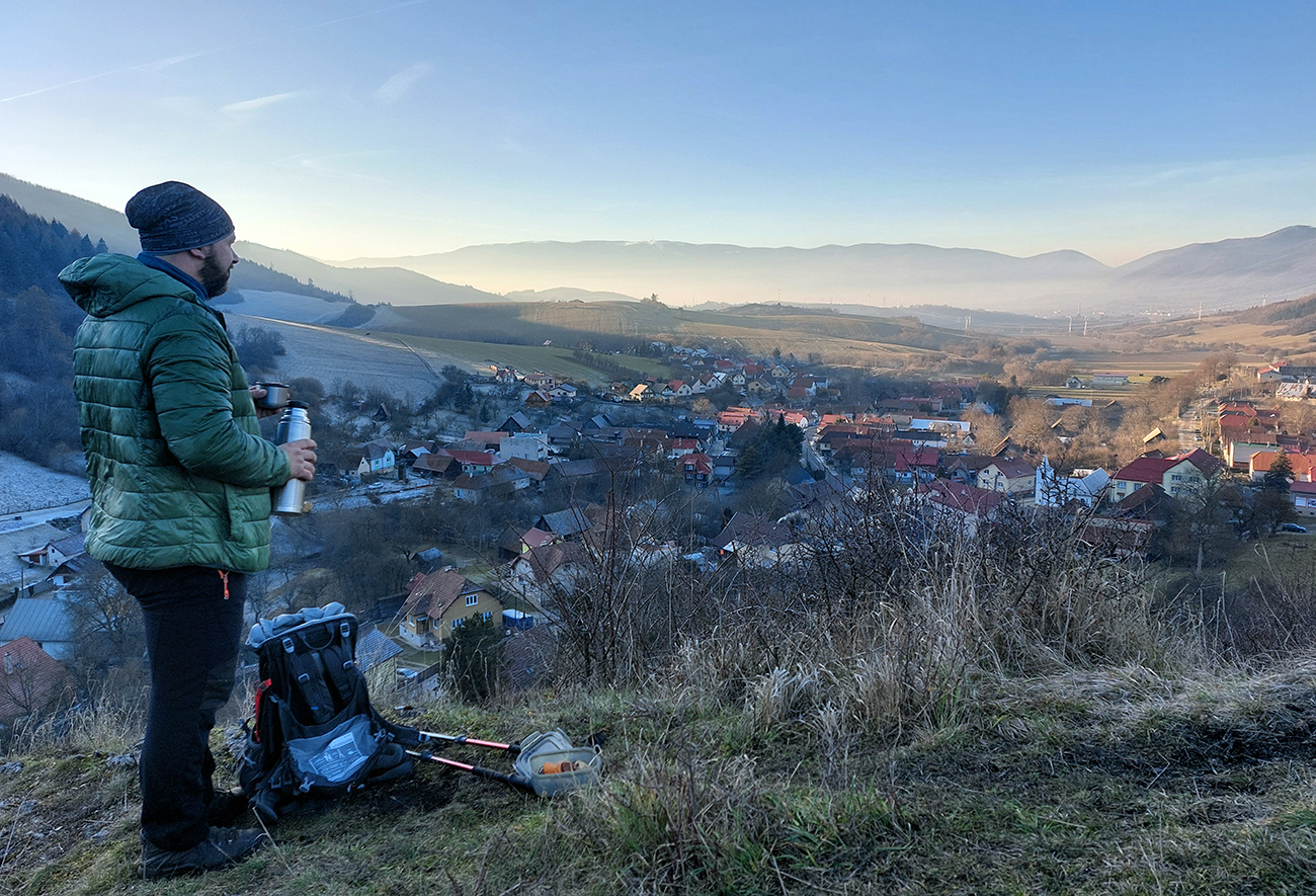 V dedine ešte pár výškových na Baštu – oplatilo sa, lebo okrem Fatry sa otvoril pohľadom aj na sever kotliny, jemne rozostrený riedkym inverzným závojom a nízkym popoludňajším slnkom. A za chrbtami nám spomedzi Vrchdielu a Smrekového vykúkala Prieložnica. Fajné kolečko to bolo, aj počasie! Síce stretnúť koncom decembra v lese na prechádzke medveďa a salamandru, to nie je veľmi s meteorologickým poriadkom, no čo už...
