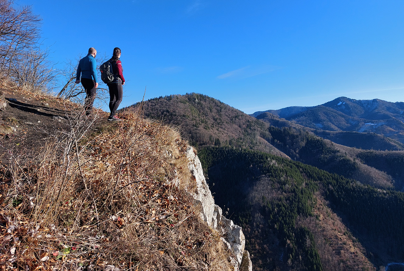 Takže najskôr dolinou potoka Máleník na Katovu skalu: mierne stúpanie, lesná cesta popri niekoľkých rybníkoch a chatách, čím vyššie, tým viac rúbaní, blata a makadamu. Strmší záver po bukovom lístí a zo skaly parádne výhľady ponad Sklabinský hrad do kotliny, až ku Kľaku malofatranskému. Za chrbtom zas ten veľkofatranský, Prieložnica hneď pred ním:
