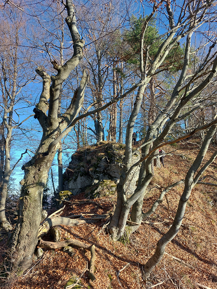 Návrat kúsok po červenej na križovatku zvážnic a z nej pevnou cestou priamo pod Prieložnicu, na lúku so soliskom, kde sa nenápadne odpája chodník na vrchol. Ten je pekne strmý, hore ešte okorenený bralkami, cez ktoré sa treba vyštverať na samý vrchol. Ale aj kus provizórneho zábradlia tam je, v najstrmšom.