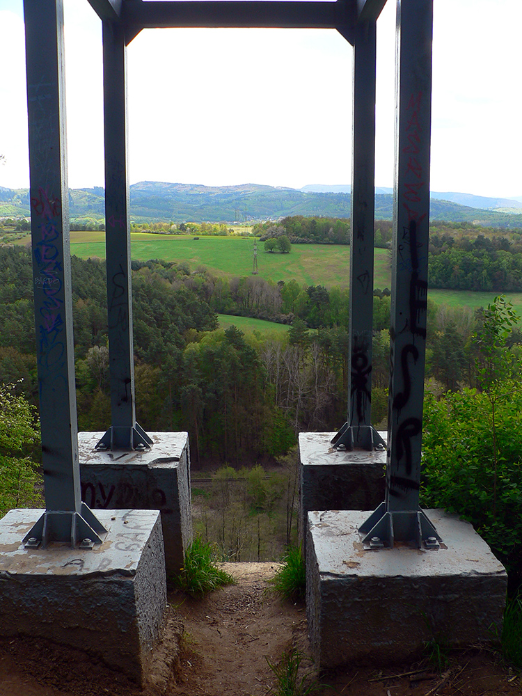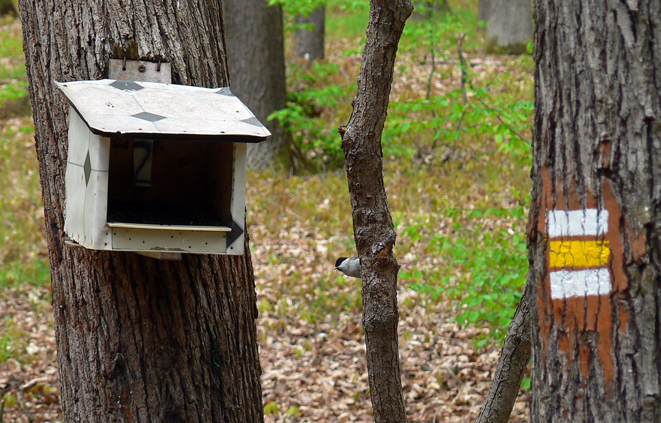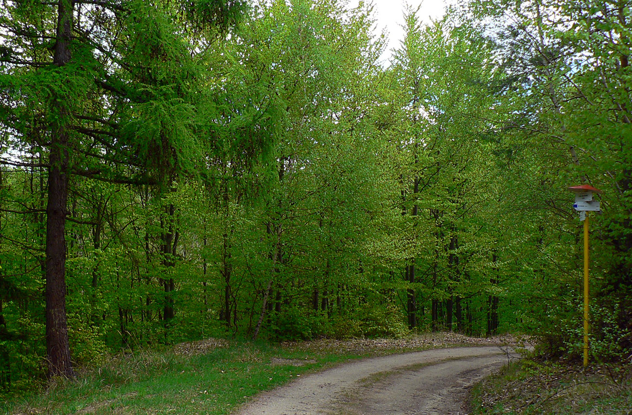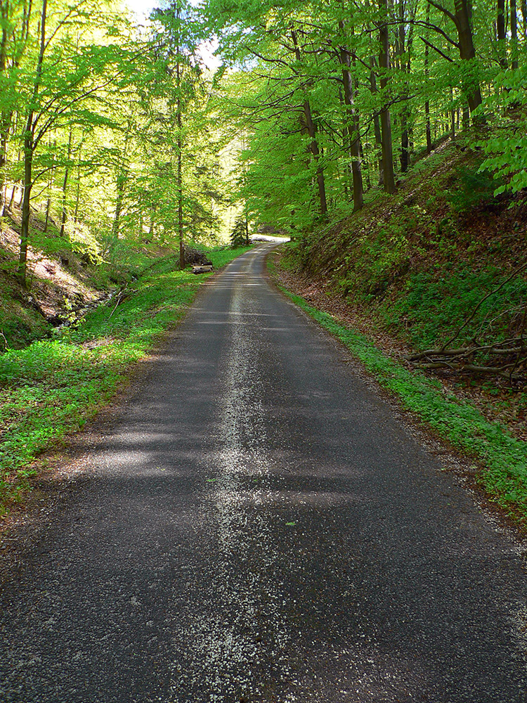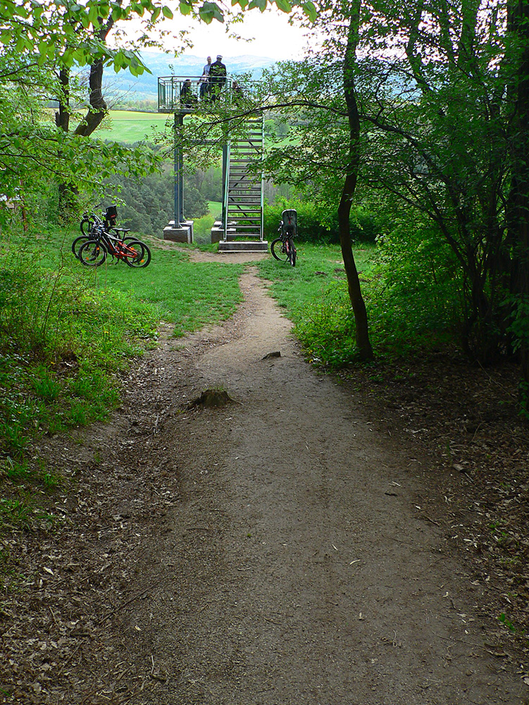 To už sme „Pod škôlkou“ a nasleduje ten doklus po tvrdej ceste. Okraje má našťastie mäkké, hlinené, tak fajn, a nad hlavou furt les. Ku koncu ju sprevádza singlík, škoda nevyužiť. To už sa začínajú objavovať „prvky civilizáce“ ako vtáčie kŕmidlá a kadejaké tabule, tak ešte krátka odbočka ku vyhliadkovej veži a o chvíľu už tá kofola syčí :-)