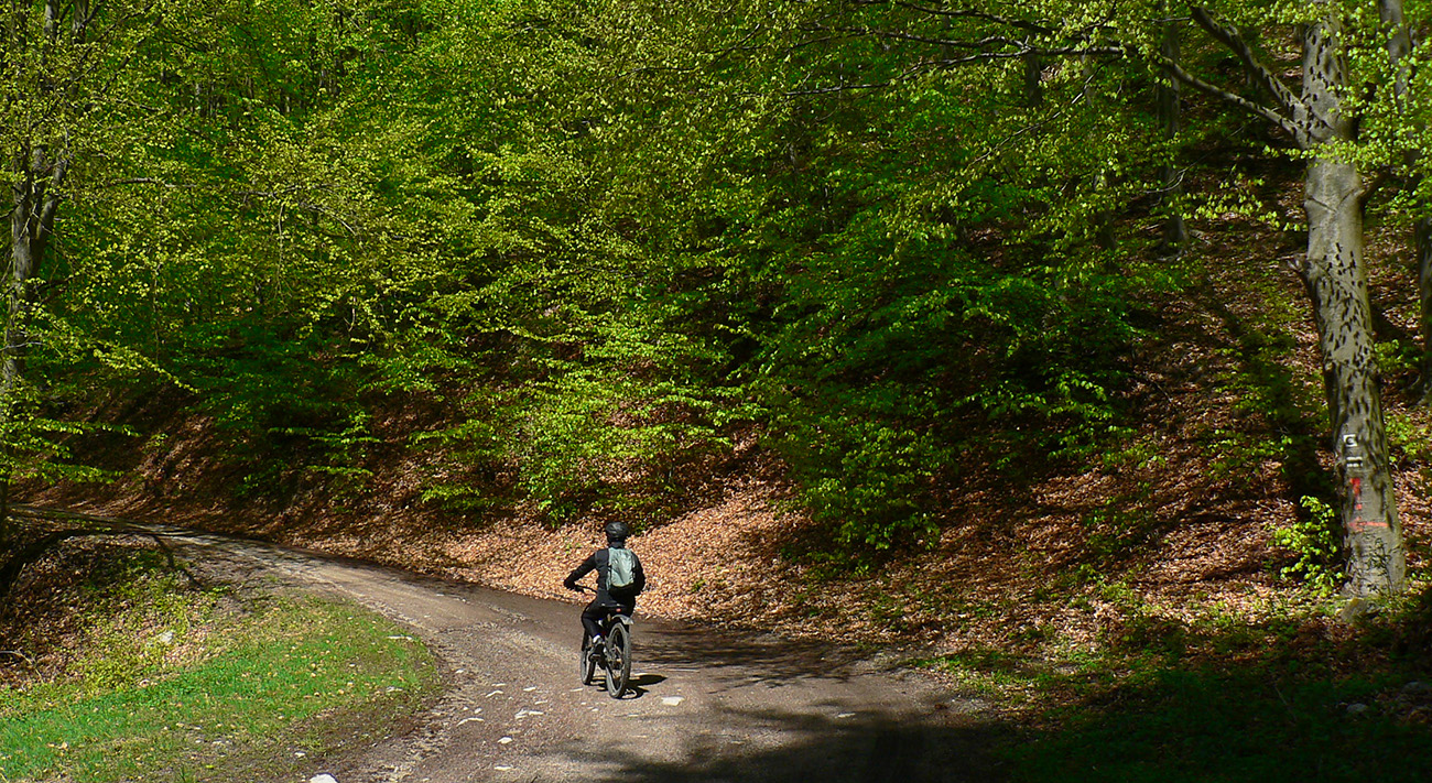 Zelená smerom hore na Štyri chotáre je najskôr dolinový asfalt – nový, aj pre žiletkárov paráda. Potom pekná, suchá, nerozbitá lesná cesta, perfektná pre gravel, mtb tam škoda drať. Akurát, že okolo mňa lietali zväčša celoodpružení „električkári“ :-) Aj tu sa nájdu zo dva výhľady – cez rúbane na juh a západ.