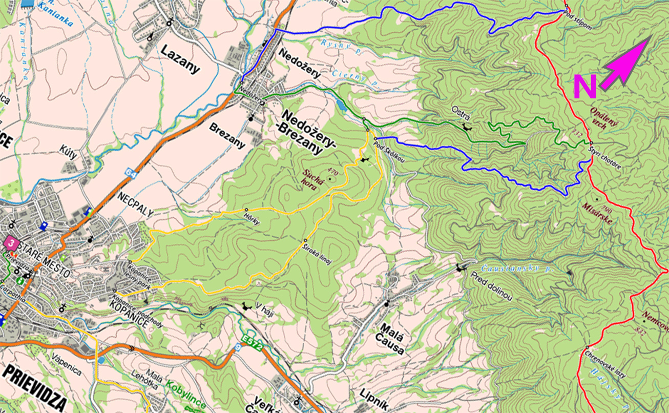 Kým nad severnými horami dovyčíňa studený front s prílevom posledných záchvevov tohoročnej zimy (aj keď už začal máj), treba sa posunúť viac na juh. A keď telo nevládze a na druhý deň ho čaká väčšia porcia kilometrov, netreba to preháňať s dĺžkou prechádzky ani s výškou nastúpaných metrov. Tak padá voľba na farebné (žlté, zelené a modré) chodníčky v severnom zázemí Prievidze, pekne v závetrí Žiaru. Najskôr teda lesoparkom po žltej do doliny Brezianskeho potoka, odtiaľ Kostolnou dolinou a jej západnými svahmi na hrebeň Žiaru na Štyri chotáre. Odtiaľ dolu po modrej (po druhej strane doliny) zase k potoku a doklus po lesnej ceste (znovu žltá) do lesoparku (ku kolkárni) na kofču. Ukázalo sa to ako dobrá voľba a je to super aj pre nenáročnú bajkovačku - a práve v tomto smere, lebo modrá je na dolnom konci trochu moc strmá na pohodový výšľap. Ale zjazdná.