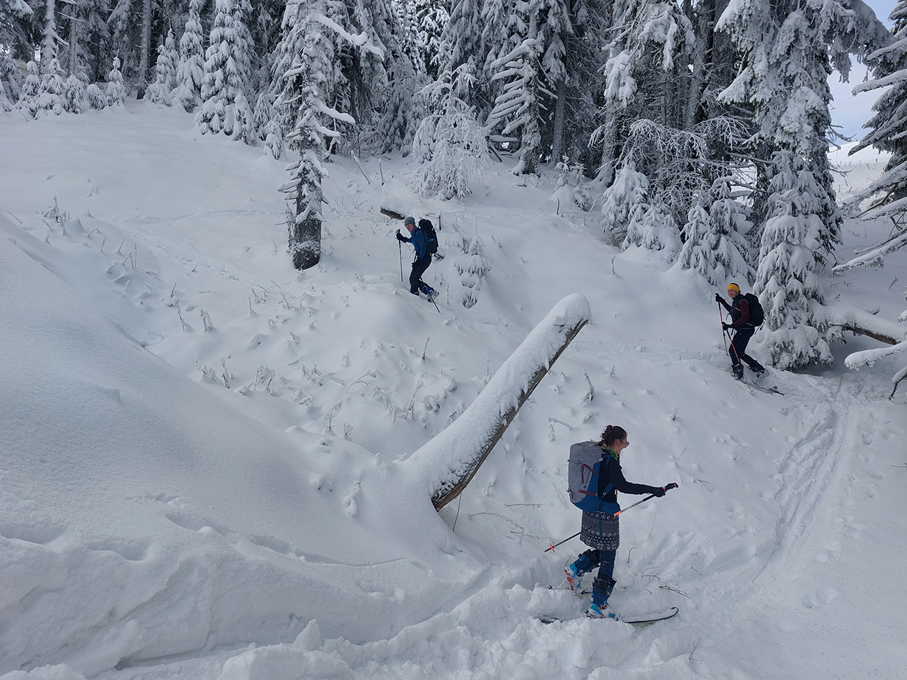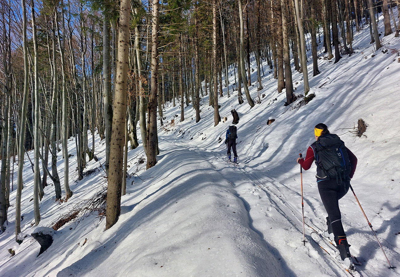 Taaak davaaj po zvážnici do záveru Čutkovskej doliny, že zdola obzrieme možnosti pod Nižným Šiprúnskym sedlom. Zvážnica komfortná, stopa hlboká, vyleštená, prechod cez pramenisko bezproblémový, snehom pekne prikrytý. Len popod padnutý strom sa bolo treba lepšie zohnúť. Alebo obísť.