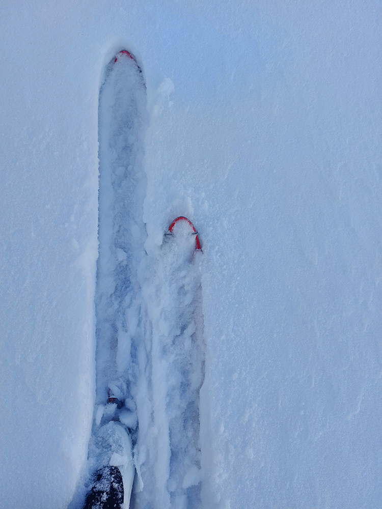 Potom už nazad skoro tak, ako sme prišli, len sme cestou ešte vyskúšali tú Paškovú – čiže z lúk pod Vtáčnikom zlyžovať do jamy záveru Trlenskej doliny. Ale tam už prášku minimum, skôr rodiaca sa kôrka. Nič moc. Tam ráno svietilo, no...