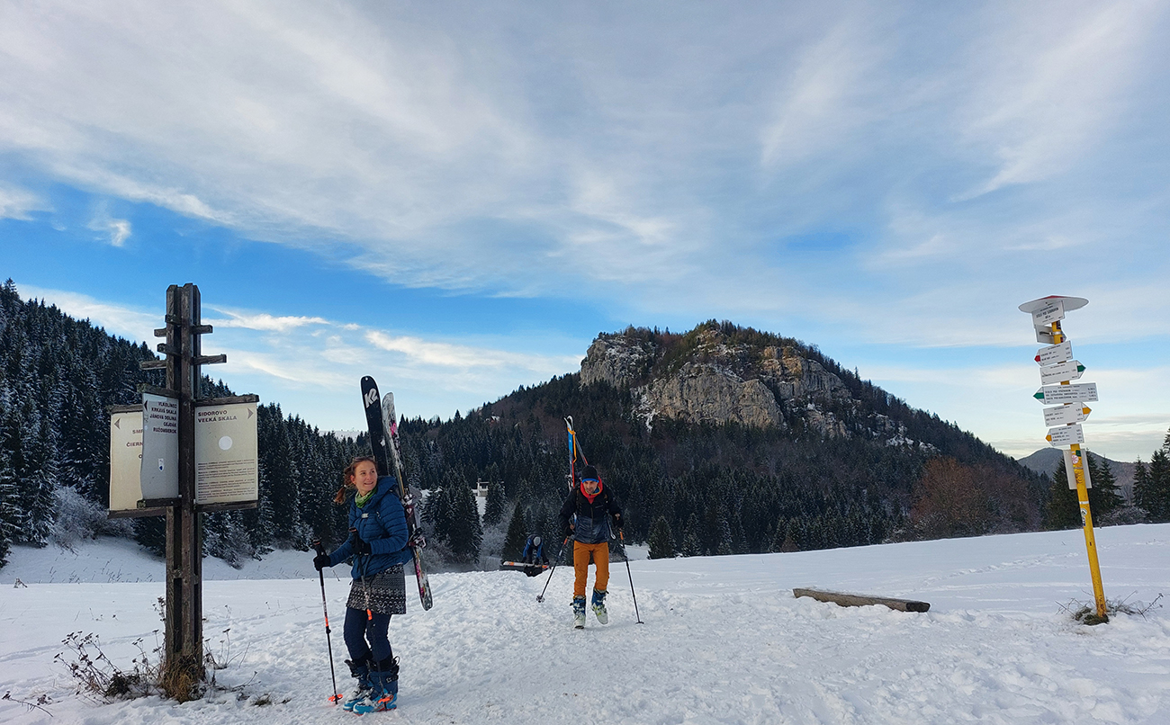 Haliny a Sidorovo na nás dohliadali pri nahadzovaní lyží na batoh, lebo po južnej stráni dole do Vlkolínca sa ani kameňačky riskovať neoplatilo. Ale zato veľkolepé výhľady na Nízke Tatry v diaľke a obielené strechy dreveníc pod nami – no čo viac si priať na rozchodenie do sezóny? Super to bolo a ďakujem modelkám za pózovanie!