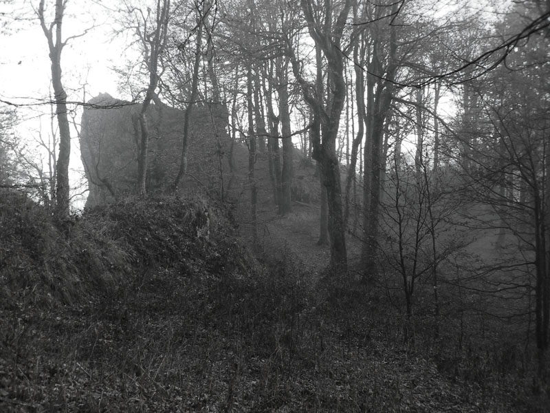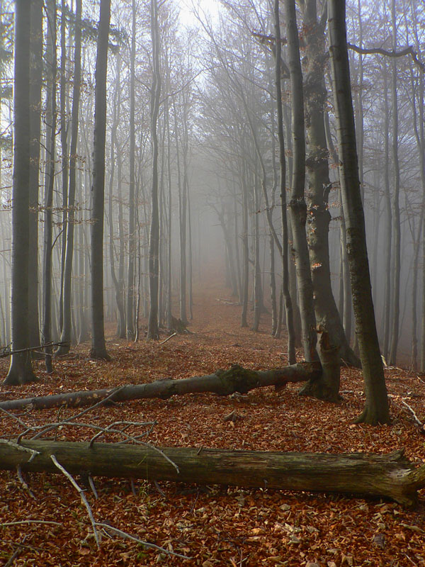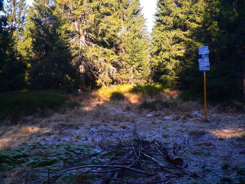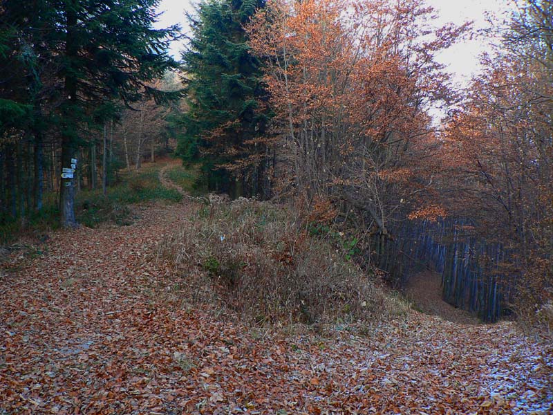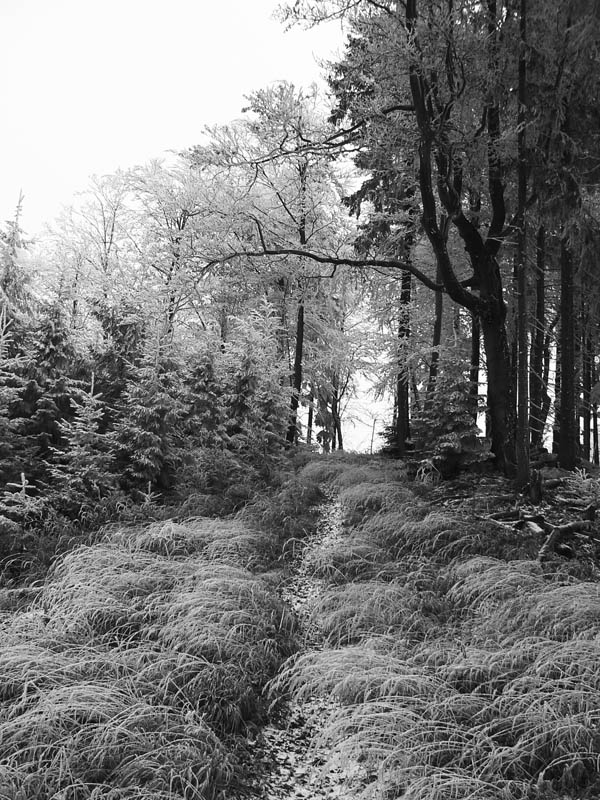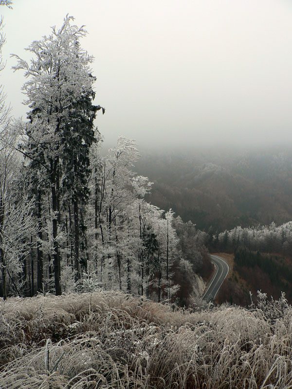 Paralelne s asfaltkou šliapem po (žlto značenej) lesnej ceste do sedla Malý Šturec. Tam tiež nič, nad hlavou furt bielo, okolo len omrznuté stromy – znak toho že sa mraky v noci dvihli. Ale čo už teraz - pokračujem po červenej. Tento nástup na hrebeňovku nie je bohvieako využívaný, zo stanice sa viac chodí po modrej priamo na Flochovú. Aj preto že žltá, ktorou som do sedla prišiel, donedávna ešte nebola. Chodník medzi sedlami Šturec a Turecká cesta aj tak vyzerá – poriadne zarastený na viacerých miestach. Pri predieraní mladinou otriasam hrubú námrazu a o chvíľu už som aj ja riadne zasrienený. Ešte že je to suché... Na tomto úseku sa striedajú krátke a strmé stúpania a klesania, nepríjemné v tejto ročnej dobe mohutnou vrstvou bukového lístia, pod ktorou je ktovie čo. Aj hlina je mrazom dobre skyprená, prepadá sa a šmýka sa na nej. Na prvom úseku sú aké – také výhľady na asfaltku a do Zalámanej doliny, potom už len les.