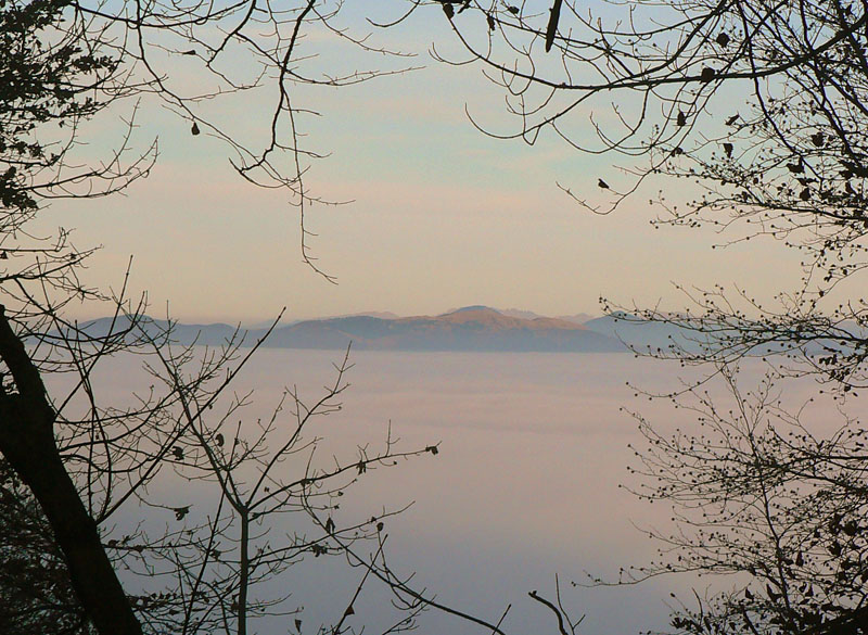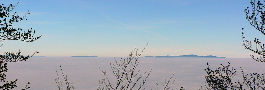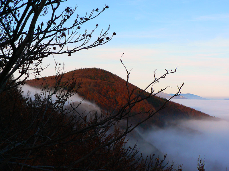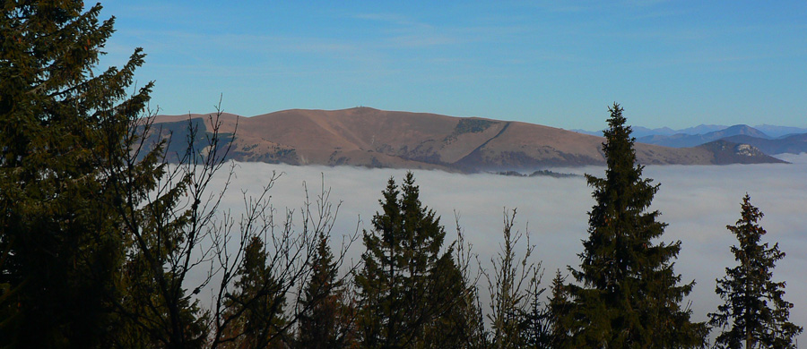 Aj je, na lesných cestách medzi Flochovou a Vyhnátovou si vychutnávam hru svetla s hmlou pomedzi stromy. Niekde zbehnem do hmly, niekde sa dostávam nad ňu a podľa toho poriadne skáče aj teplota. Na Vyhnátovej som síce vyššie, ale musím na strom, aby som mal výhľad na Skalku. Oplatí sa: na kremnickej strane sú mraky trochu vyššie a celé sa to cez sedlá prelieva na stranu bystrickú. Z južnej časti hrebeňa trčia len ostrovy, čím viac na juh, tým menšie. Krása, ani sa mi dolu nechce.