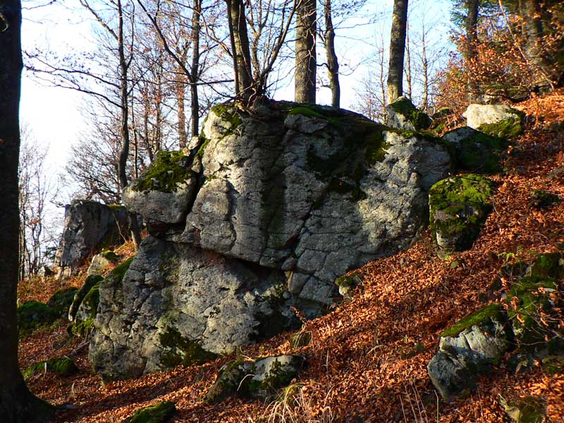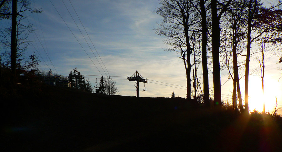 Sedlo Turecká cesta je len taký zárez v hrebeni, prepája zvážnice na oboch jeho stranách – toto isto na jar preverím na bajku. Cez zvalené stromy bude treba síce prenášať, ale to je chvíľka. Zato červená hrebeňovka je nebajkovateľná, aj tlačiť by tu bol problém. Na rozdiel od lyžiarskych ciest od Flochovej na juh. Finálne prudké stúpanie na plošinu Flochovej a čo to? Slnko presvitá, žeby som sa predsa dnes aj nad mraky dostal? Je to tak, super! Zo skaliek pod vrcholom stúpania je nádherný výhľad na Krížnu, Majerova skala ledva trčí z mrakov, z Panského dielu vidno len vysielače. Čiže horná hranica mrakov dnes = 1100m, bude to tesné!