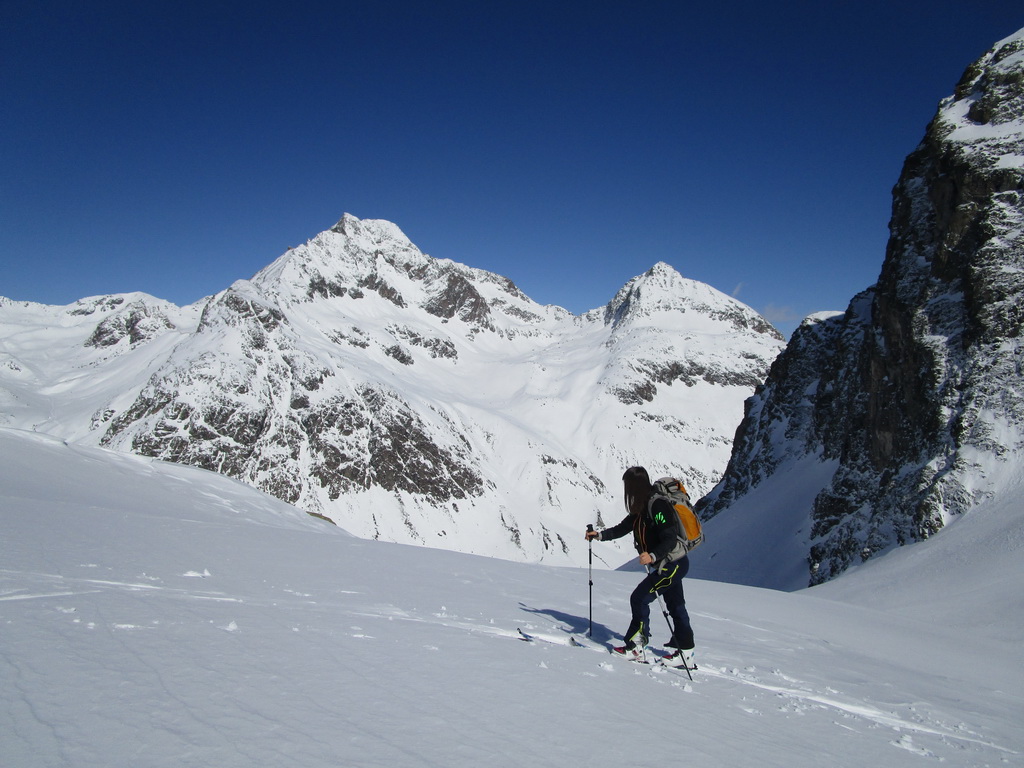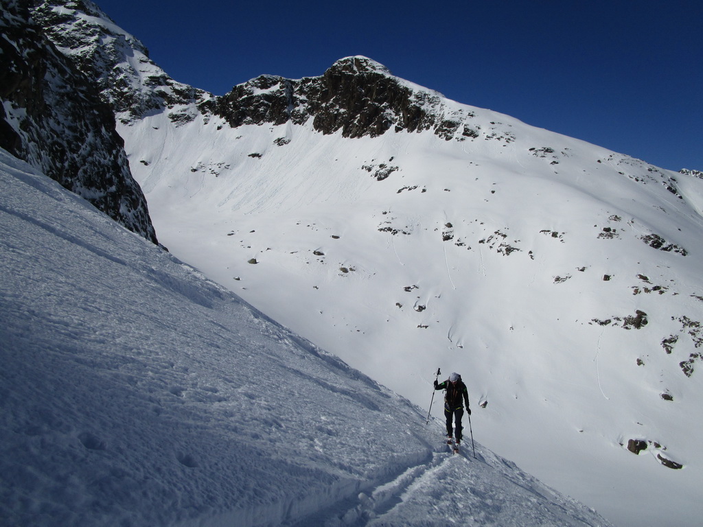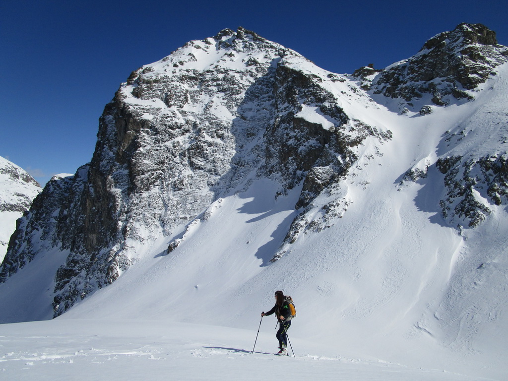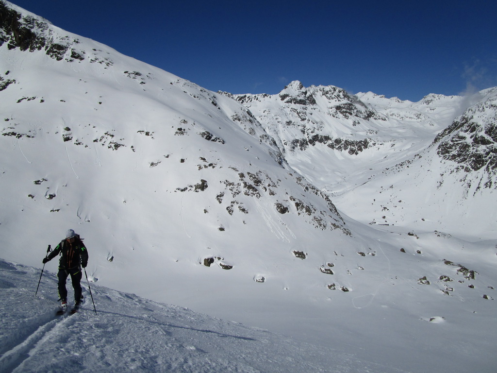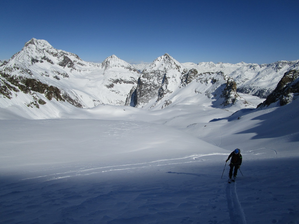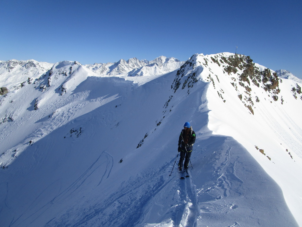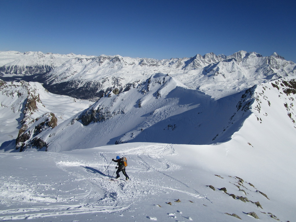 V druhej časi výstupu sa pod vrcholovým hrebeňom rozprestiera široká pláň. Pre lyžiarov je to veľa možností a tak aj pri ich väčšom množstve si stále nájdete miesto pre svoju stopu. Výstupová dolinka s nasledujúcim kotlom ponúka aj alterantívne možnosti ktoré sú ale veľmi málo využívané. Pod článkom si nájdete aj odklik na túru s výstupmi na Polaschin a Coluonas v kombinácii s lyž. vrcholom Lagrevu.