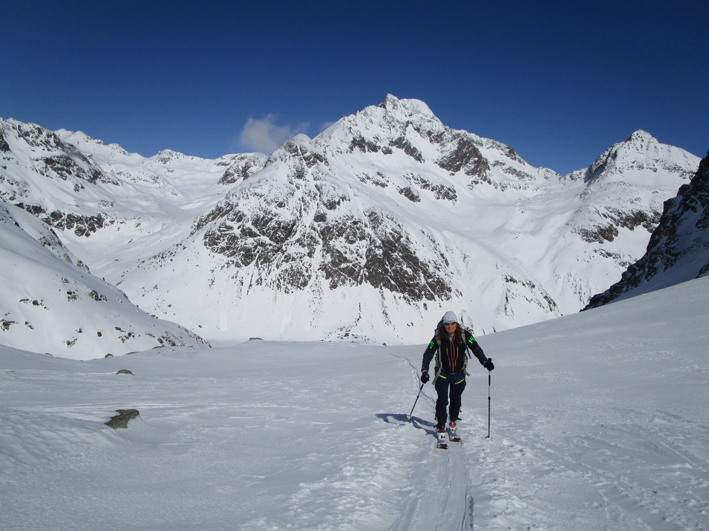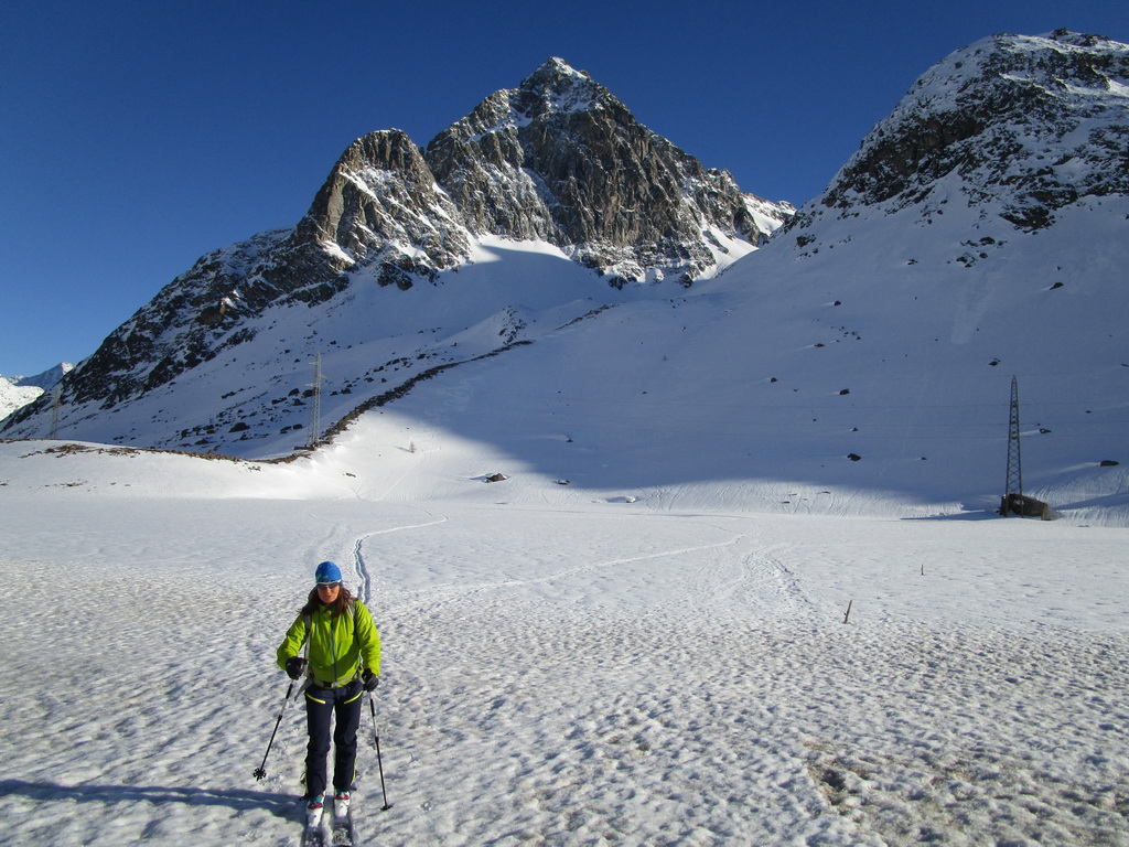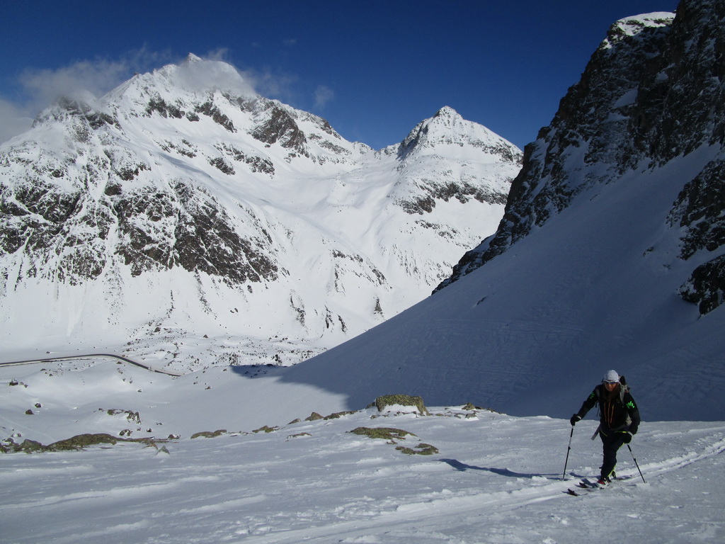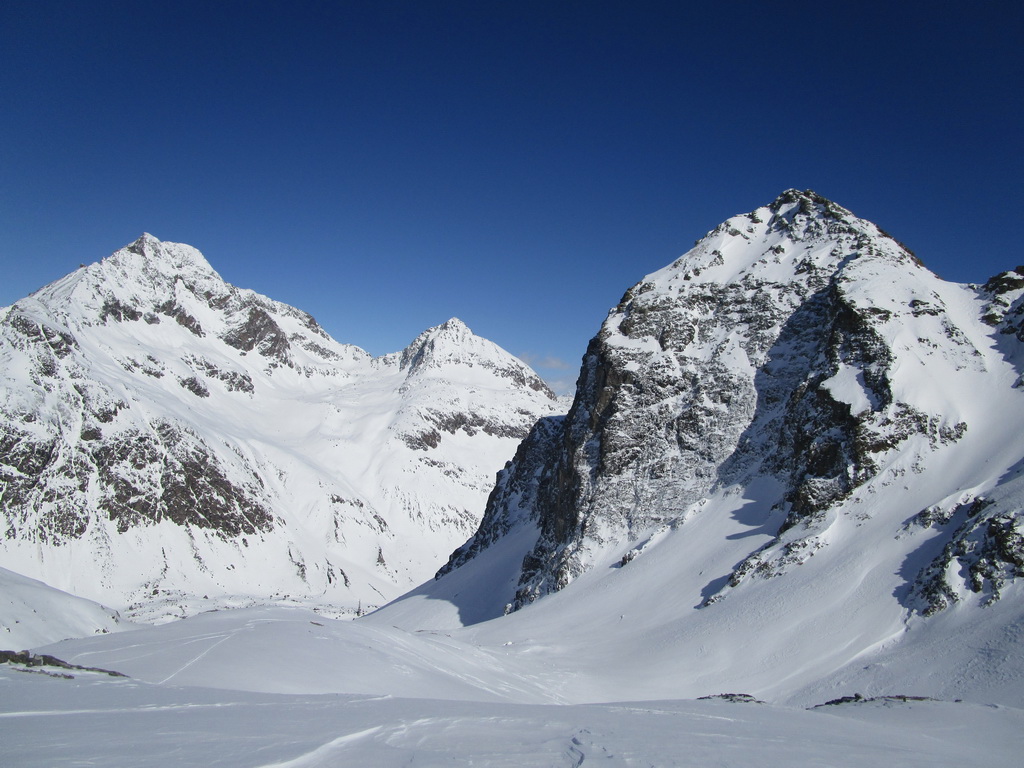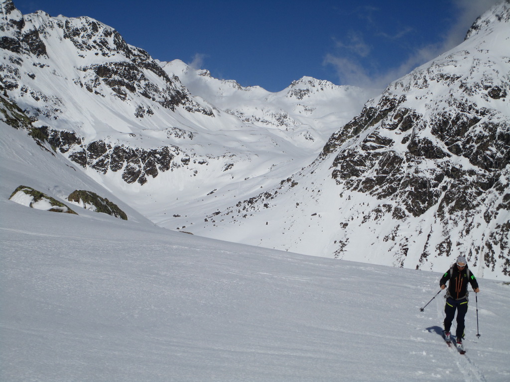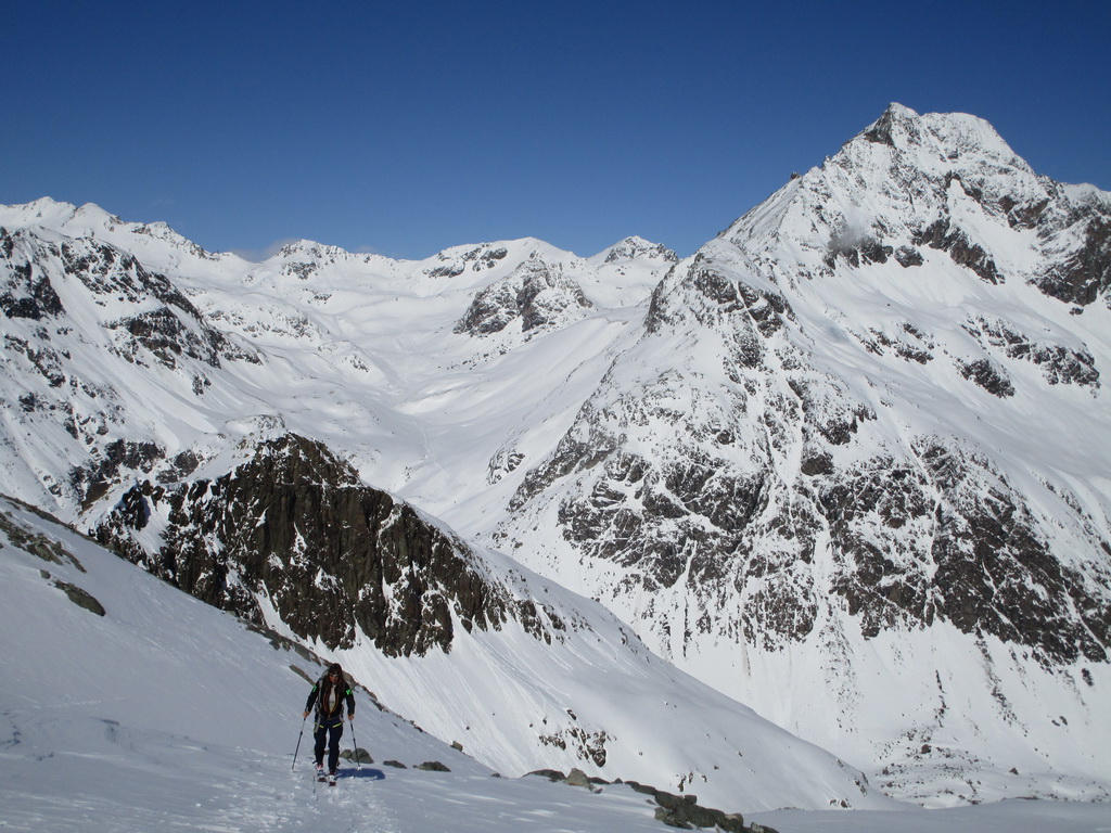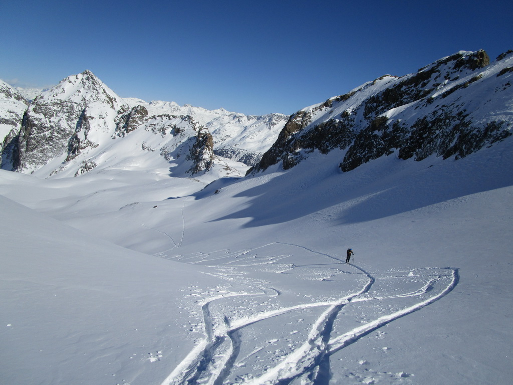 V druhej časi výstupu sa pod vrcholovým hrebeňom rozprestiera široká pláň. Pre lyžiarov je to veľa možností a tak aj pri ich väčšom množstve si stále nájdete miesto pre svoju stopu. Výstupová dolinka s nasledujúcim kotlom ponúka aj alterantívne možnosti ktoré sú ale veľmi málo využívané. Pod článkom si nájdete aj odklik na túru s výstupmi na Polaschin a Coluonas v kombinácii s lyž. vrcholom Lagrevu.