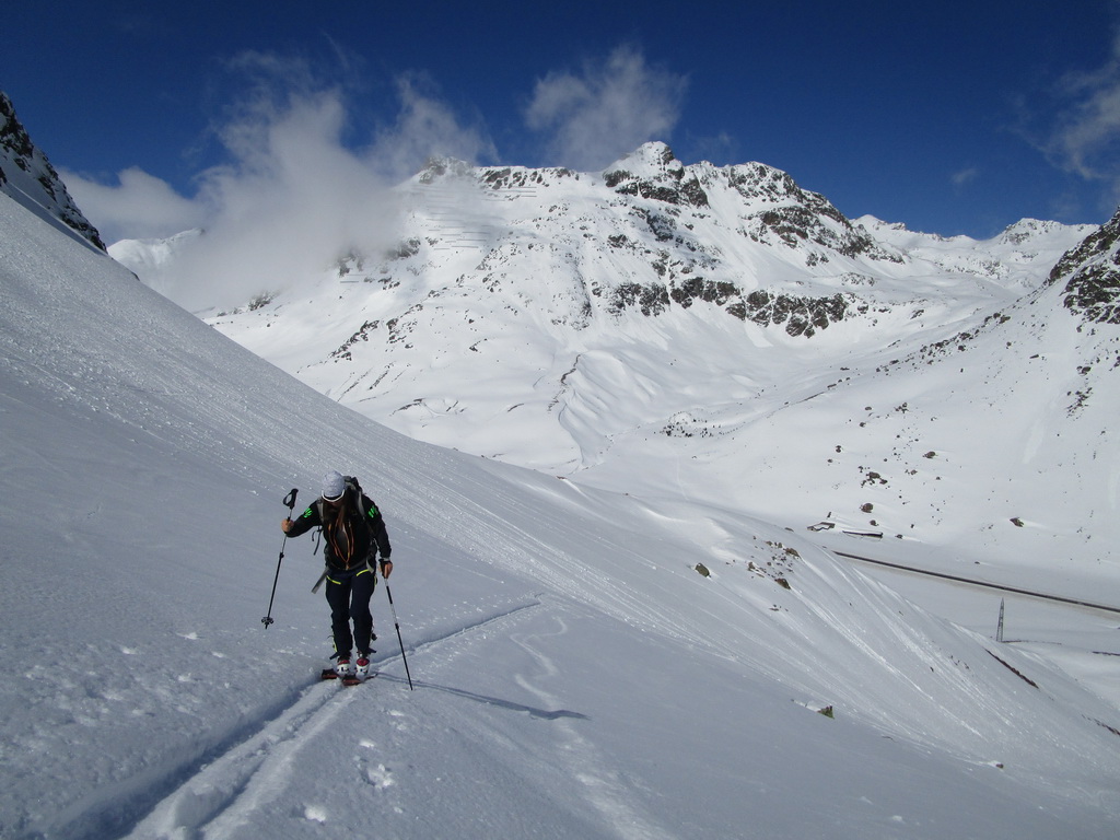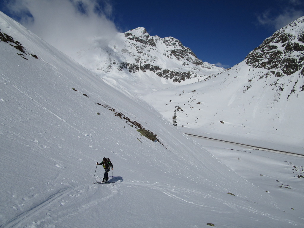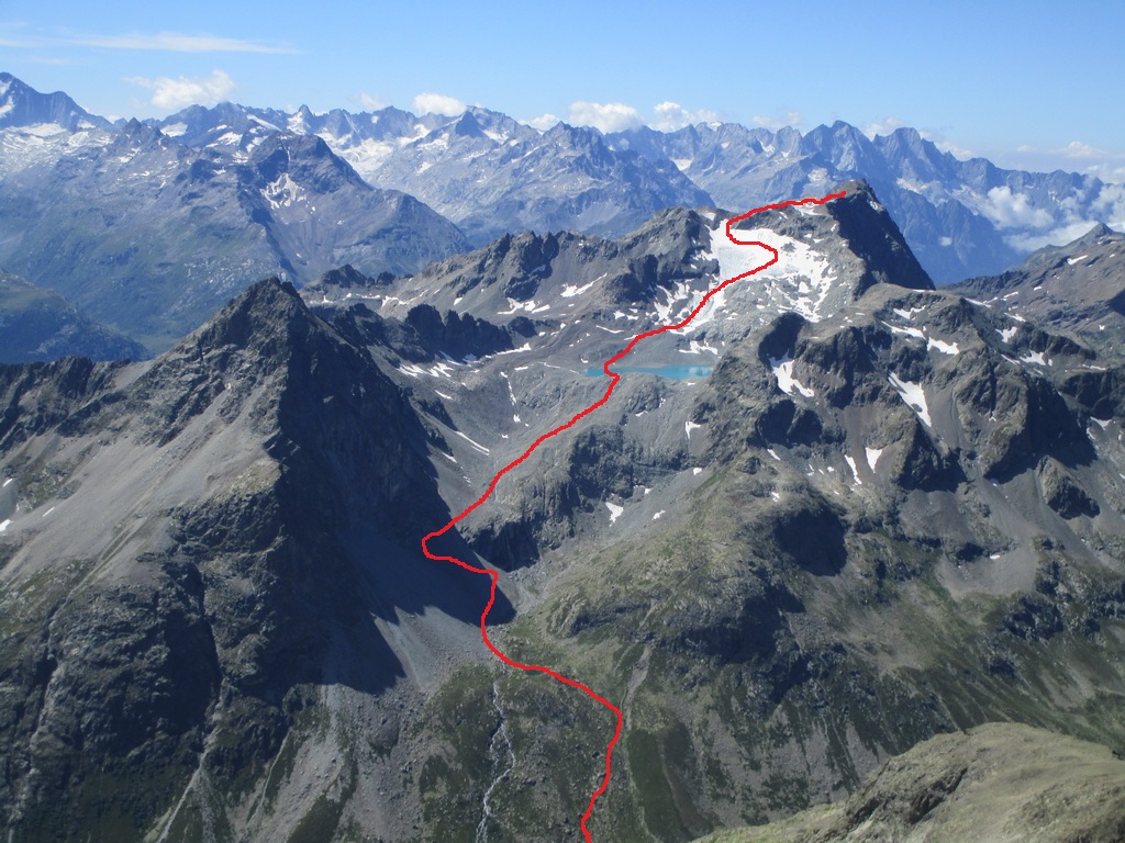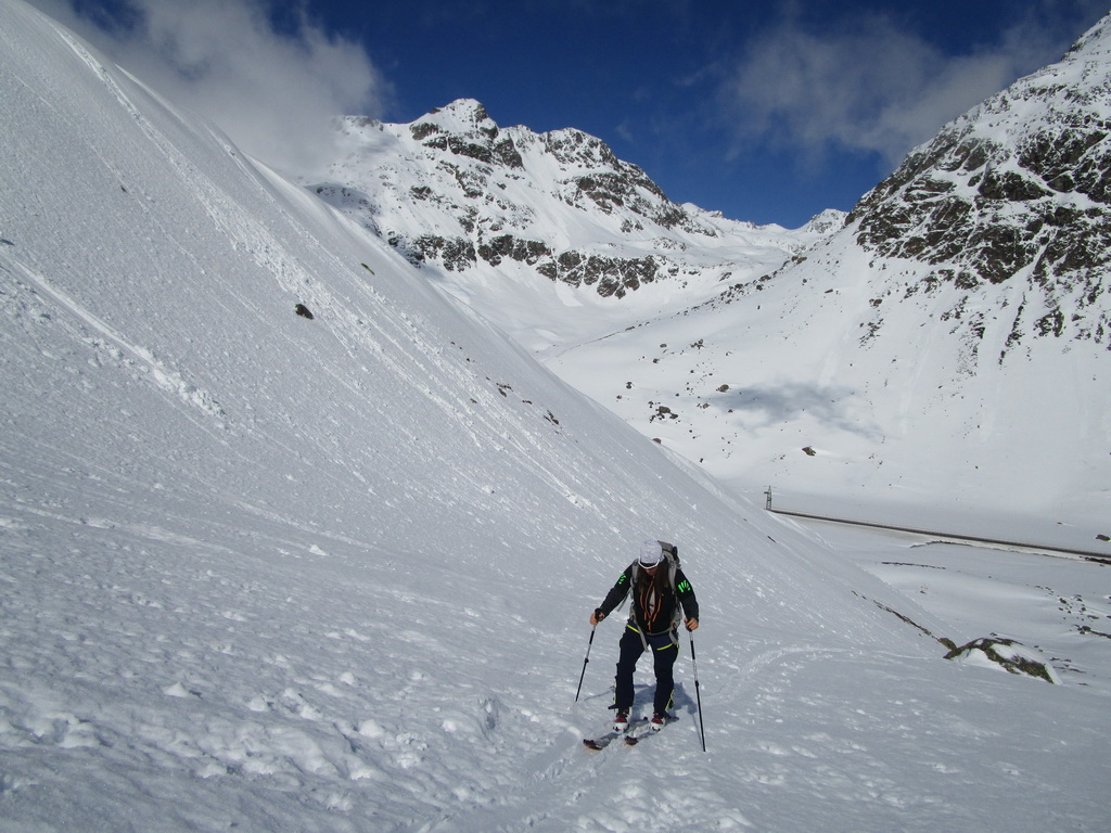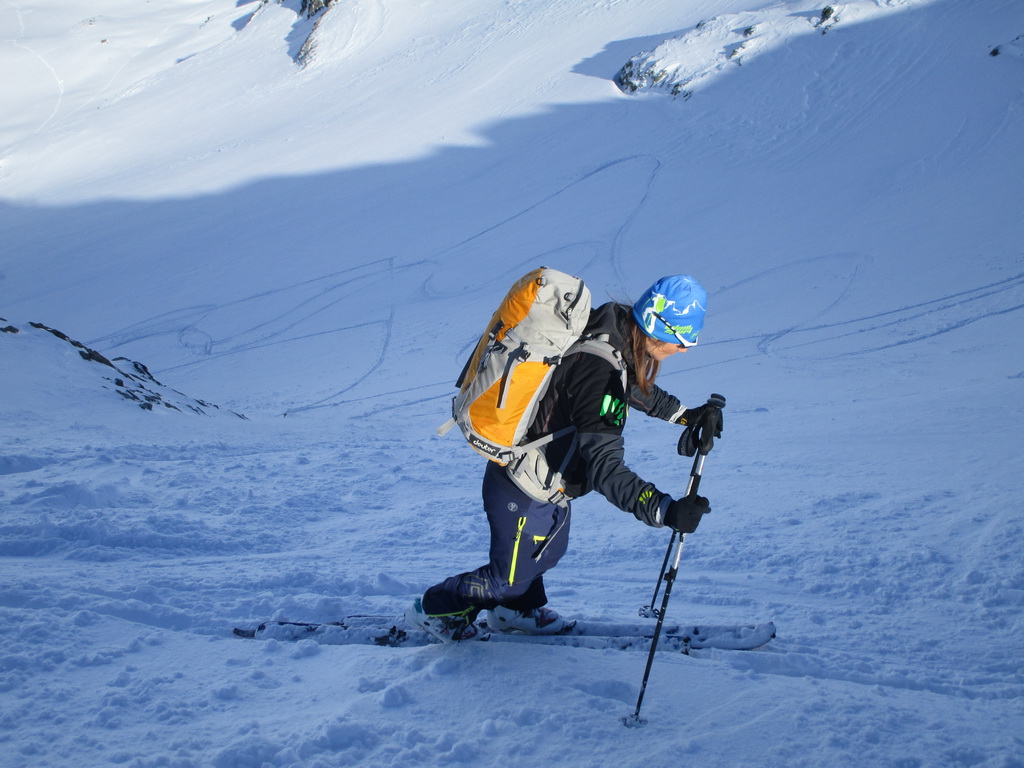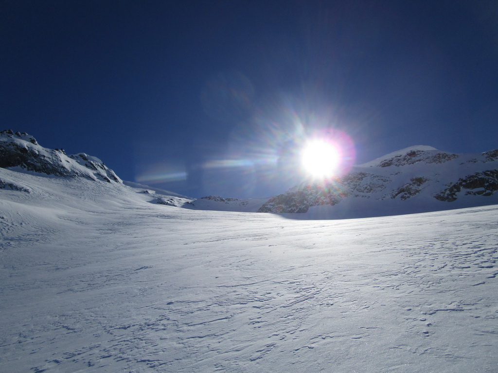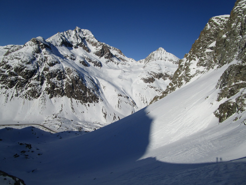 V druhej časi výstupu sa pod vrcholovým hrebeňom rozprestiera široká pláň. Pre lyžiarov je to veľa možností a tak aj pri ich väčšom množstve si stále nájdete miesto pre svoju stopu. Výstupová dolinka s nasledujúcim kotlom ponúka aj alterantívne možnosti ktoré sú ale veľmi málo využívané. Pod článkom si nájdete aj odklik na túru s výstupmi na Polaschin a Coluonas v kombinácii s lyž. vrcholom Lagrevu.