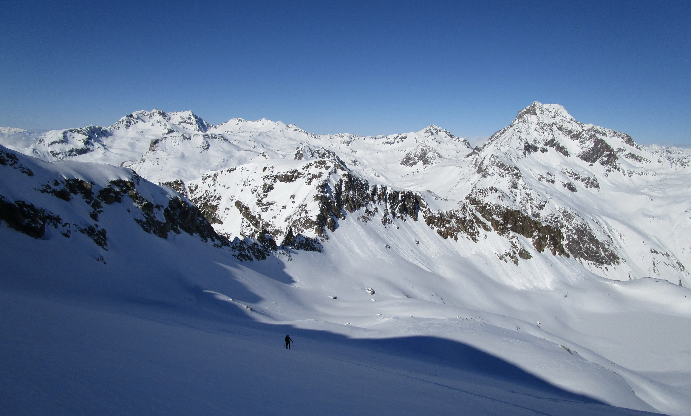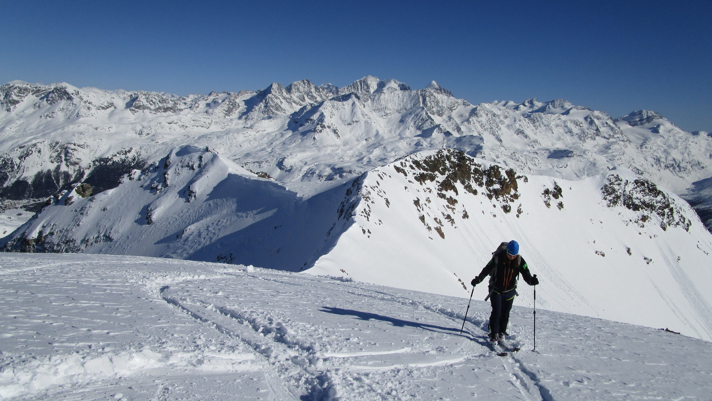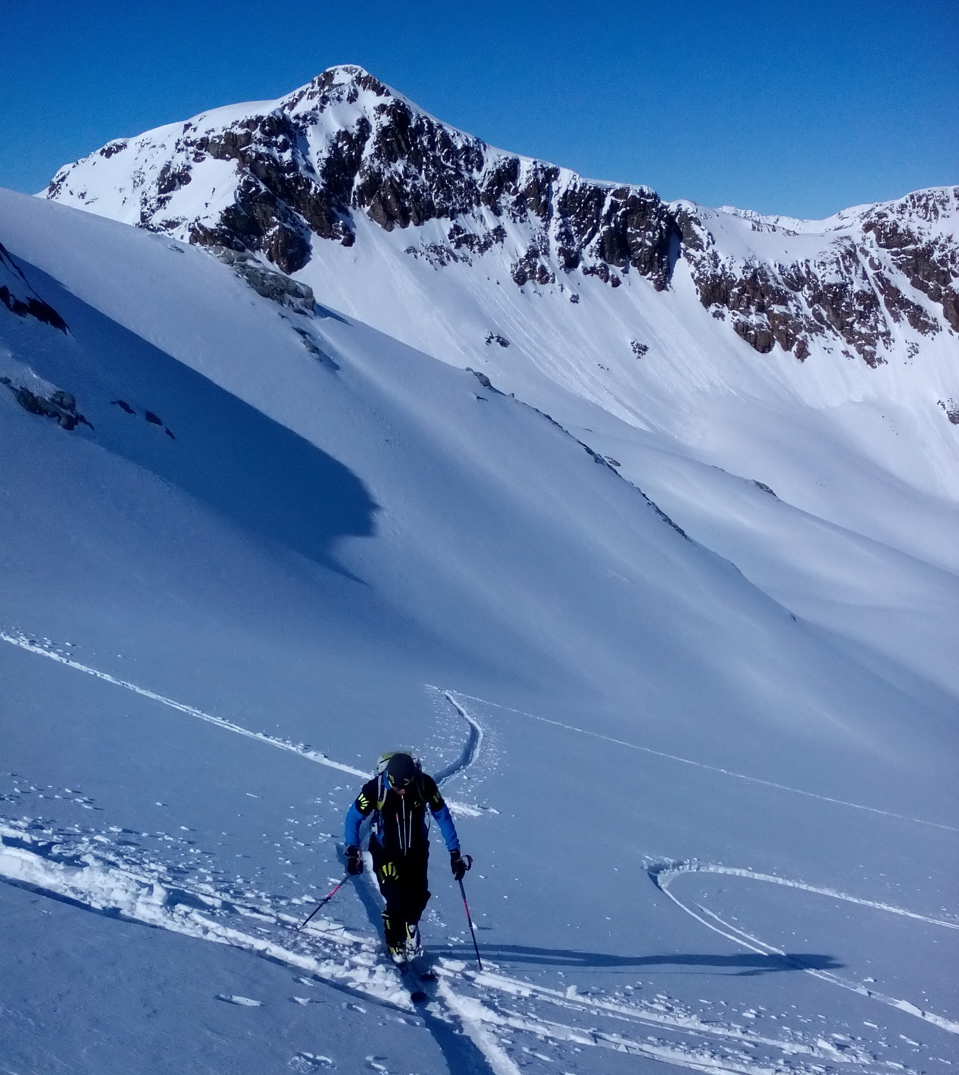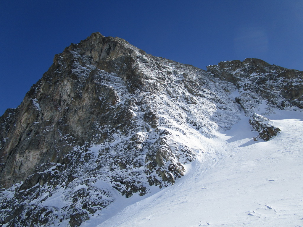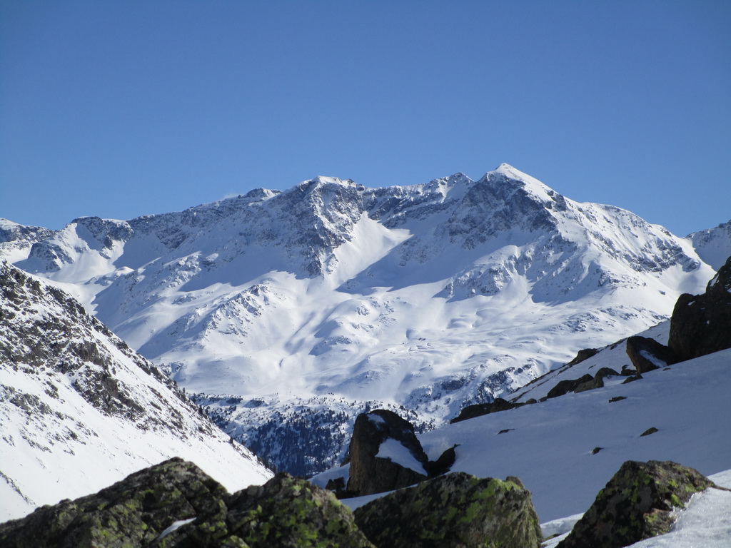 V druhej časi výstupu sa pod vrcholovým hrebeňom rozprestiera široká pláň. Pre lyžiarov je to veľa možností a tak aj pri ich väčšom množstve si stále nájdete miesto pre svoju stopu. Výstupová dolinka s nasledujúcim kotlom ponúka aj alterantívne možnosti ktoré sú ale veľmi málo využívané. Pod článkom si nájdete aj odklik na túru s výstupmi na Polaschin a Coluonas v kombinácii s lyž. vrcholom Lagrevu.
