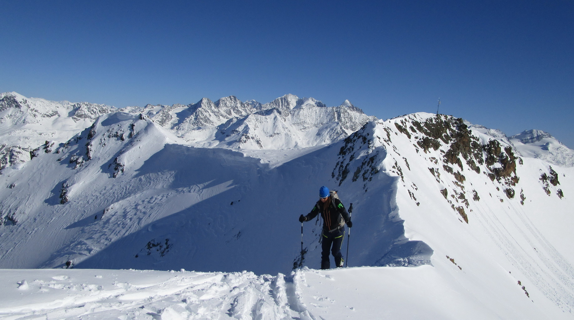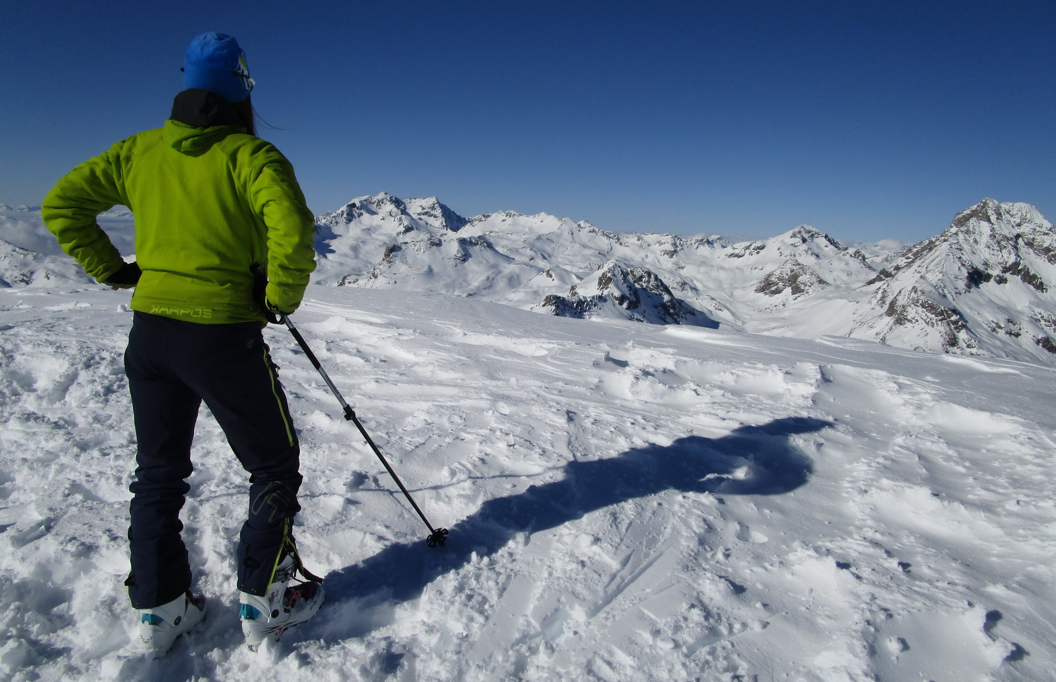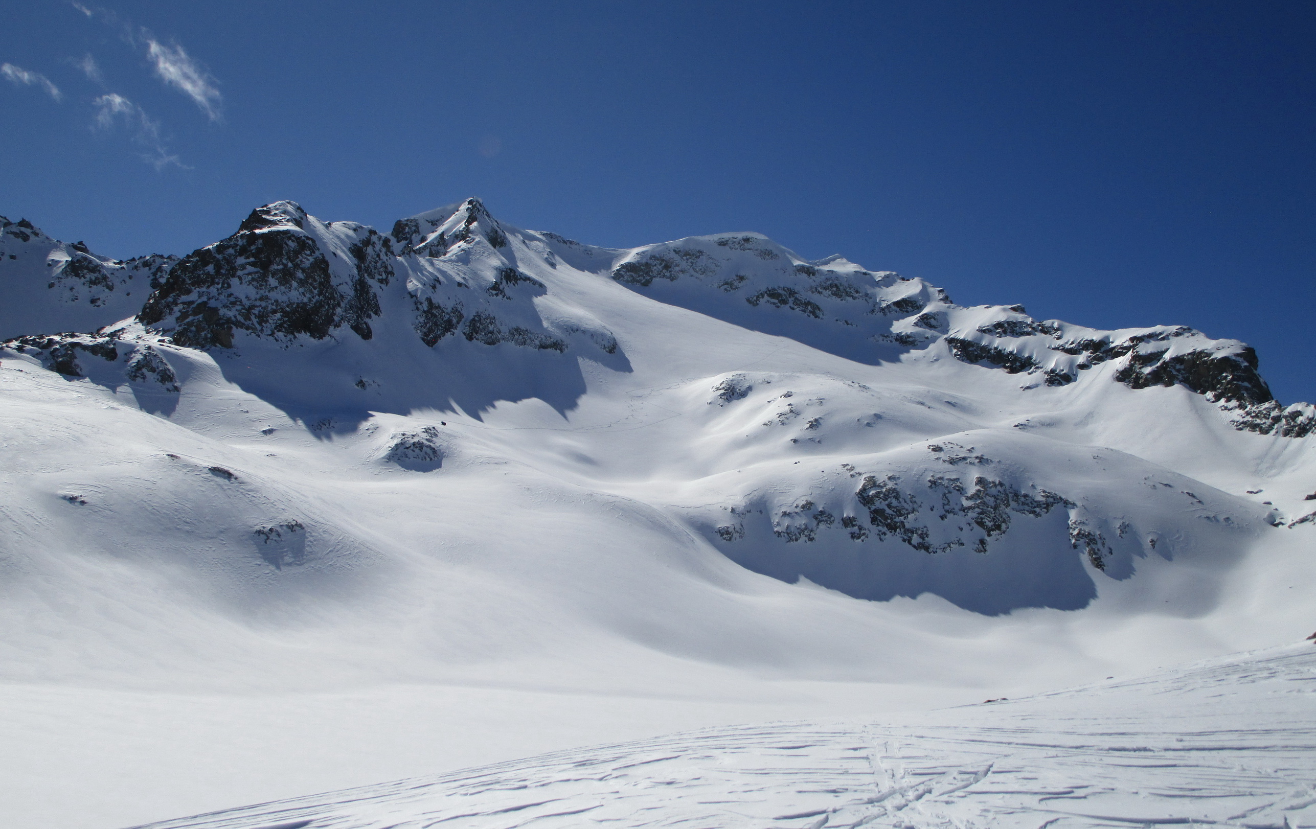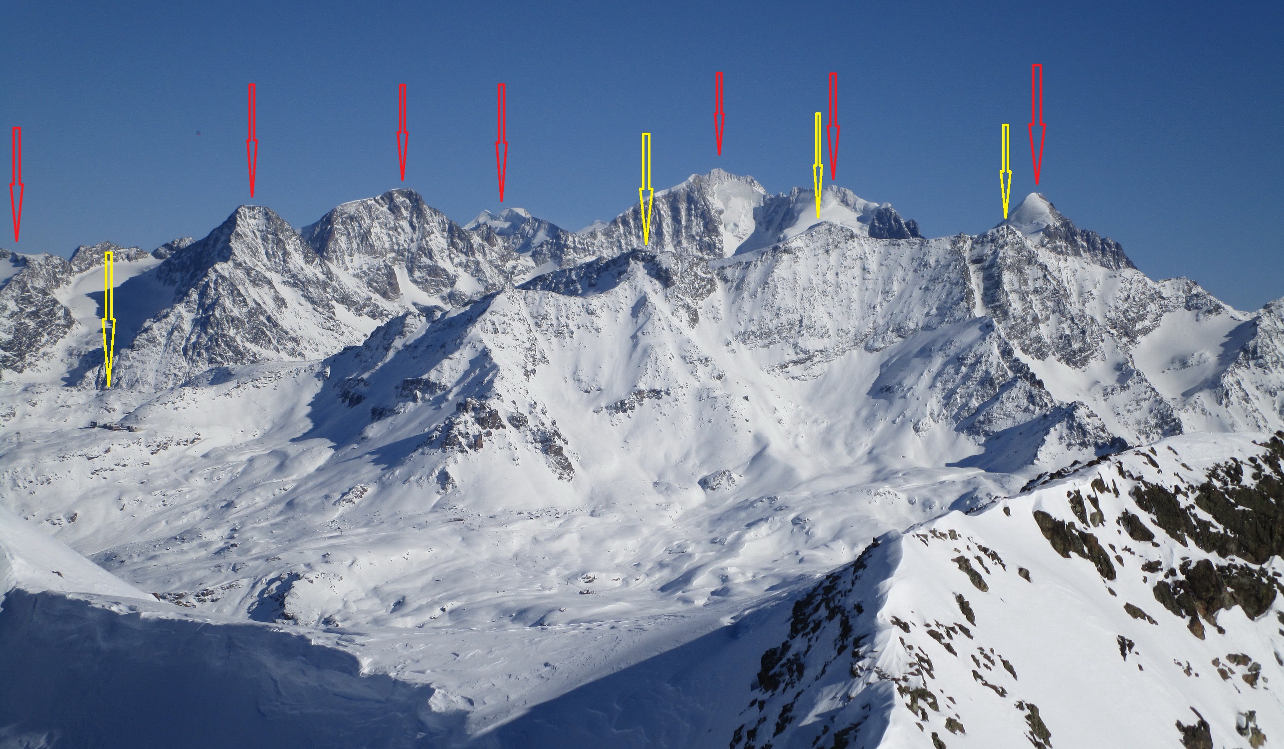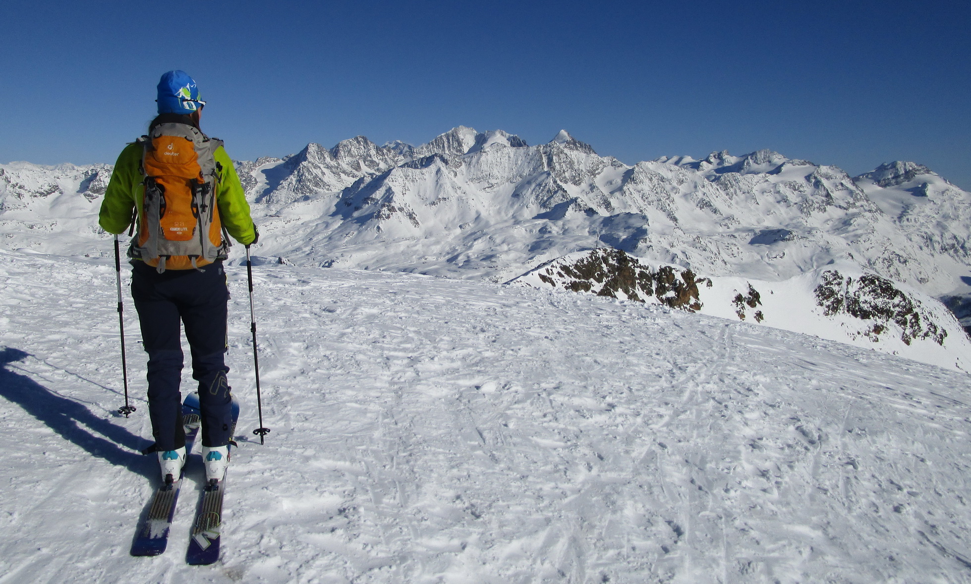 V druhej časi výstupu sa pod vrcholovým hrebeňom rozprestiera široká pláň. Pre lyžiarov je to veľa možností a tak aj pri ich väčšom množstve si stále nájdete miesto pre svoju stopu. Výstupová dolinka s nasledujúcim kotlom ponúka aj alterantívne možnosti ktoré sú ale veľmi málo využívané. Pod článkom si nájdete aj odklik na túru s výstupmi na Polaschin a Coluonas v kombinácii s lyž. vrcholom Lagrevu.