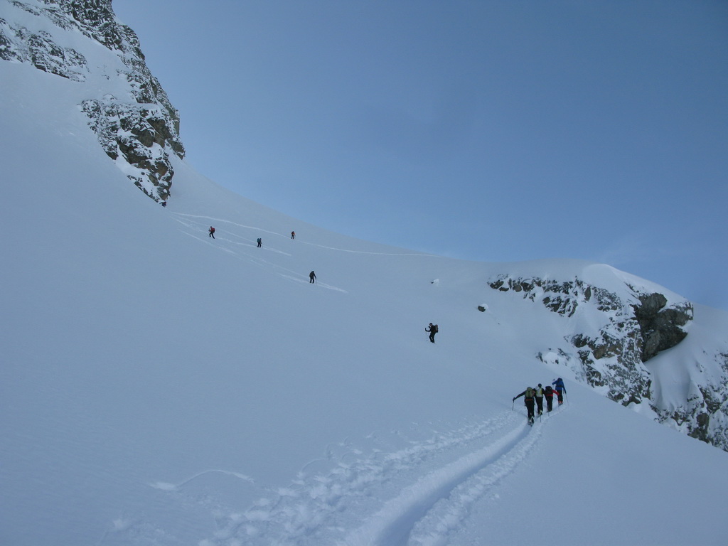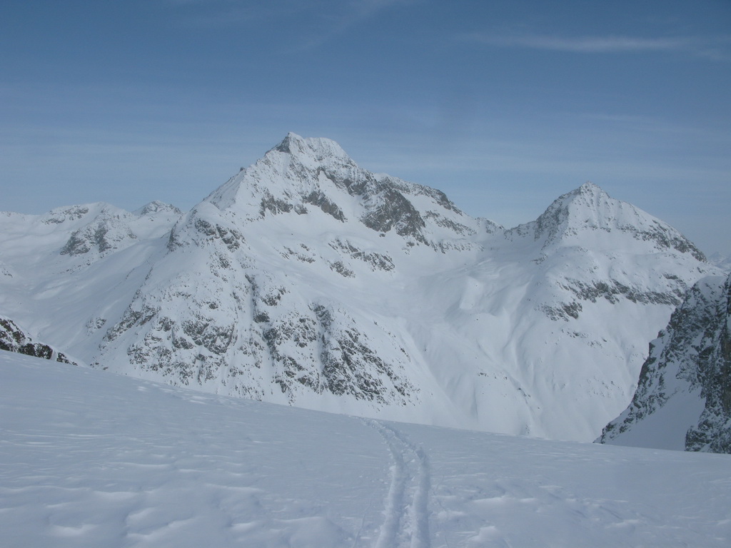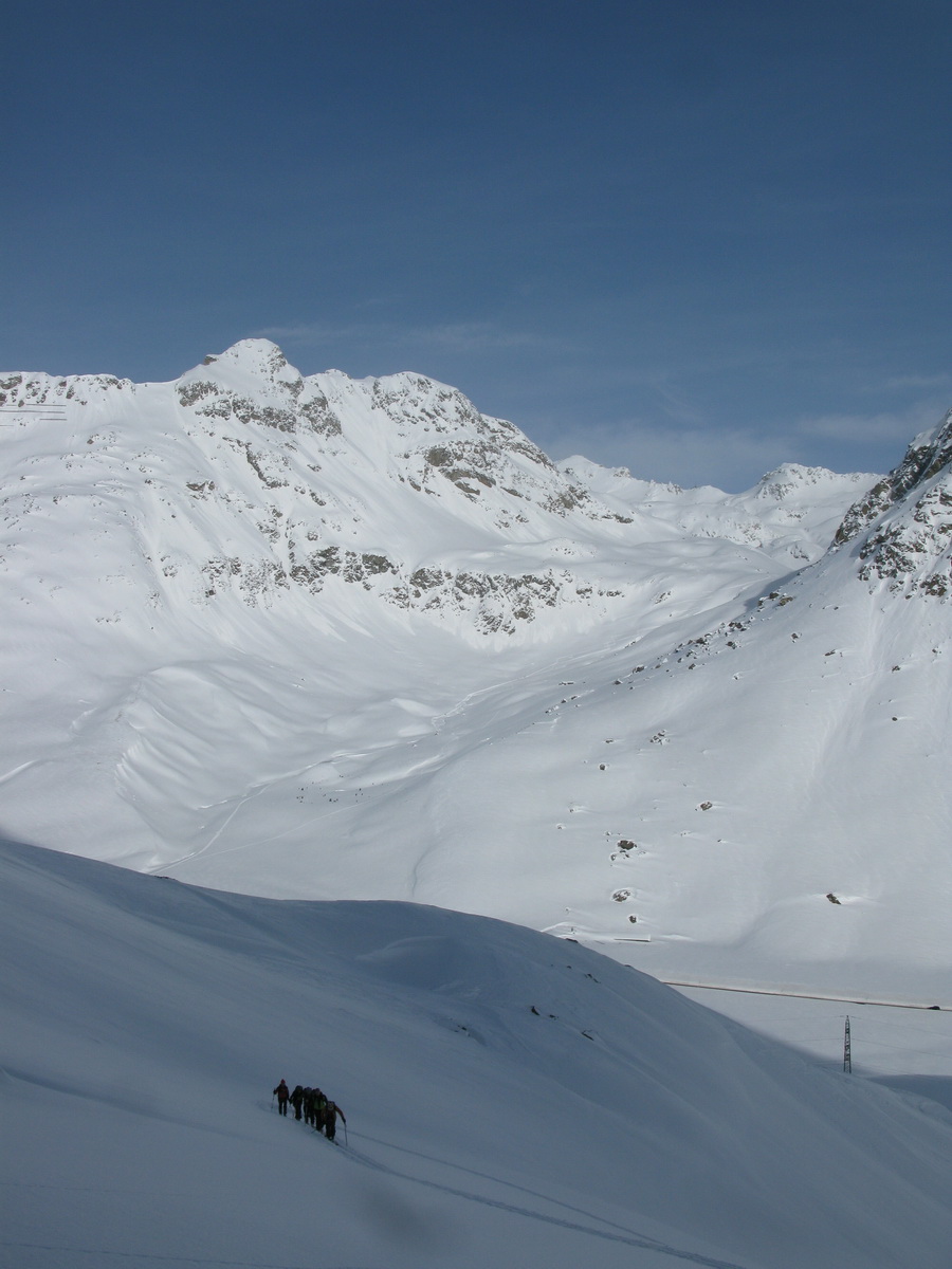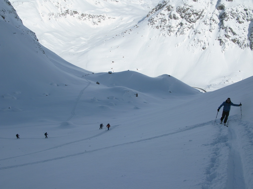 Hneď od parkoviska na mieste zvanom Alp Guglia sa začína terén dvíhať a stopa vedie popri veľkých balvanoch svahom hore. Nasleduje traverz vľavo, až prídete na úpätie Piz Polaschin a tu sa serpentínami stopa tlačí doprava hore. Pokračuje sa miernym chrbtom hore, až sa ocitnete v prostriedku kotlovitej doliny. Niečo tu chýba... Áno, z ľadovca už veľa neostalo, ale aj tak ten zvyšok tvorí prírodne chladenú zjazdovku, po ktorej sa dostanete až do sedla k malej meteorologickej stanici. Tu pre mnohých túra končí. Za dobrých podmienok sa dá pod sedielkom ísť viac vpravo na hrebeň a po ňom na vrchol. Aj podľa sprievodcu tu lyžiarska túra zvykne končiť. Po hrebeni sa však dá pokračovať ďalej. Pozor ale, všade sú nebezpečné preveje. Západná stena je vysoká a kolmá!