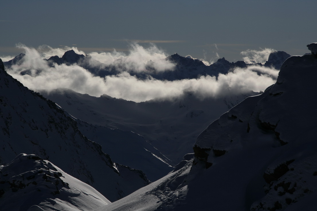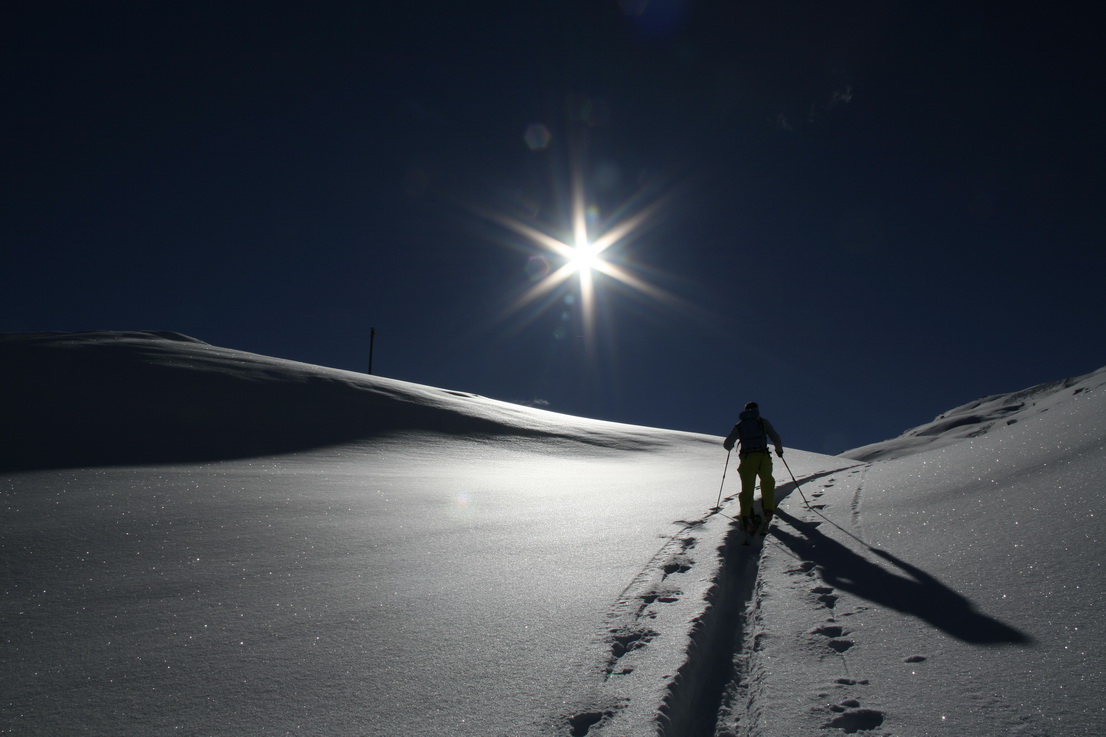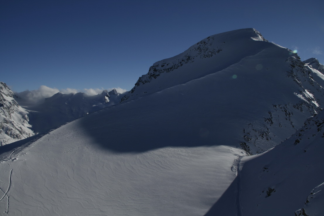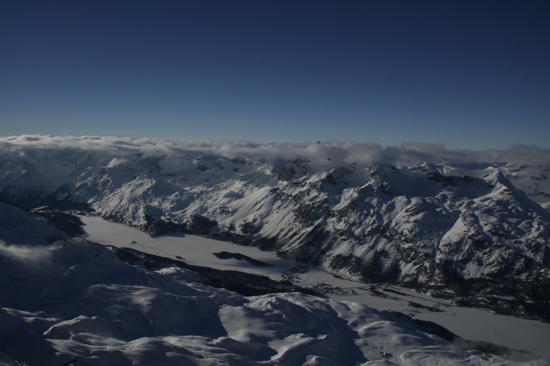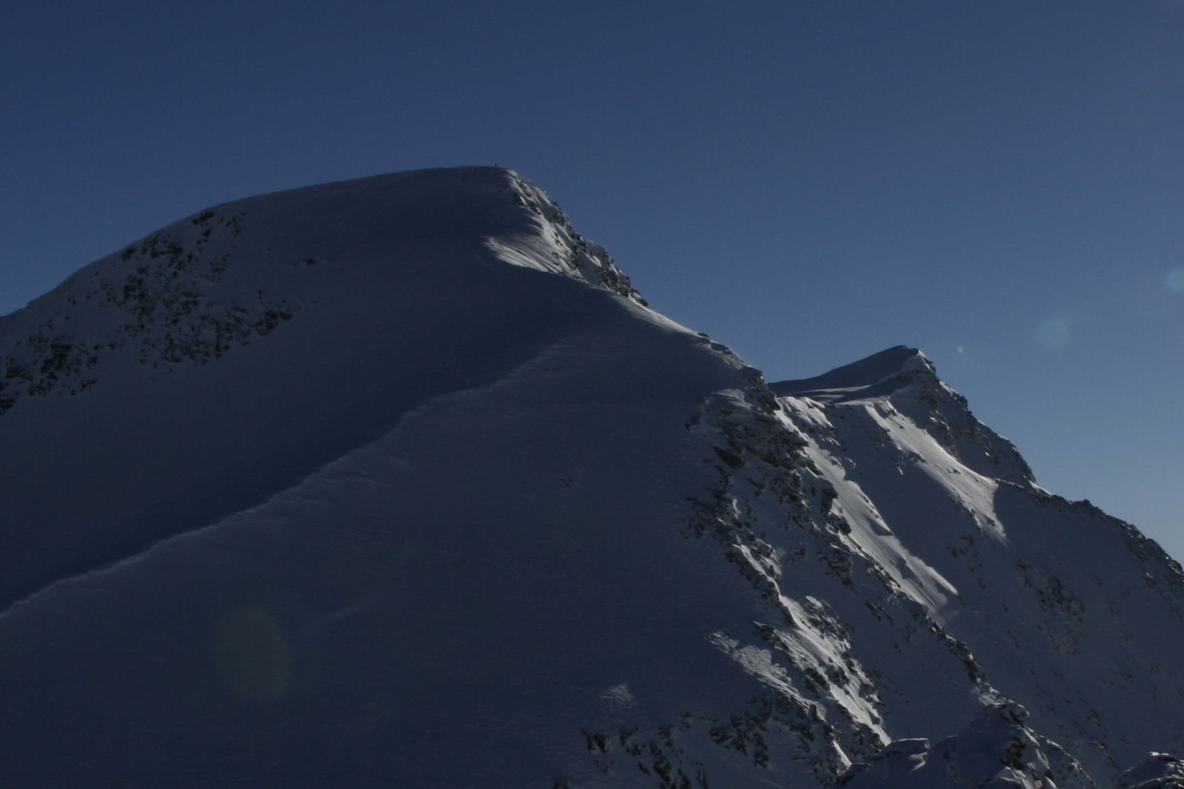 Výstup: samotný výstup v podstate začína až pod Bergstationom. Niektorí skialpinisti sa zrejme nechajú vyviezť lanovkou zo St.Moritzu až sem, niektorí vraj chodia z medzistanice na začiatku zimy. Šlapú po zjazdovke a tu sa z nej odpoja. Výstup tu vedie najprv len mierne naklonenou bielou pláňou, neskôr sa už svah pristrmuje. Tu som sa už serpentínkami dostal na hrebeň, dobre viditeľný na fotkách z Bergstationu. Po ňom som na lyžiach vyšiel až na vrchol Murtel. Tu som lyže zobul, pokračujúci klesajúci hrebeň bol vyfúkaný, ale nebolo treba na zostup použiť mačky, tak som s lyžami v rukách zbehol asi sto metrov dole na bielu pláň.