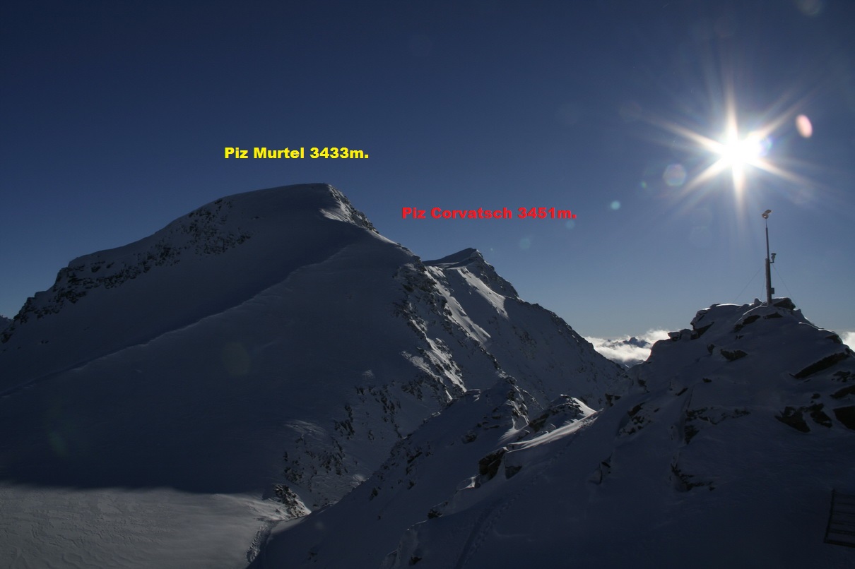 Piz Murtel 3433m a Piz Corvatsch 3451m sa nachádzajú v horskom hrebeni, v ktorom sa nachádza aj už spomínaný Caputschin a ktorý sa potom napája na hrebeň Sella. Oba tieto kopce ponúkajú skvelý kruhový výhľad na nekonečné more hôr. Okrem výborného výhľadu na Berninu a okolie si tu vychutnáte výhľady na juh Monte Disgrazia, na západ Piz Lagrev, severozápad Piz Kesch a na severe výhľady zakončí hrebeň Languard - Muragl.