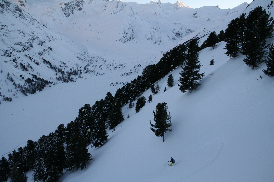 Potom už nasledovalo krásnych pekne cez 1000 výškových metrov zjazdu nepojazdeným prašanom dole do Val Roseg. Miestami toho snehu bolo až moc veľa :)
