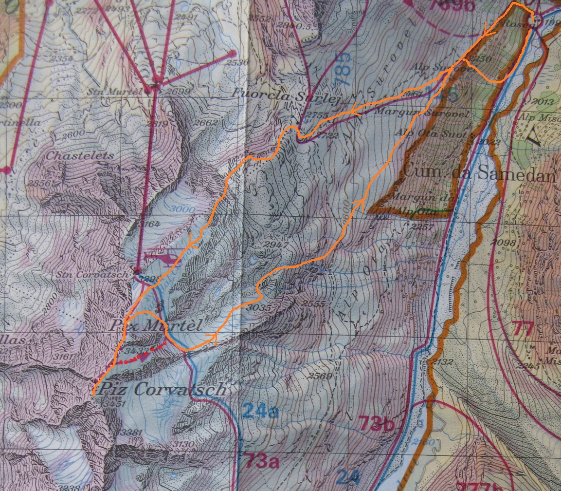 Znovu som pripol lyže a po malom ľadovčeku som pokračoval ľahko až na neďaleký Piz Corvatsch. Aj keď mapka lákala k strmému zjazdu smerom do Val Roseg z bielej pláne medzi oboma vrcholmi, rozhodol som sa vrátiť tou istou trasou a spomínaný zjazd si pozrieť najprv zdola (mapka). Pri návrate som už použil na chvíľu aj mačky, na takúto túru ich už odporúčam, ja ich na podobné túry nosím v batohu stále. Po natraverzovaní pod spomínaný úsek som síce zistil, že by sa to dalo zísť, ale bolo to pekne strmé. V mape zaznačené ako lyžiarska túra :) Tak možno nabudúce...