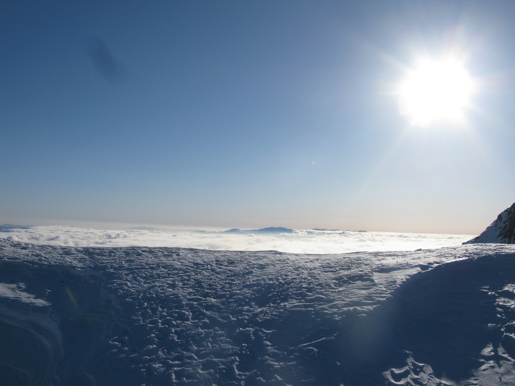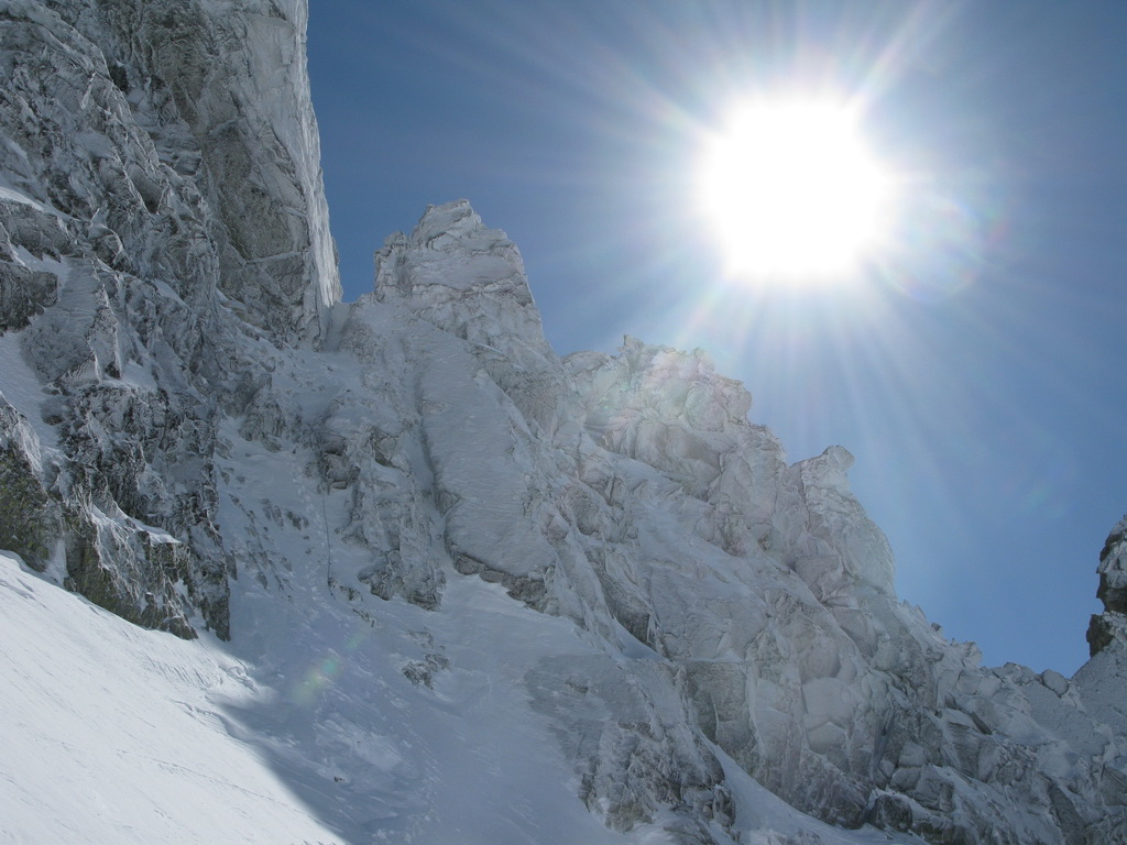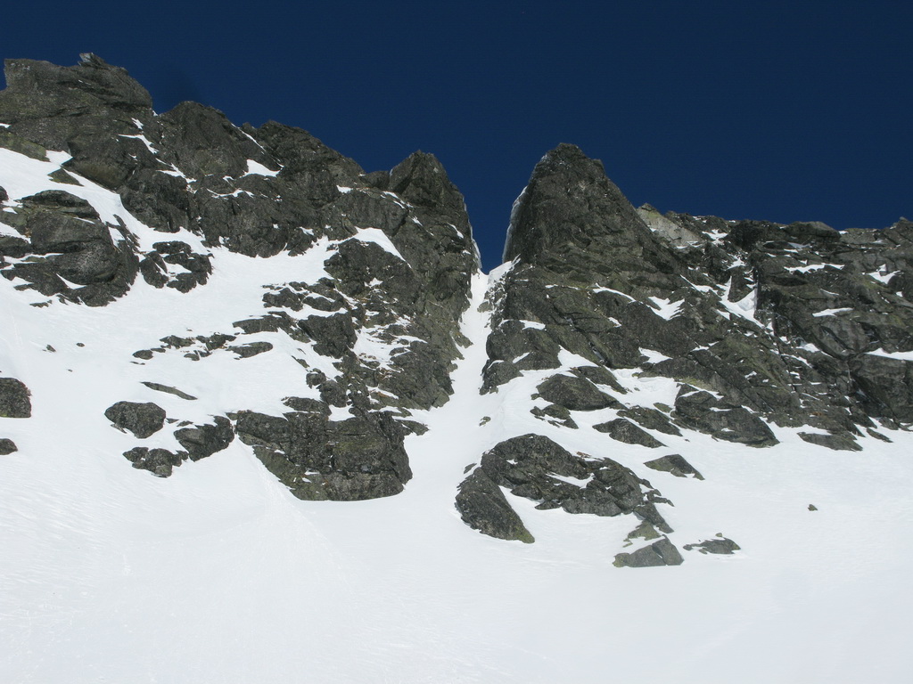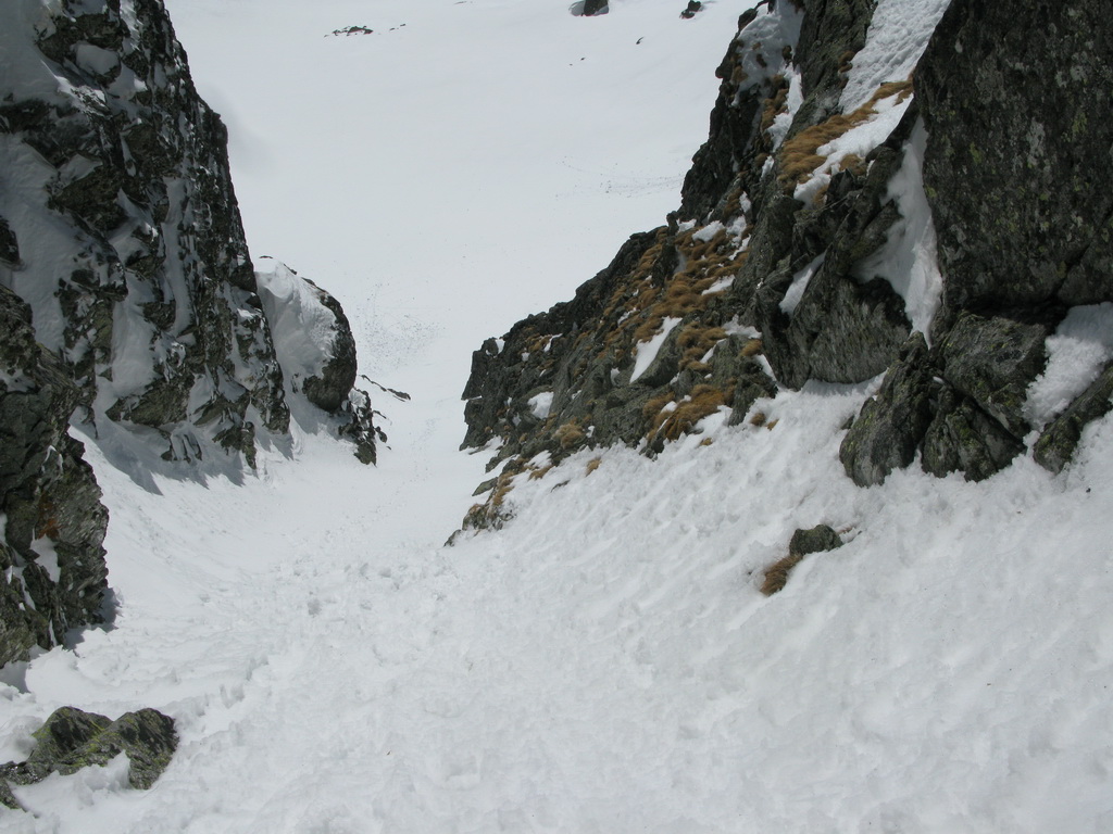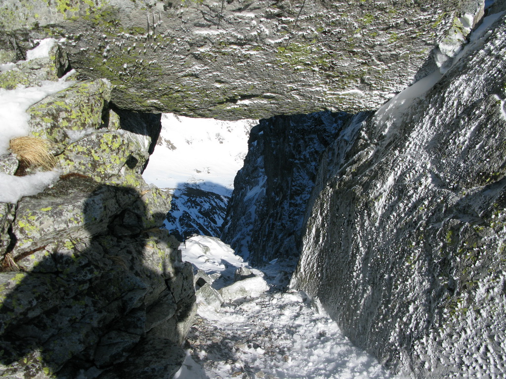 O hoďku nato som už prechádzal cez skalné okno v Satanovom sedle. Lyže pekne v rukách a po kolenách šup ho na slnko. Výstup bol na spodku ešte tvrdý, ale v hornej časti už množstvo ufúkaného čerstvého snehu.