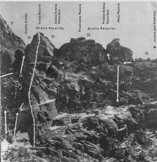 Ale čože?! Čerstvý sneh! Ani som paličkou nevedel prísť na spodnú starú vrstvu. Tak som sa s lyžami v rukách, nadľahčujúc nohy, vylopotil až pod Dračiu bránku. Tu trčalo asi desať metrov fixu. Na jeseň som to okukol. Je natiahnutý pekne až dole.