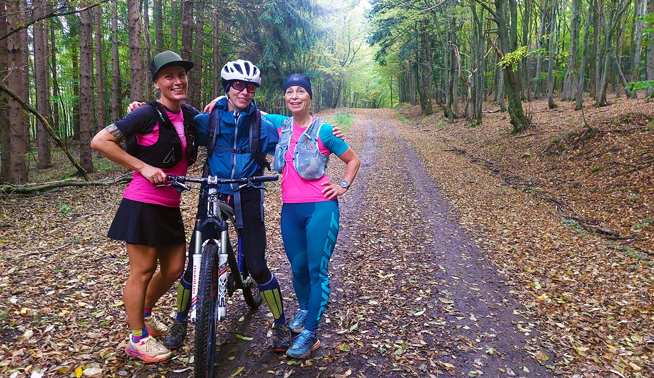 Potom sa partia, do ktorej sa bulvár votrel, konečne vynorila z lesov na lúky pred poslednou obžerstvovačkou, a tam mali aj KLOBÁSU! Okrem nej konečne (až do cieľa) zase dáke výhľady, dažďové mraky v nedohľadne, ružový západ slnka, tak spokojnosť. A jedna provokatérka na bajku, ale to už bolo k hodovacím stolom blízko – do Jargištôlne po lúkach, stade po asfalte do mesta a psími chodníčkami do cieľa v Artcafé.