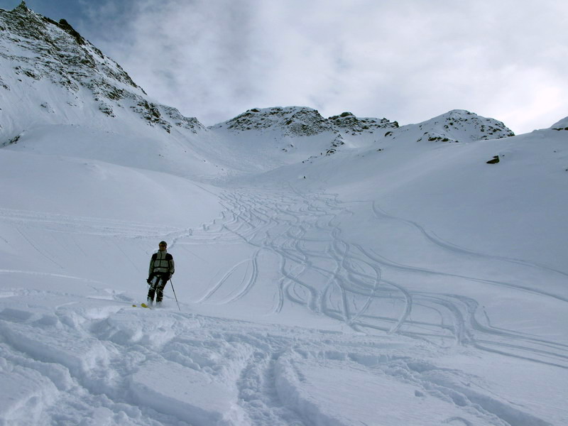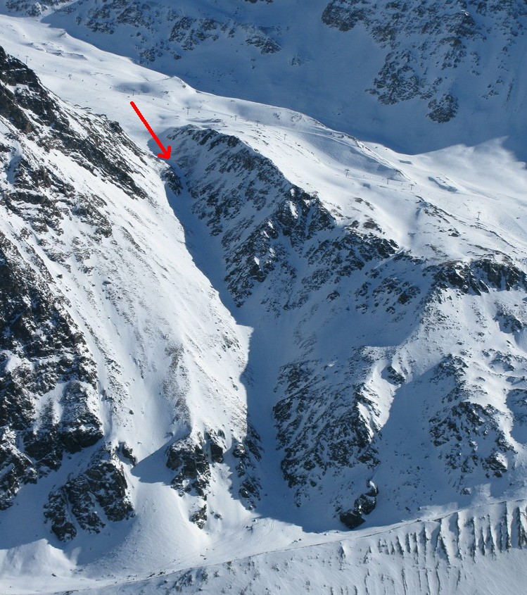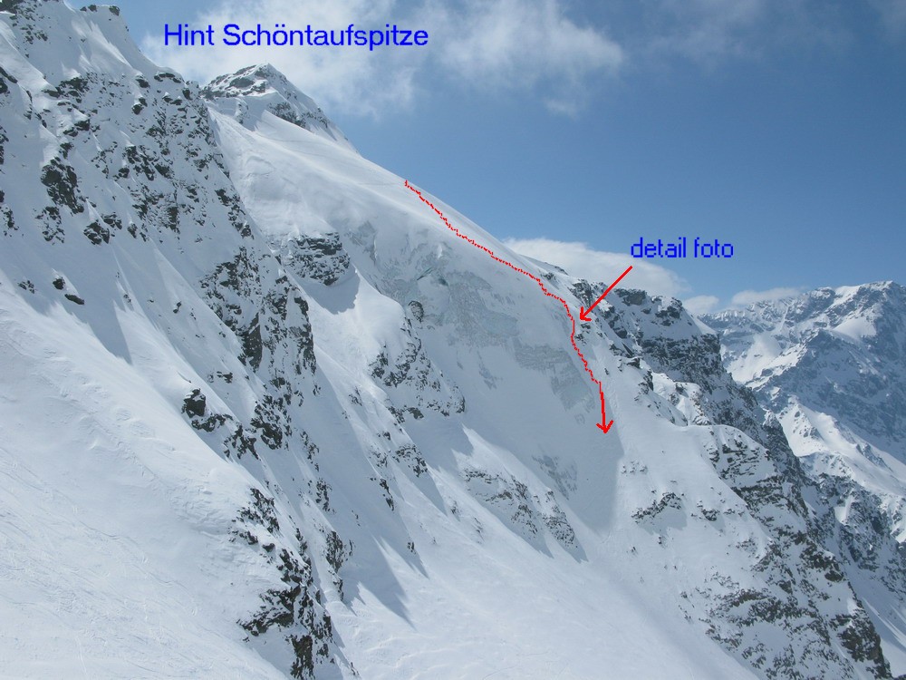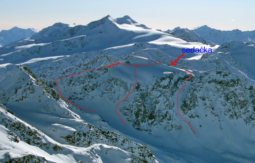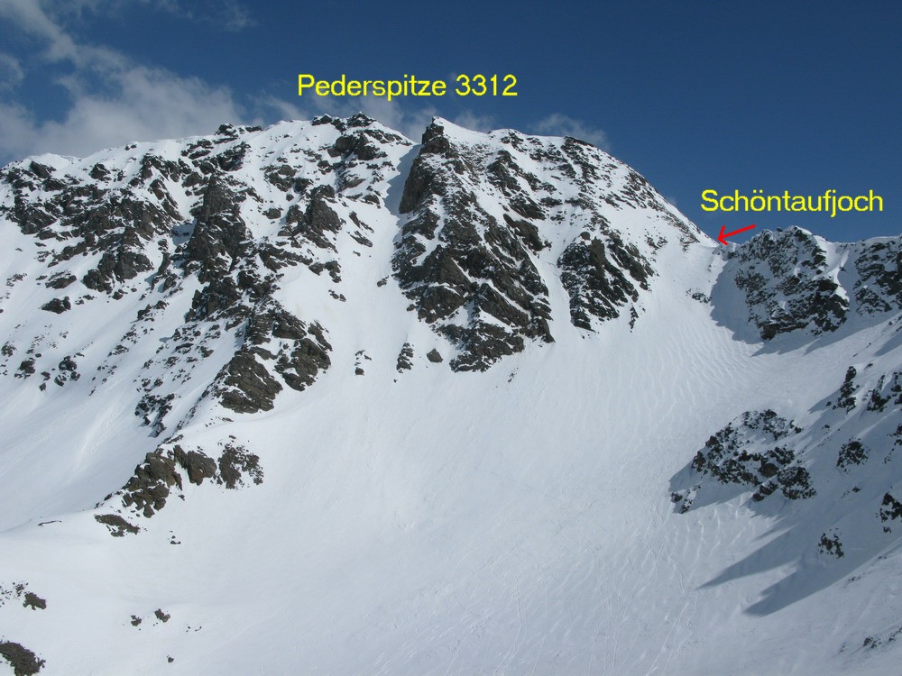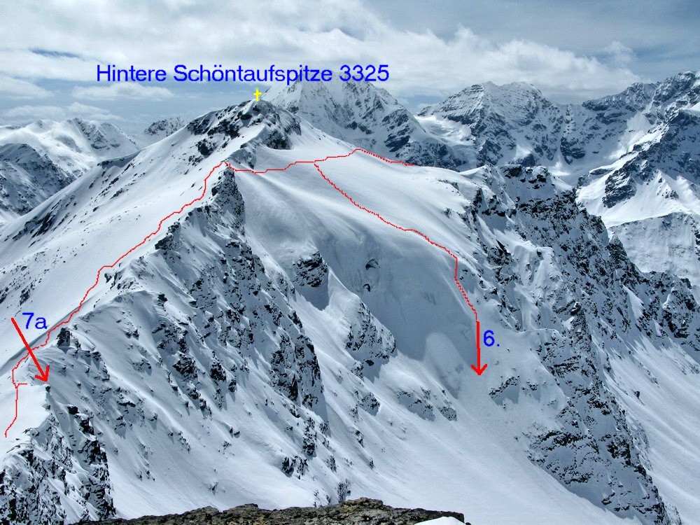 Sedlo pod Pederspitze z ktorého vedie hrebeň až na vrchol H. Schöntaufspitze. Nástup je ten istý ako do zjazdu "Cez dosku" akurát pod H. Schöntaufspitze pokracujeme v traverze až na hrebeň a po ňom z pravej strany smerom do sedla. Pomerne dlhý traverz sa dá skrátiť variantou 7a. Pekným žlabom so sklonom do 45 stupňov sa dostaneme na ľadovec do doliny. (foto)