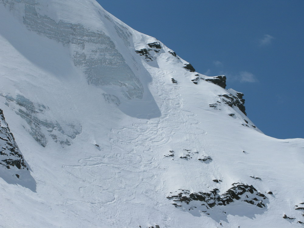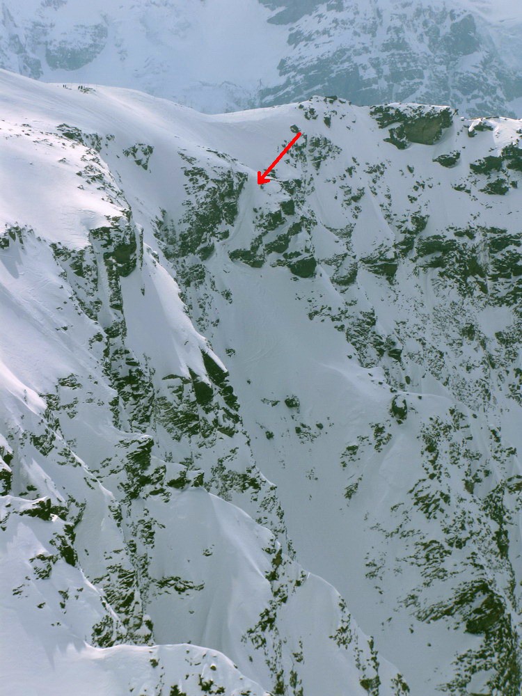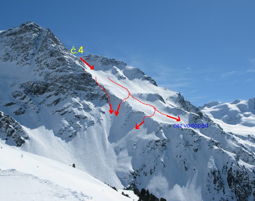 Pri pohľade zdola vidieť vľavo ďalšie možnosti, je tam však treba rátať so zvýšeným lavínovým nebezpečenstvom.