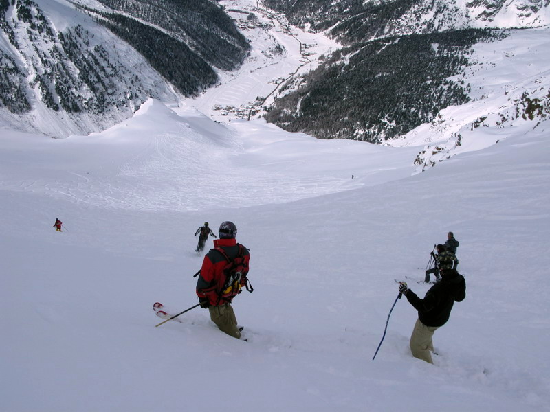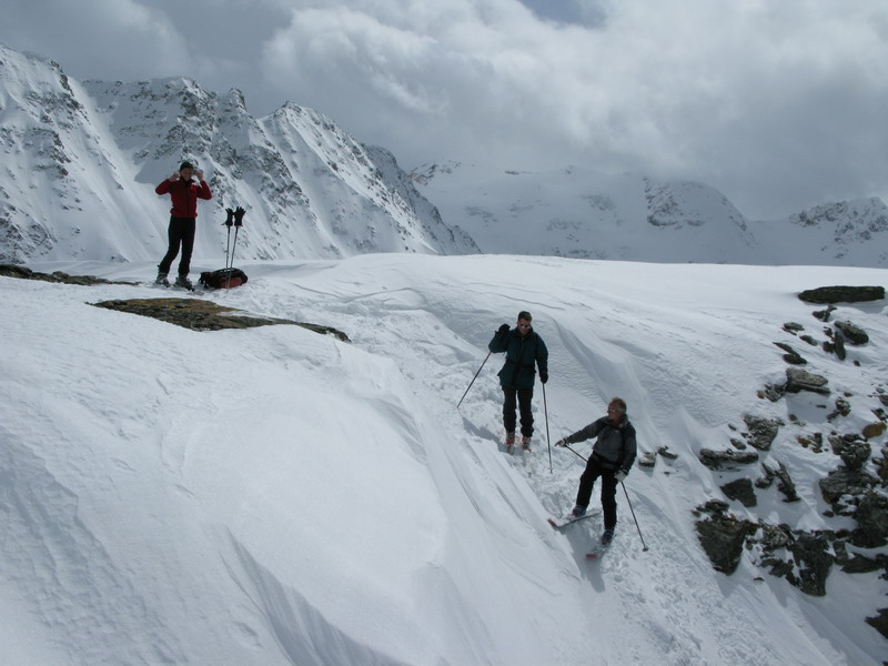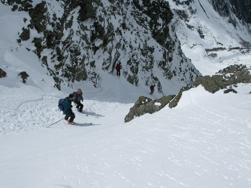 Ľadovec končí prudkým zrázom a na tomto miesta odbočíme vpravo a zjazdujeme po úzkom páse medzi ľadovcom a skalnatým prahom. Najstrmší úsek sa prekonáva tiež len zošuchnutím (foto). Po prekonaní tohto úseku sa dostanete na ľadovec do širokej doliny. Pre zjazd do doliny sa používajú dva hlavné smery (foto).