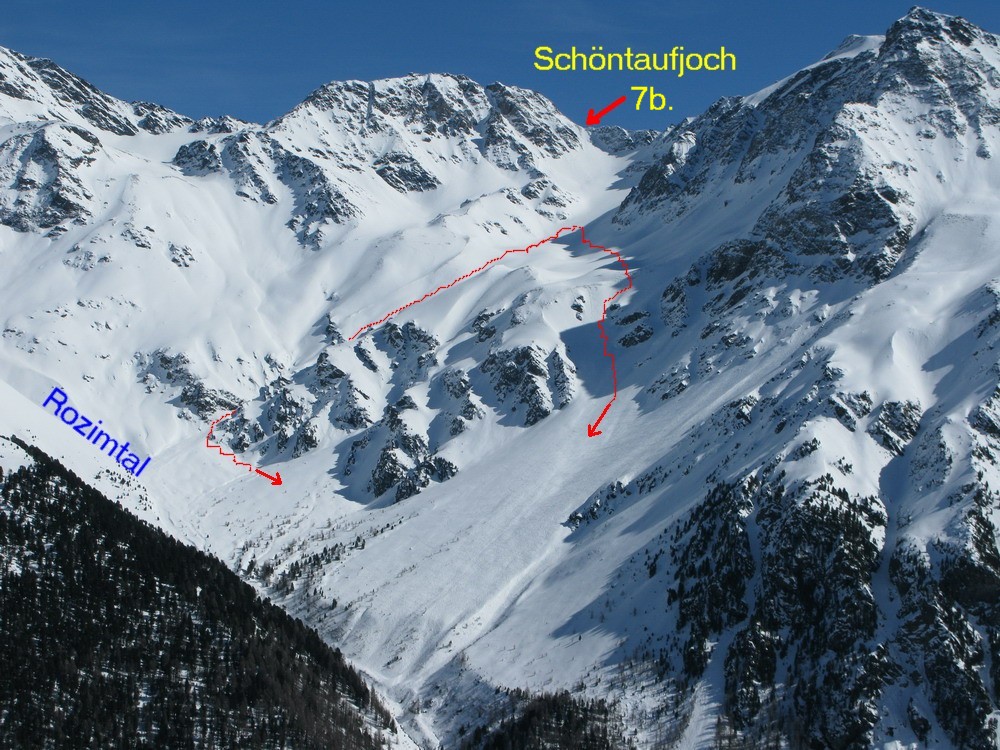 Veľmi vďačný zjazd do Rozimtalu s jedným nepríjemným kľúčovým miestom. Po vystúpení zo sedačky dáme dole lyže a s lyžami na chrbte alebo v rukách šliapeme po hrebeni smerom na vrchol Hintere Schöntauf. Po asi 100 metrov by ste mali uvidieť stopu doľava z hrebeňa vedúcu šikmo traverzom popod vrchol. Traverzom sa dá dostať až na hrebeň vedúci z vrcholu smerom na Schöntaufjoch. Asi v dvoch tretinách traverzu sa odpojíme zo stopy a nasleduje zjazd rovno dole.
