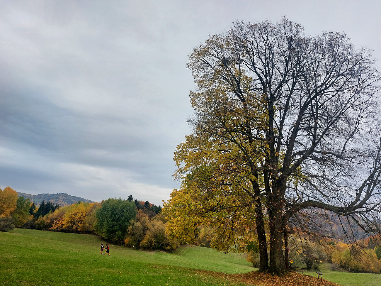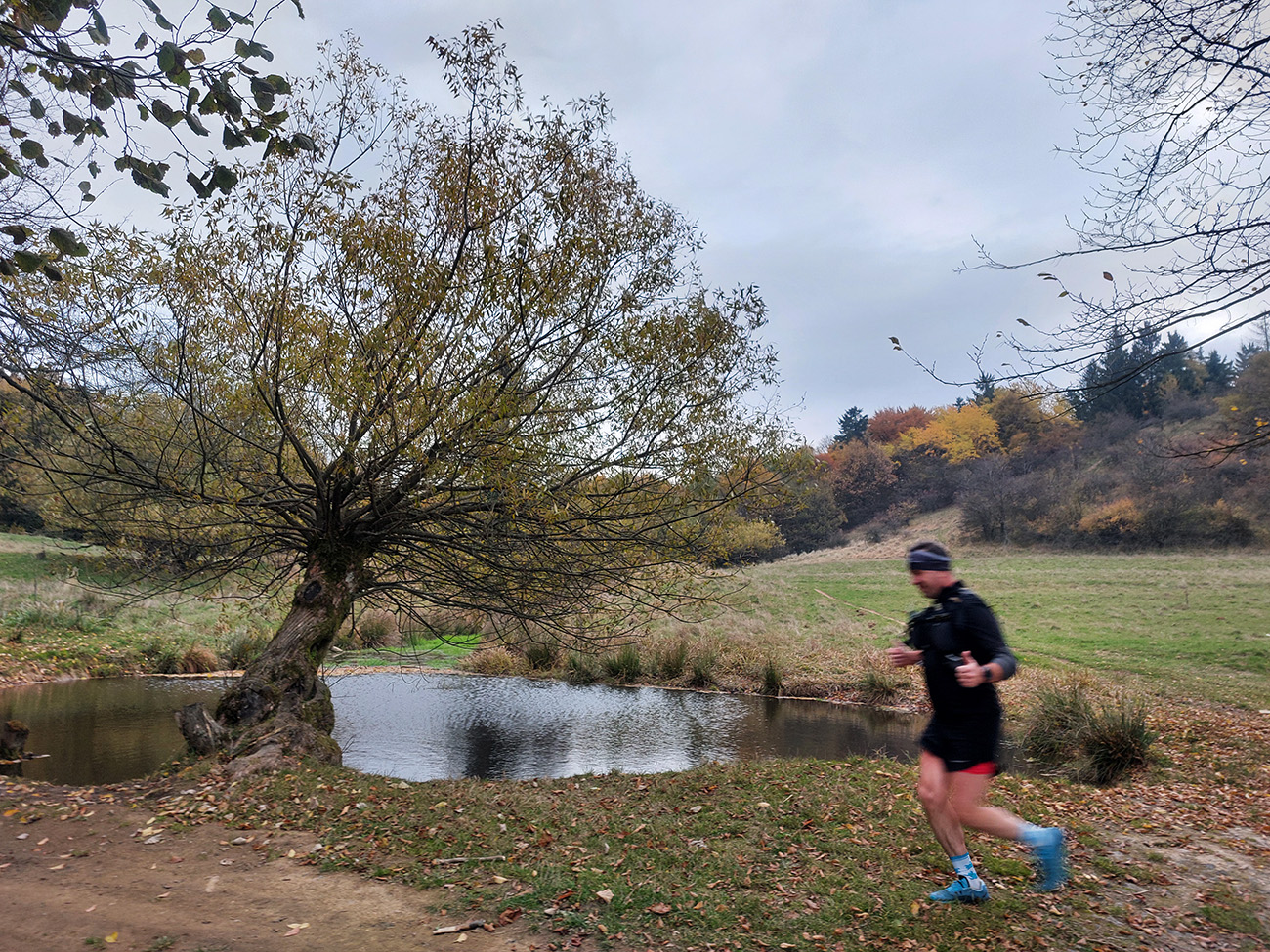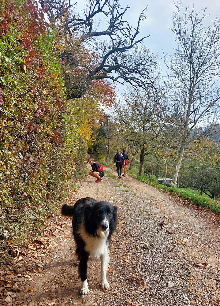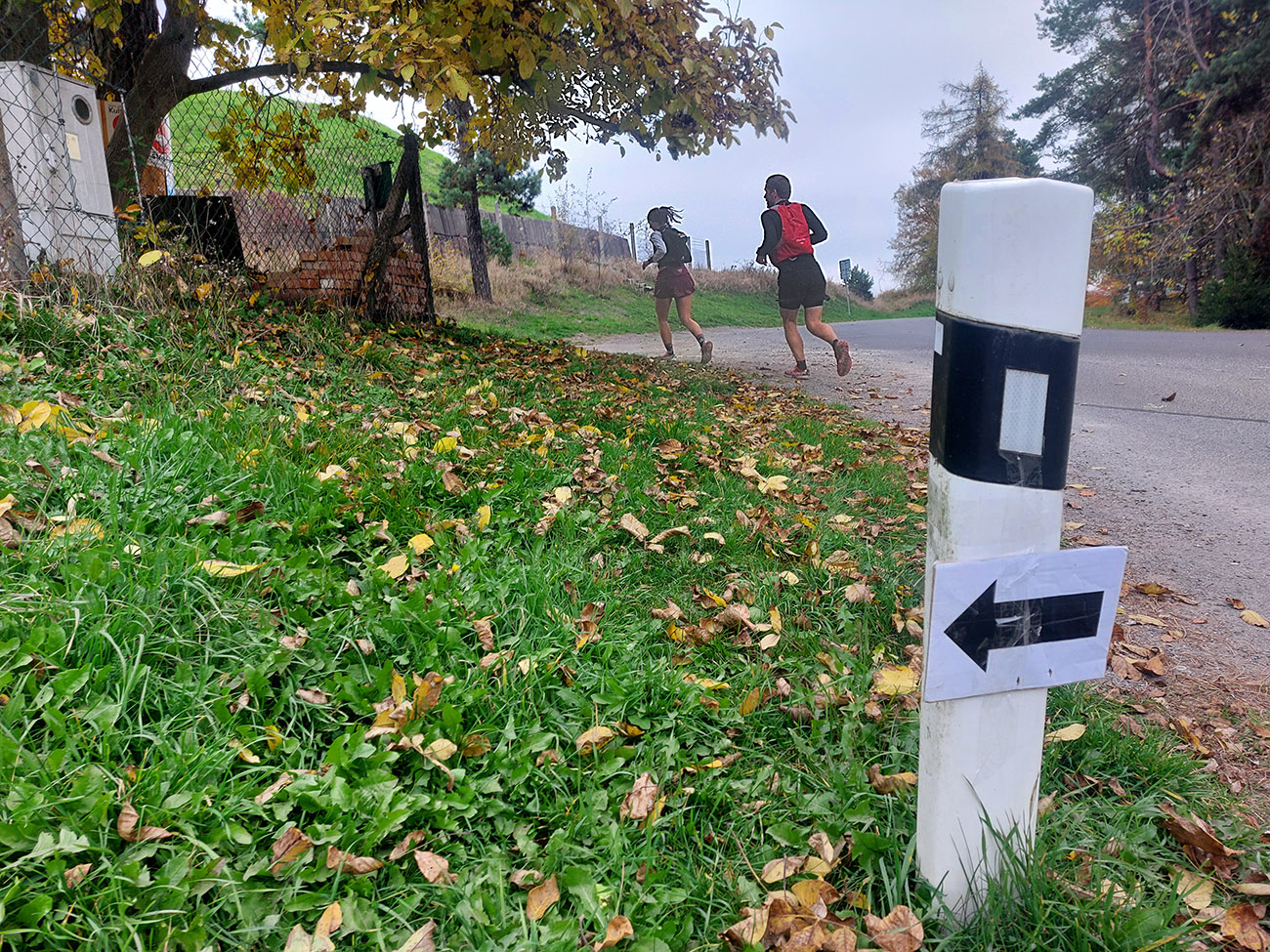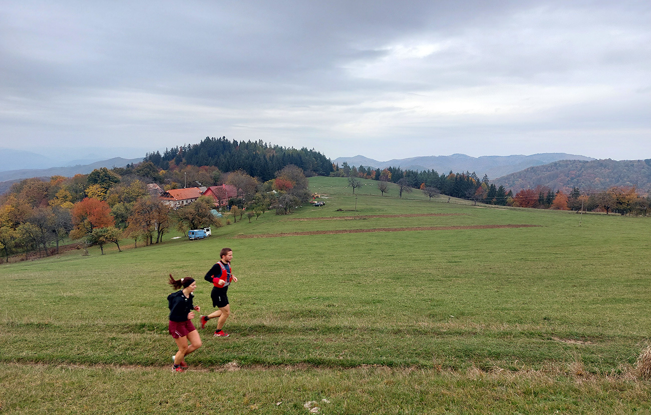 Na singlíku podpod Tanád a Paradajs a potom aj na „hrebeňovke“ sa natiahol ukážkový had, postupne sa deliaci na skupinky. Premotivovanci už boli samozrejme o kilák vpredu. Z lúk výhľady šedivé a v diaľkach zakalené, tak sa viac bežalo a kecalo ako fotilo. Na Kopaniciach tentokrát žiadny krmelec, točili sme hneď pri kostole doprava dole, do Hodruše. Nový úsek trasy, tak samozrejme pár ľudí hneď kufríkovalo, ale zatiaľ iba mierne. Keď okolo BŠ je tých ciest toľko na výber...
