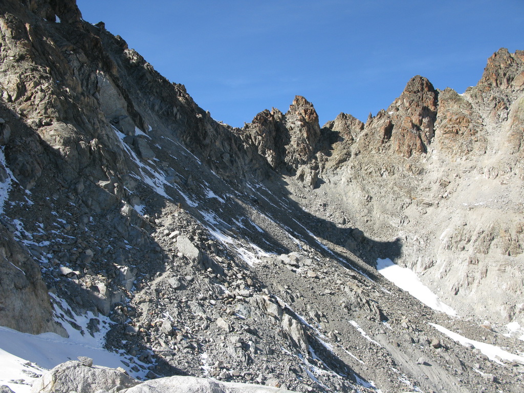 Normálka na tento vrchol vedie severne orientovaným skalným rebrom. Prístup k nemu je po ľadovci na ktorom nehrozí veľké nebezpečenstvo pádu do trhliny. Obtiažnosť skalného hrebeňa by som ohodnotil 3-. Samozrejme veľkú úlohu hrajú podmienky a preto mačky a čakan by vo výstroji nemali chýbať. Lano som nemal, pre tých, ktorí by si ho chceli zobrať odporúčam max 30metrov. V hornej časti je na skalnom hrebeni zopár osadených istení, ktoré sa môžu hodiť hlavne ak je ľadovo.