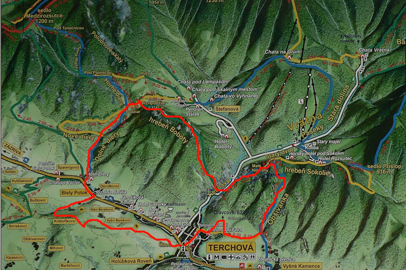 Tentokrát dáme okruh okolo dediny na juh, ale tentokrát po vlastných. Kto by ťahal bajk pomedzi skaly na Boboty a Sokolie? Bude to také 3x hore a dolu: nech sa sem radšej nechystá nik, kto má slabé kolená :-) Ale na výhľady je to veľmi vďačný okruh – na začiatku a na konci do Terchovej, v strede do Vrátnej.