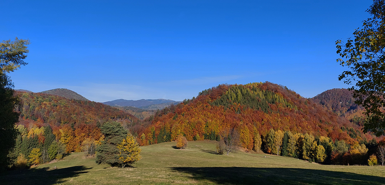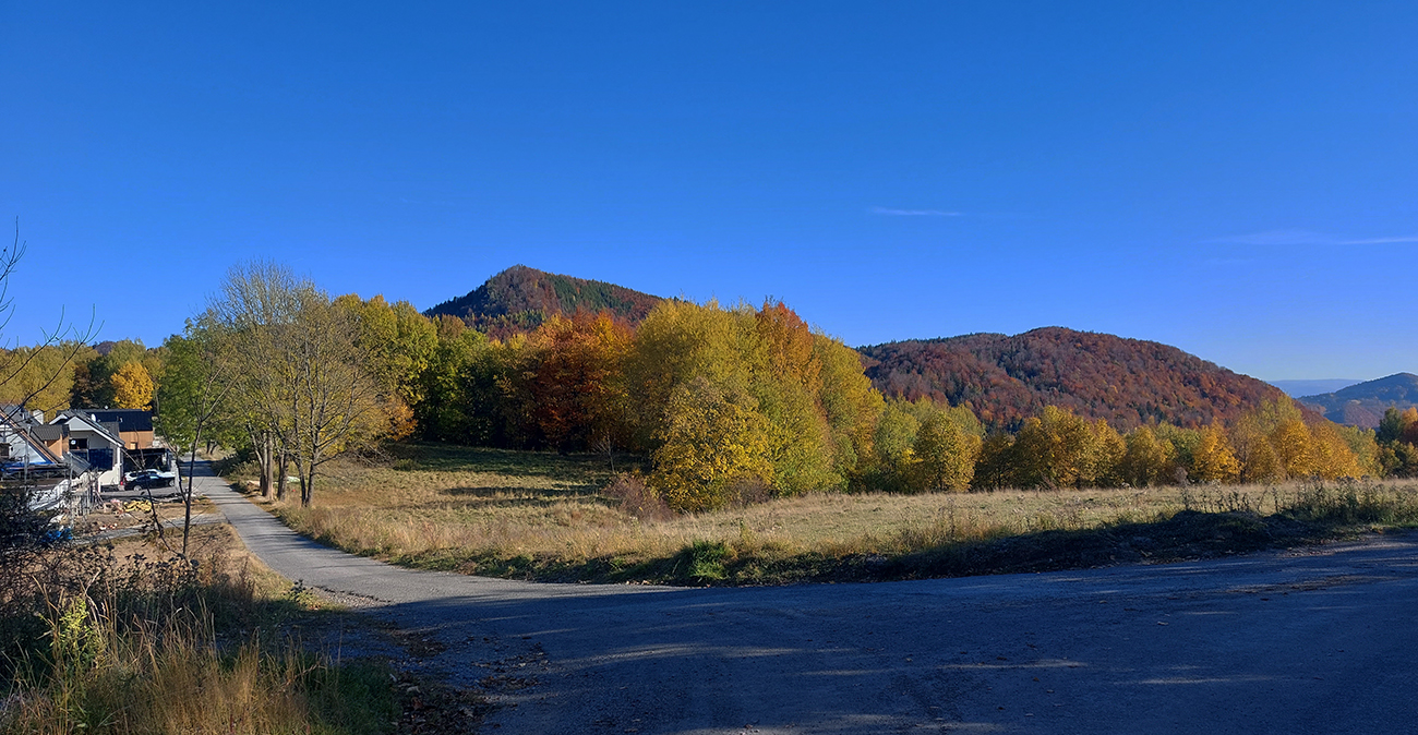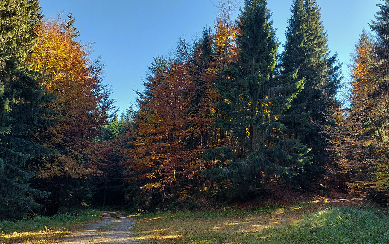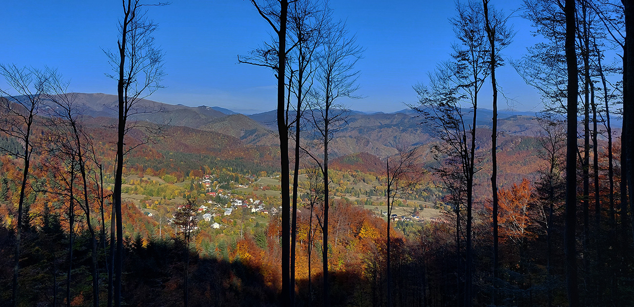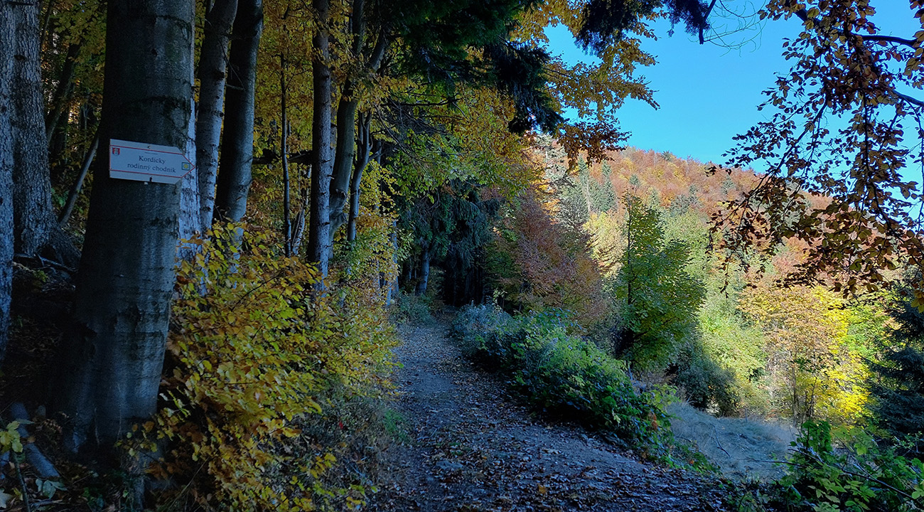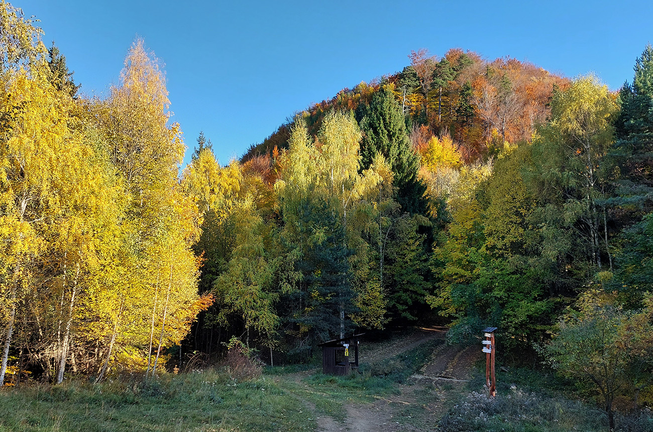 Názov hádam dobre vystihuje filozofiu tejto prechádzky. Predposledná októbrová nedeľa totiž vyšla neskutočne, čo sa počasia týka. Mrazivé ráno, obloha vymetená, vzduch ostrý, po fronte prečistený a do toho všetky farby jesene v najjasnejších odtieňoch. Jeden z tých nemnohých „superturistických“ dní, kedy hádam aj prechádzka rúbaniskom je potešením pre oko. Zaniesol ma do Kremnických vrchov, na ich západné úpätie. Potreboval som sa odtiaľ dostať do Banskej Bystrice, ale na hlavných turistických trasách isto bolo plno ľudí – preto nastúpila tá improvizácia a hľadanie kadejakých bočných a turisticky neoficiálnych cestičiek, po značkách aj mimo nich. Kremnické vrchy majú samozrejme tých možností strááášne veľa.