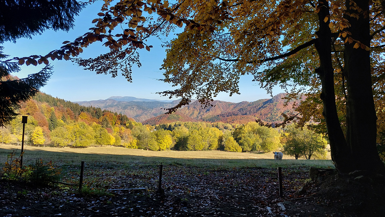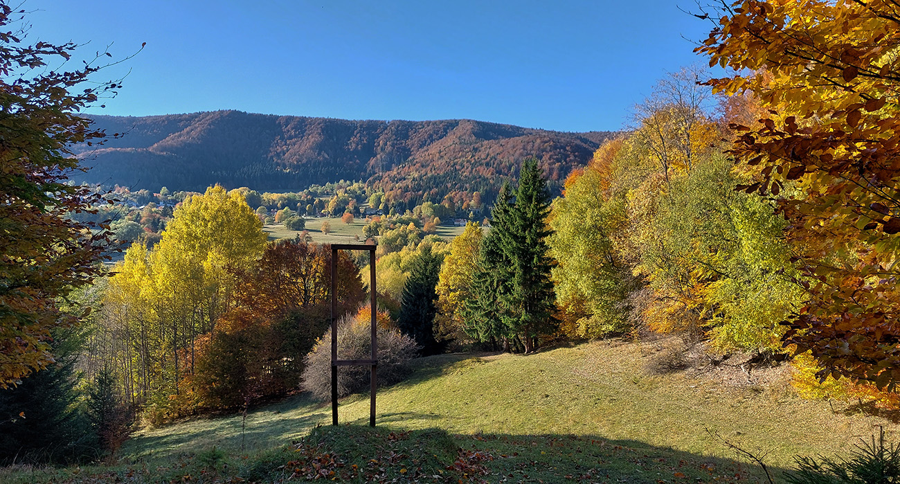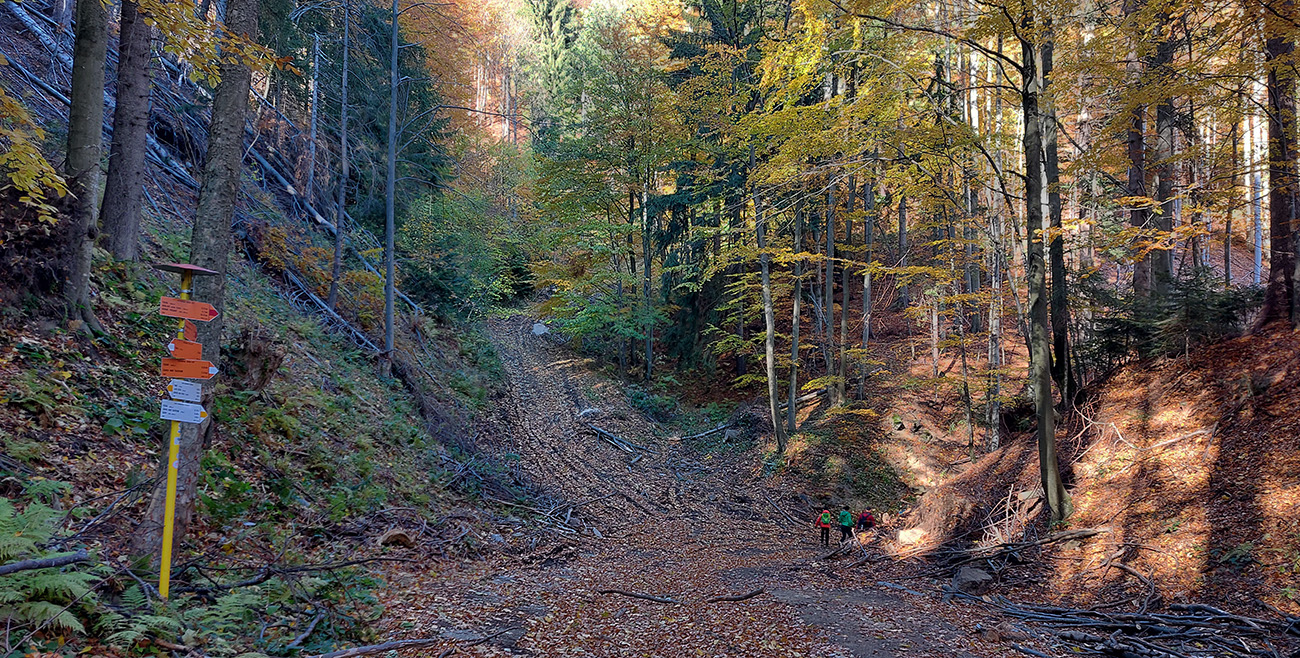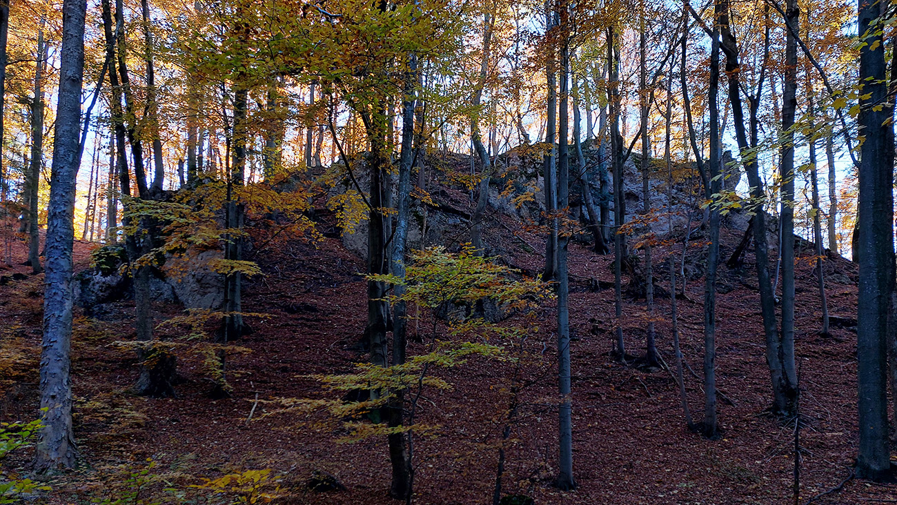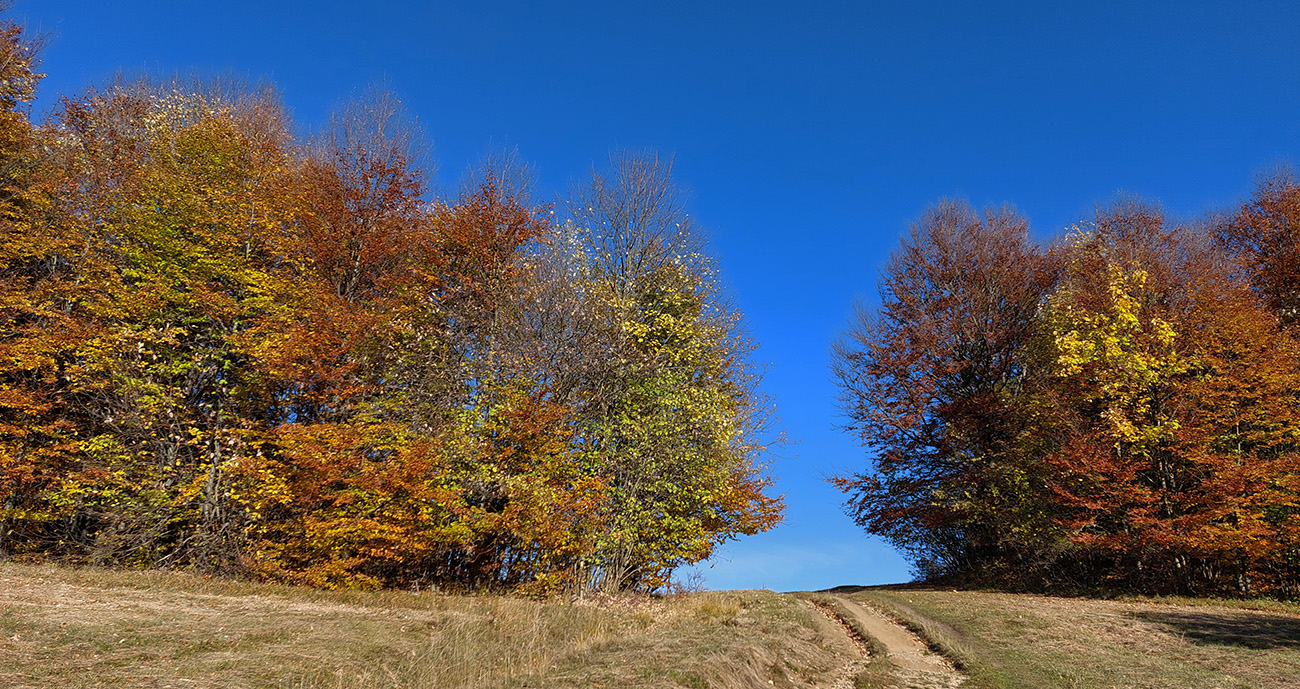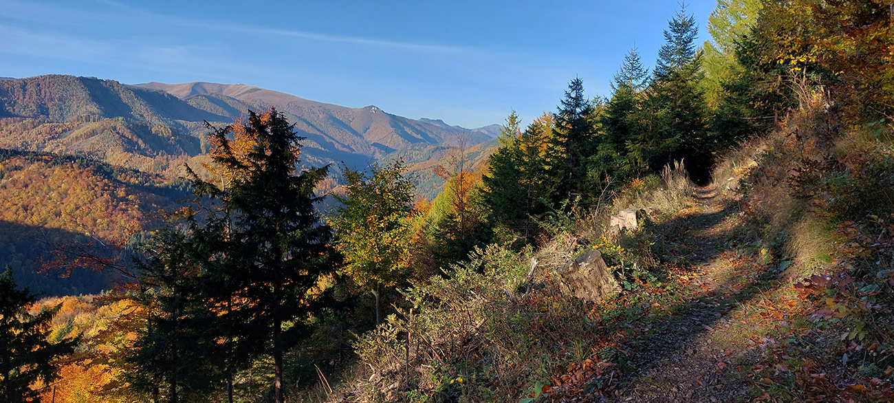 Názov hádam dobre vystihuje filozofiu tejto prechádzky. Predposledná októbrová nedeľa totiž vyšla neskutočne, čo sa počasia týka. Mrazivé ráno, obloha vymetená, vzduch ostrý, po fronte prečistený a do toho všetky farby jesene v najjasnejších odtieňoch. Jeden z tých nemnohých „superturistických“ dní, kedy hádam aj prechádzka rúbaniskom je potešením pre oko. Zaniesol ma do Kremnických vrchov, na ich západné úpätie. Potreboval som sa odtiaľ dostať do Banskej Bystrice, ale na hlavných turistických trasách isto bolo plno ľudí – preto nastúpila tá improvizácia a hľadanie kadejakých bočných a turisticky neoficiálnych cestičiek, po značkách aj mimo nich. Kremnické vrchy majú samozrejme tých možností strááášne veľa.