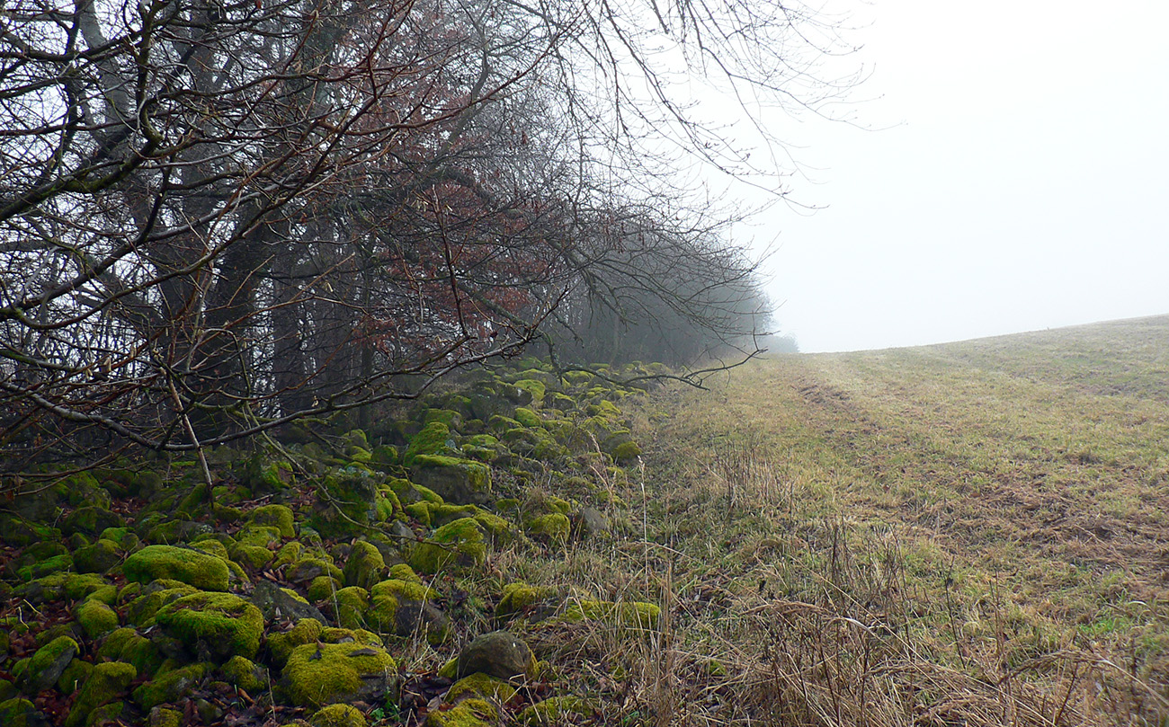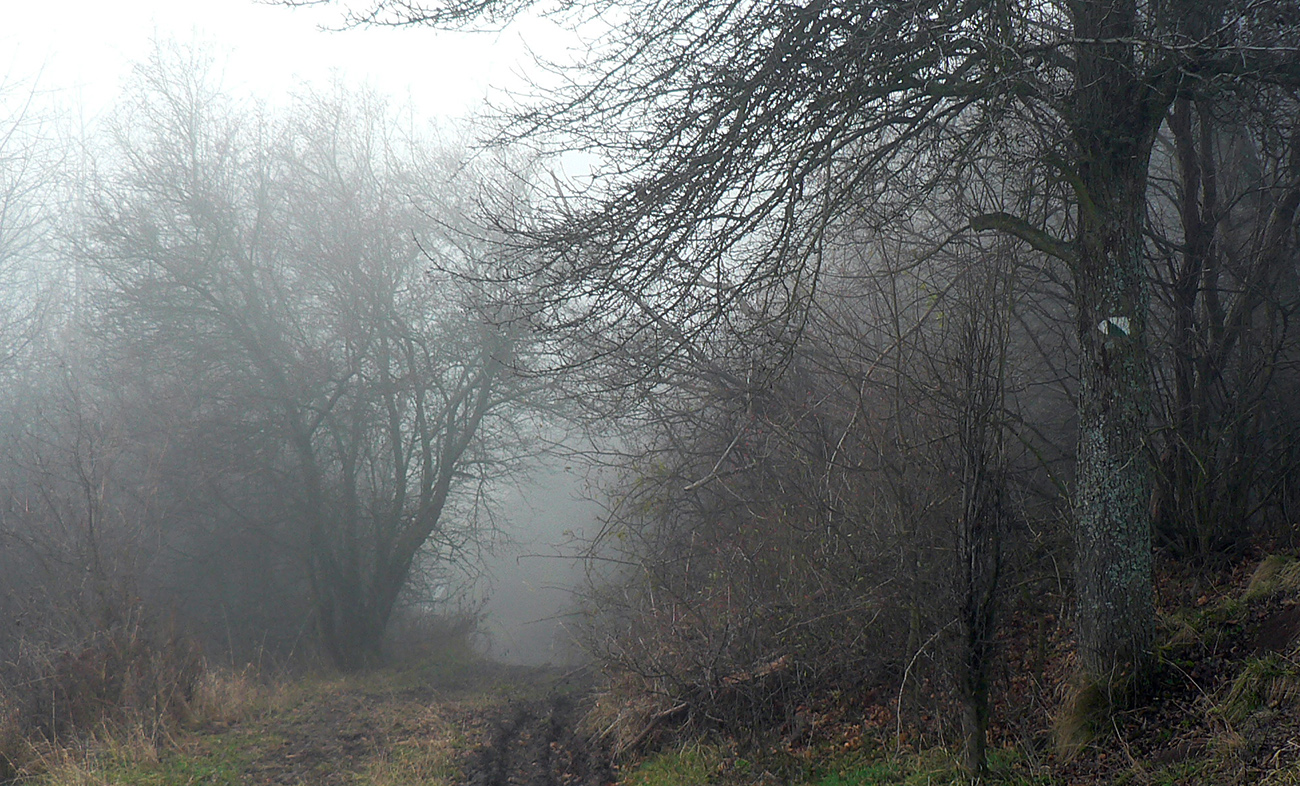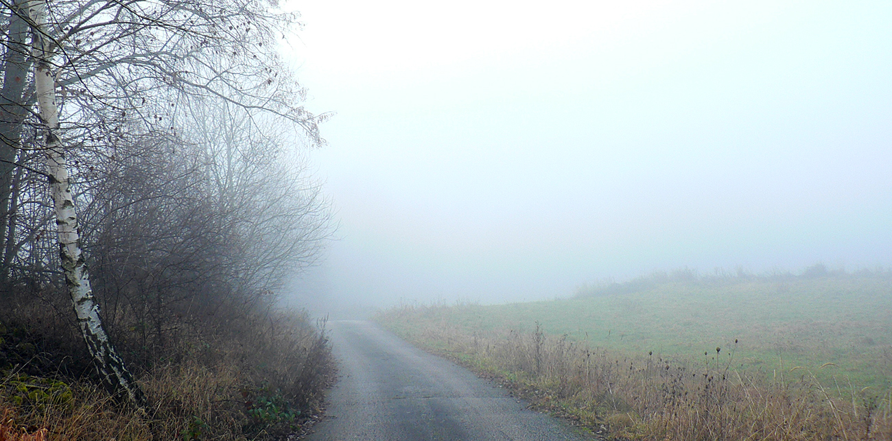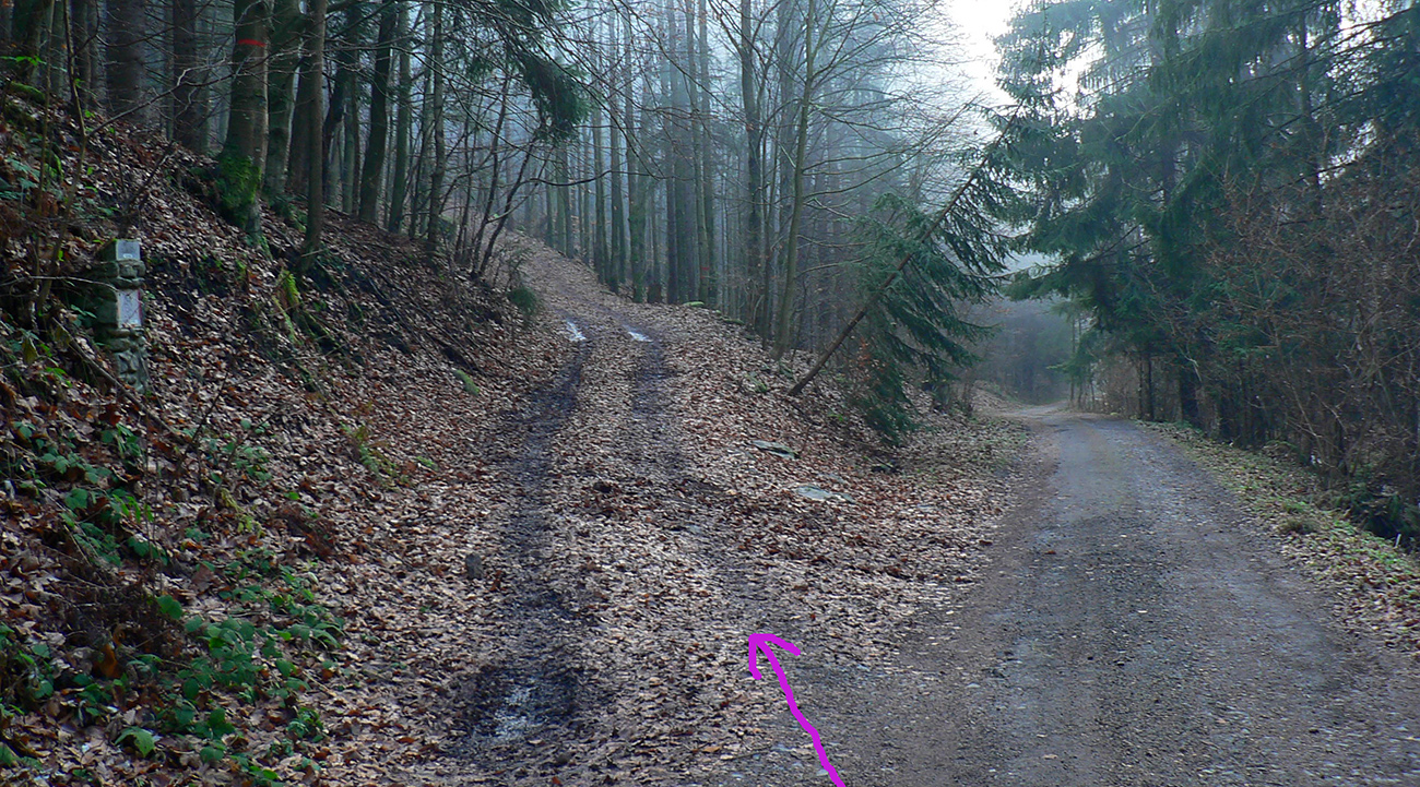 Dole lesom som zišiel ako som vyšiel. K tomu mravenisku. Medzitým hmla vyliezla až na spodný okraj lesa a pri pohľade z neho von, na pasienky nad Ihráčom, mi modrá šípka ukázala len husté mlieko. No dobre, úloha č. 4 dostať sa do dediny. Trávnatá cesta vyzerala viesť jednoznačne dobrým smerom a z hĺbky toho mlieka občas štekol pes. Takže dalo sa, aj keď do dediny som sa skotúľal na inom mieste ako tá značka. Kde odbočila, netuším. No chaos proste...