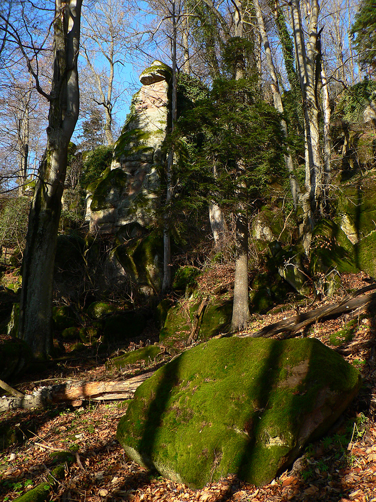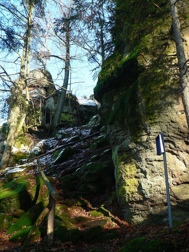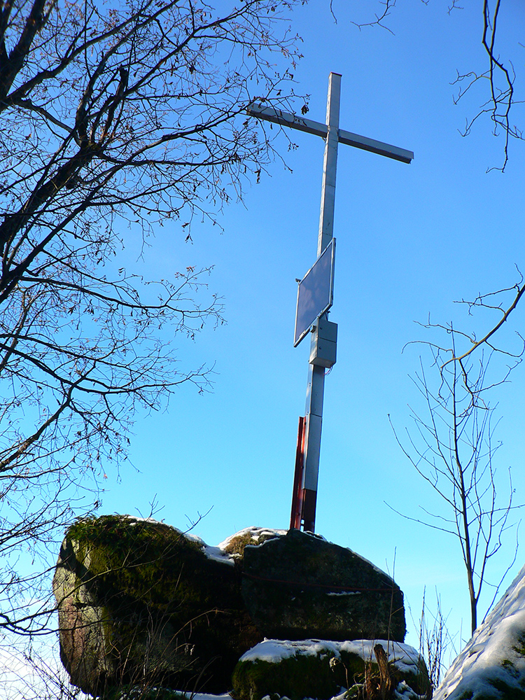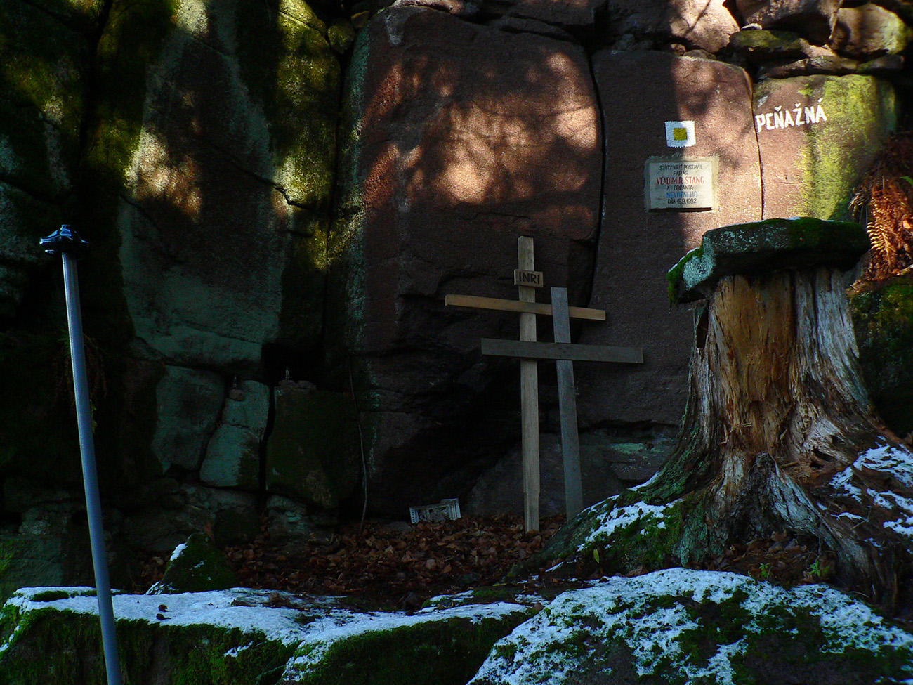 Potom už nazad dole na odbočku z doliny hore - ku krížu je to odtiaľ asi 50 minút, tiež dobre značených. S ďalšou odbočkou pri mravenisku :-) Záver strmší, ale cesta lesom ako z rozprávky, pomedzi veľké, machom obrastené balvany. A nad tým všetkým skalné mesto podobné tomu Prielomu dole v doline. Len nevkusné plechové stĺpiky krížovej cesty a hore ten kríž a ostatné „kostolné doplnky“. Nemôžem si pomôcť, ale toto sa dalo aj inde postaviť a radšej dôstojnejšie, nebolo treba práve takto przniť tú skalnú nádheru. Ale sa niet čo čudovať, keď je to tu všetko bez ochrany. Ktovie prečo? Na toto bude mať samozrejme veľa ľudí opačný názor, to je mi jasné, ale som si neodpustil :-)