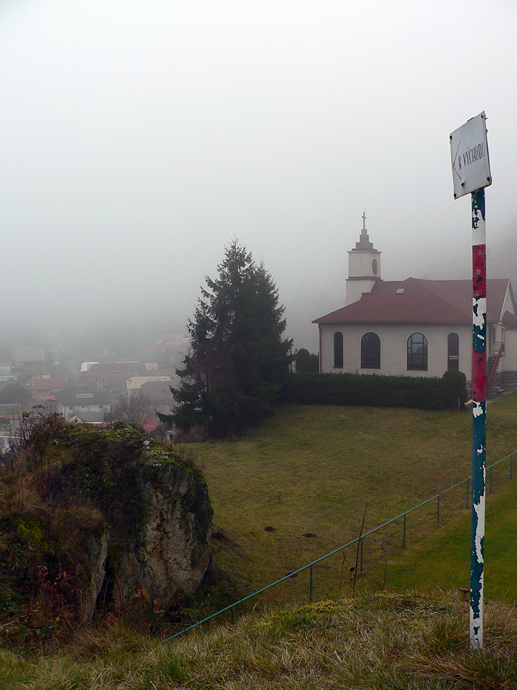 Aj z Ihráča smerom nazad k Nevoľnému už som vedel kade, takže nazad k OCÚ, ešte kúsok vyššie na koniec dediny a točím doľava, do lesa, pomedzi domy, popri trafostanici. Nad lesom potom až k samote Lazy cesty zreteľné aj v tej hmle, aj od Lazov hore lúkou. Ako sa koľaje na lúke (akože cesta) zatáčajú doľava, nastáva úloha č.5. Už viem, že tu som minule neodbočil, musím ísť ešte viac doľava, skoro do protismeru, a začať klesať. A naozaj – priechod v kríkoch na ďalšiu lúku. Na jeho začiatku zelená značka, na konci druhá a už som si myslel, že mám vyhrané. Tak zbeh po lúke, popri okraji krovín, s pozorným hľadaním vchodu do tej húštiny, lebo značiek už nikde. Až nižšie ako som tušil, že by som mal byť, zrazu tunel popod železnicu, popri ktorej som už chvíľku klusal. Správnym smerom podchod síce, ale značka žiadna ani za ním. Vrátil sa ten kilák nazad. Odbiehal som do všetkých smerov. X-krát konzultoval s mapou. Všetko sedelo, len tá značka nikde. A už bolo neskoro, už som vedel, že Jastrabskú skalu zase netrafím. Lebo som tušil, že som od značky príliš na západ. Tak znovu ten podchod popod trať, ešte pár pekných lúk strmo dole a vypľulo ma to na asfaltke niekde medzi Jastrabou a Bartošovou Lehôtkou.