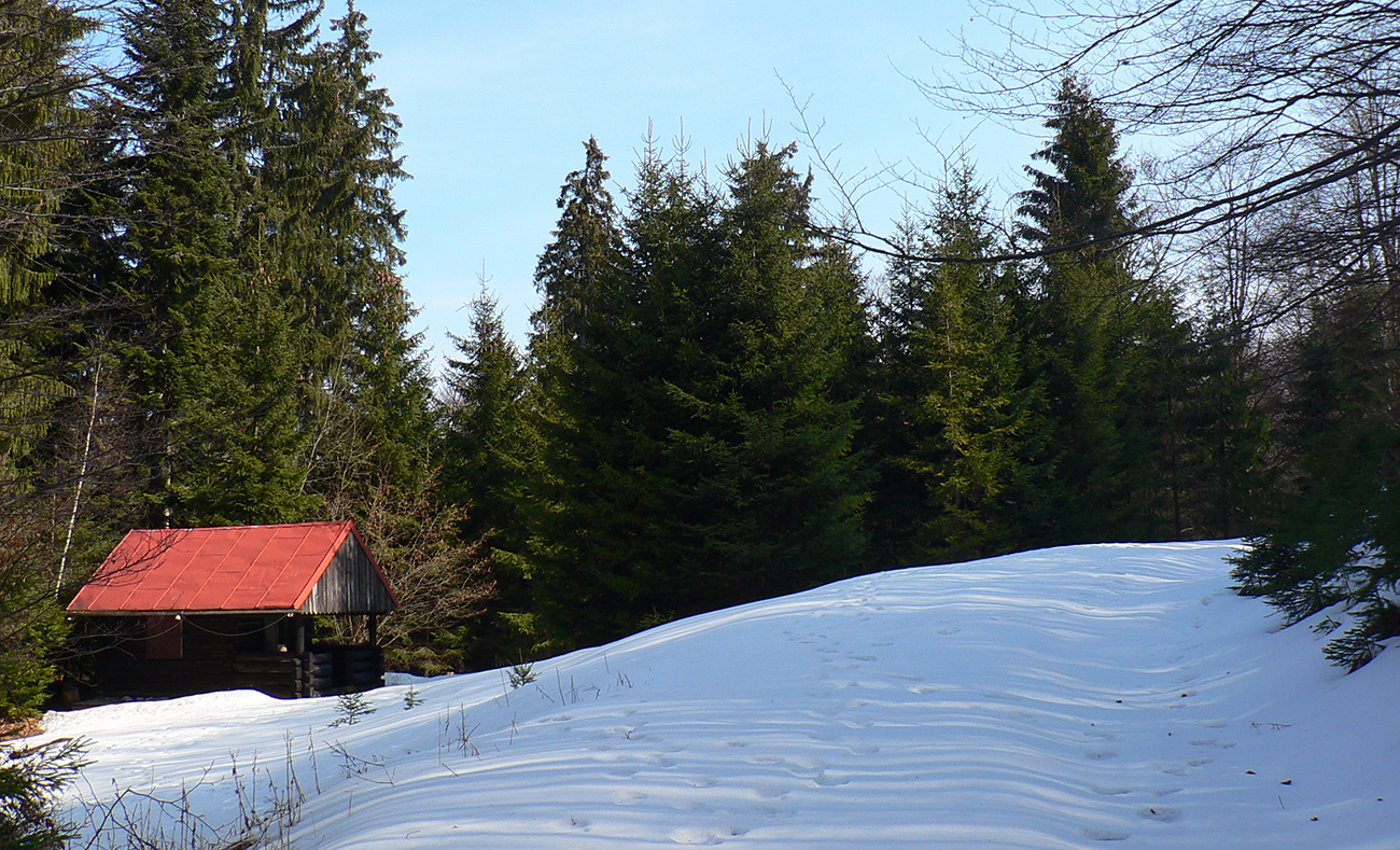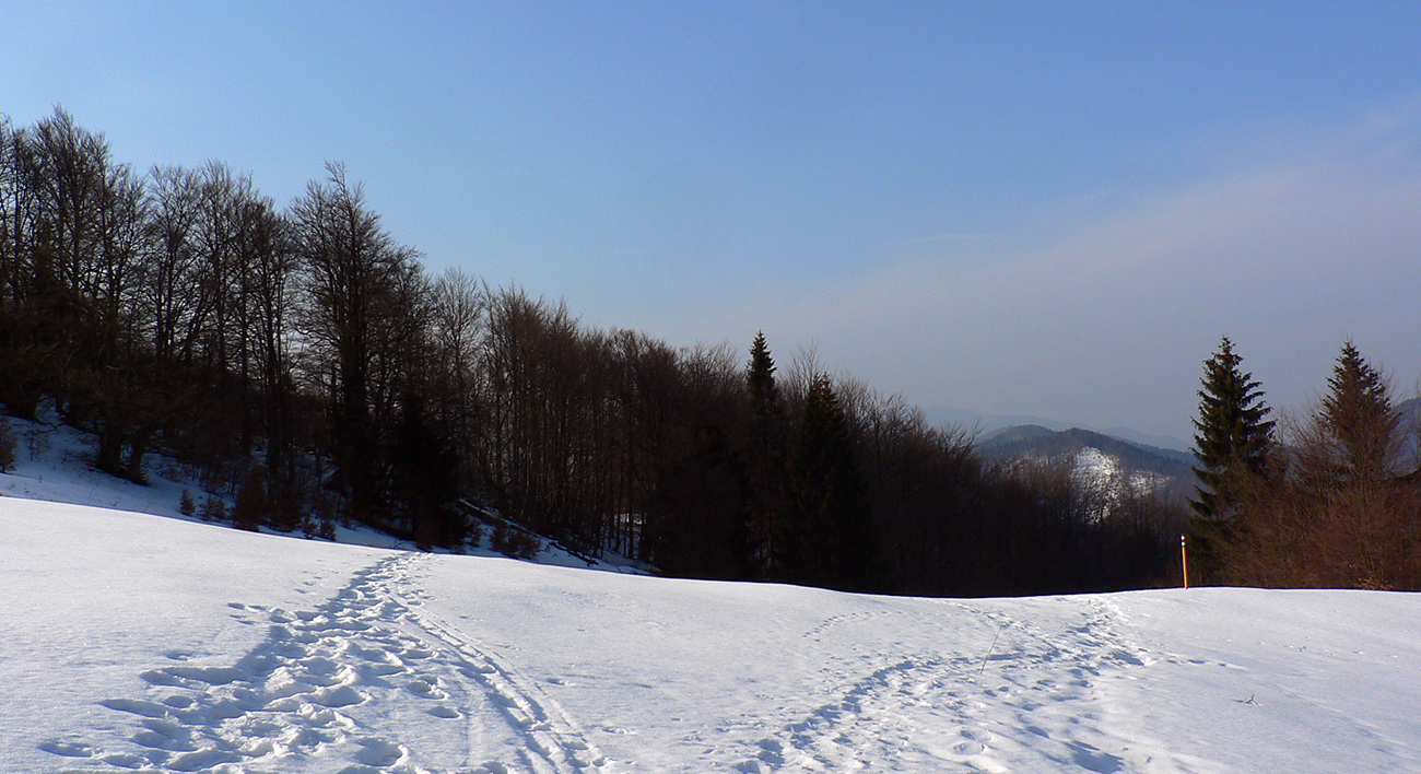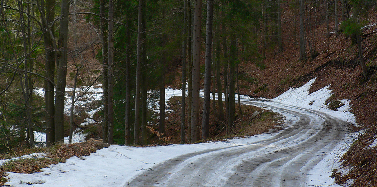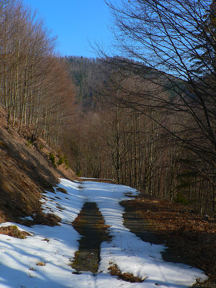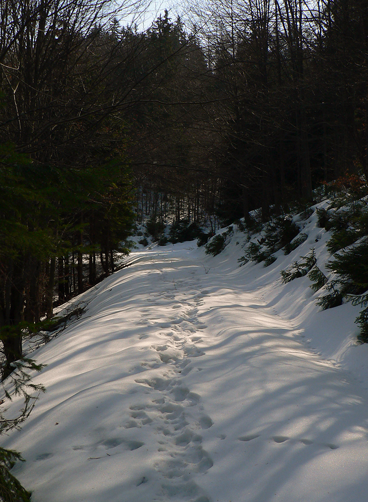Jediný hrebeňový úsek na trase po sedlo Príslop je hrboľato zamrznutý, ale len na zvyškoch snehu. Väčšinou z kopca. Napájadlami pod Nižnou Lipovou nepohŕdam – odchlipnem si z fľaše a doplním. V Príslope nejdem až ku smerovníku, tesne pred ním miznem v lese – v tuneli pod smrekmi, ktorý ma po pár metroch prudšieho klesania vyhadzuje na zvážnicu. Prekročil som hranicu okresu, strašný hriech! Treba sa mi dostať na dno Ľubochnianskej doliny a to sa dá po tej zvážnici smerom doľava aj doprava. Volím doľava – predsa len, je tam viac na juh otočených svahov. Dobre som zvolil, dobre sa ide, snehu málo. Zato medvedích stôp požehnane. Podklad je mrazivo chrumkavý, no snažím sa klusať potichu a za každú zákrutu opatrne nazerám, či nevyruším domáceho pána. Ale nikde ani chlp a takto až dole, k horárni Salatín. Prostredie pekné, len podklad nižšie v doline zasfaltovel.
