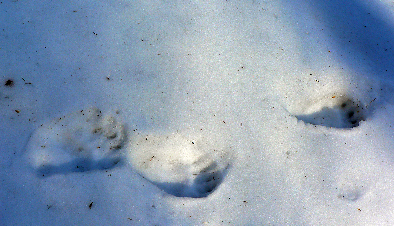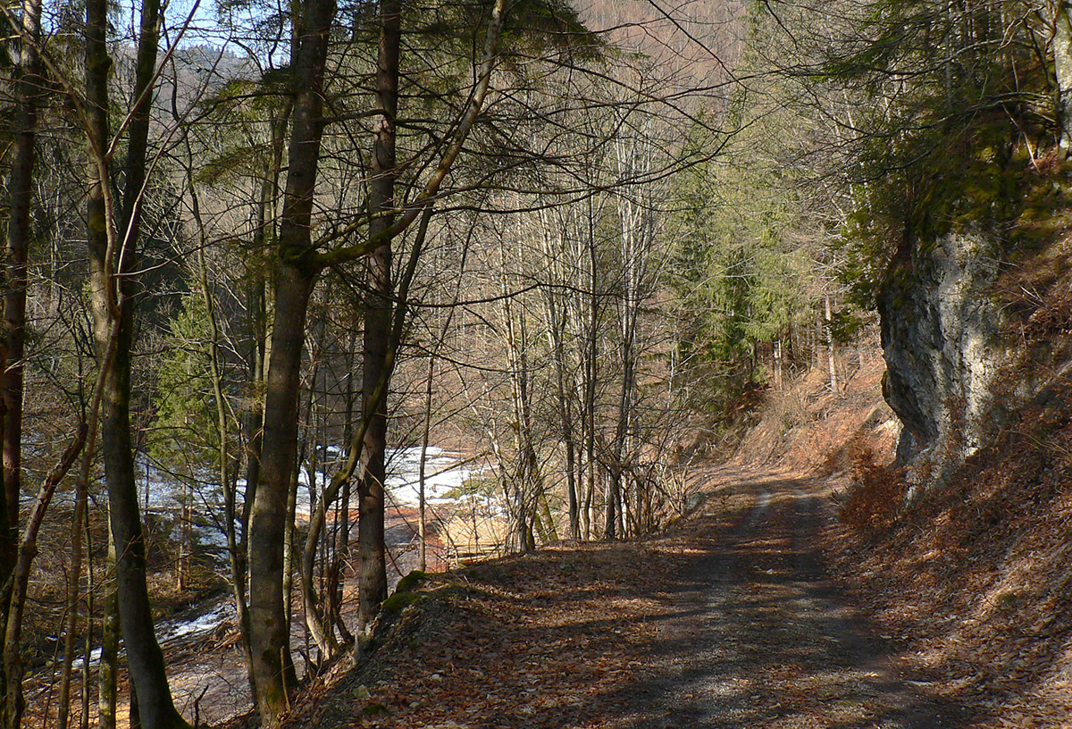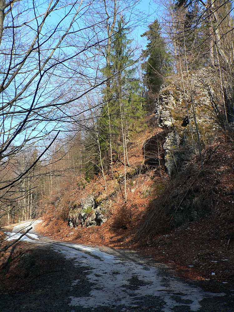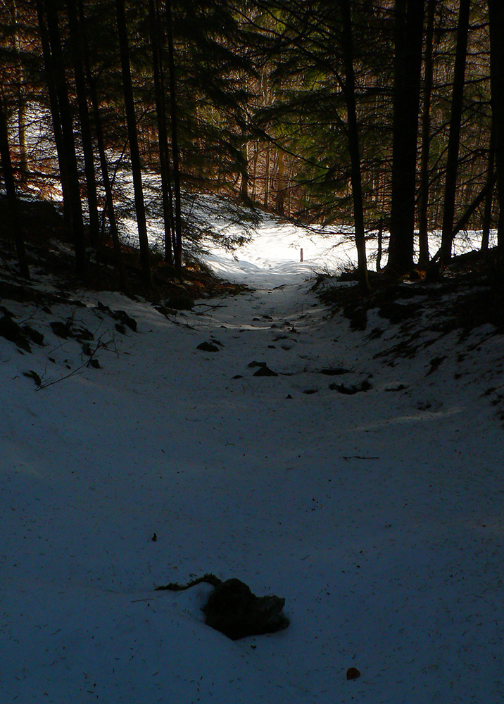 Jediný hrebeňový úsek na trase po sedlo Príslop je hrboľato zamrznutý, ale len na zvyškoch snehu. Väčšinou z kopca. Napájadlami pod Nižnou Lipovou nepohŕdam – odchlipnem si z fľaše a doplním. V Príslope nejdem až ku smerovníku, tesne pred ním miznem v lese – v tuneli pod smrekmi, ktorý ma po pár metroch prudšieho klesania vyhadzuje na zvážnicu. Prekročil som hranicu okresu, strašný hriech! Treba sa mi dostať na dno Ľubochnianskej doliny a to sa dá po tej zvážnici smerom doľava aj doprava. Volím doľava – predsa len, je tam viac na juh otočených svahov. Dobre som zvolil, dobre sa ide, snehu málo. Zato medvedích stôp požehnane. Podklad je mrazivo chrumkavý, no snažím sa klusať potichu a za každú zákrutu opatrne nazerám, či nevyruším domáceho pána. Ale nikde ani chlp a takto až dole, k horárni Salatín. Prostredie pekné, len podklad nižšie v doline zasfaltovel.