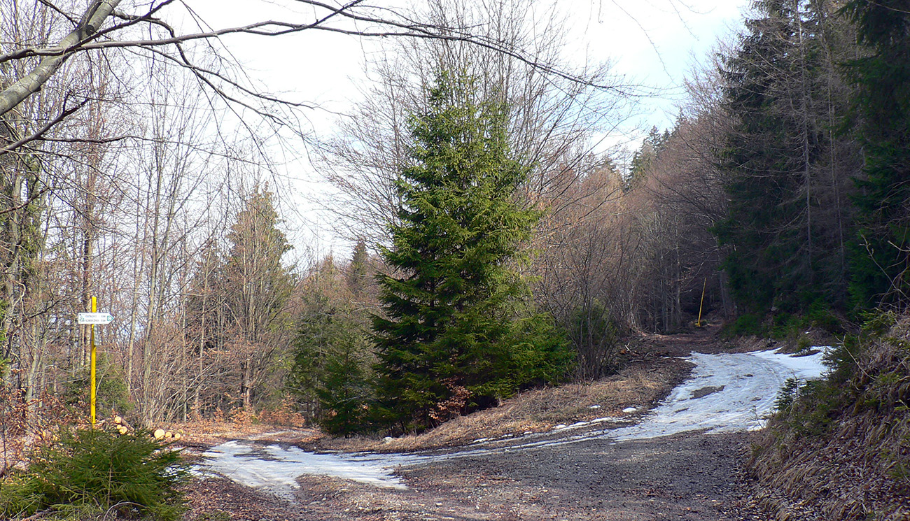No, ide sa zas na dlhší čas do kopca... Dolina Salatín už taká pekná pre oko nie je – viac lesohospodárska, viac blata na ceste, viac rúbanísk. A boj s gravitáciou začína už nohám vadiť. Joooj, ďaleko je ešte forma! Smerovník ukazuje: Ružomberok 23 km. Hodinky ukazujú: zatiaľ 27 km. Dobre, to sa mi páči :-) Zelené céčka na stromoch dodávajú istotu, ešte som tu nebol. Ale problém by byť nemal.