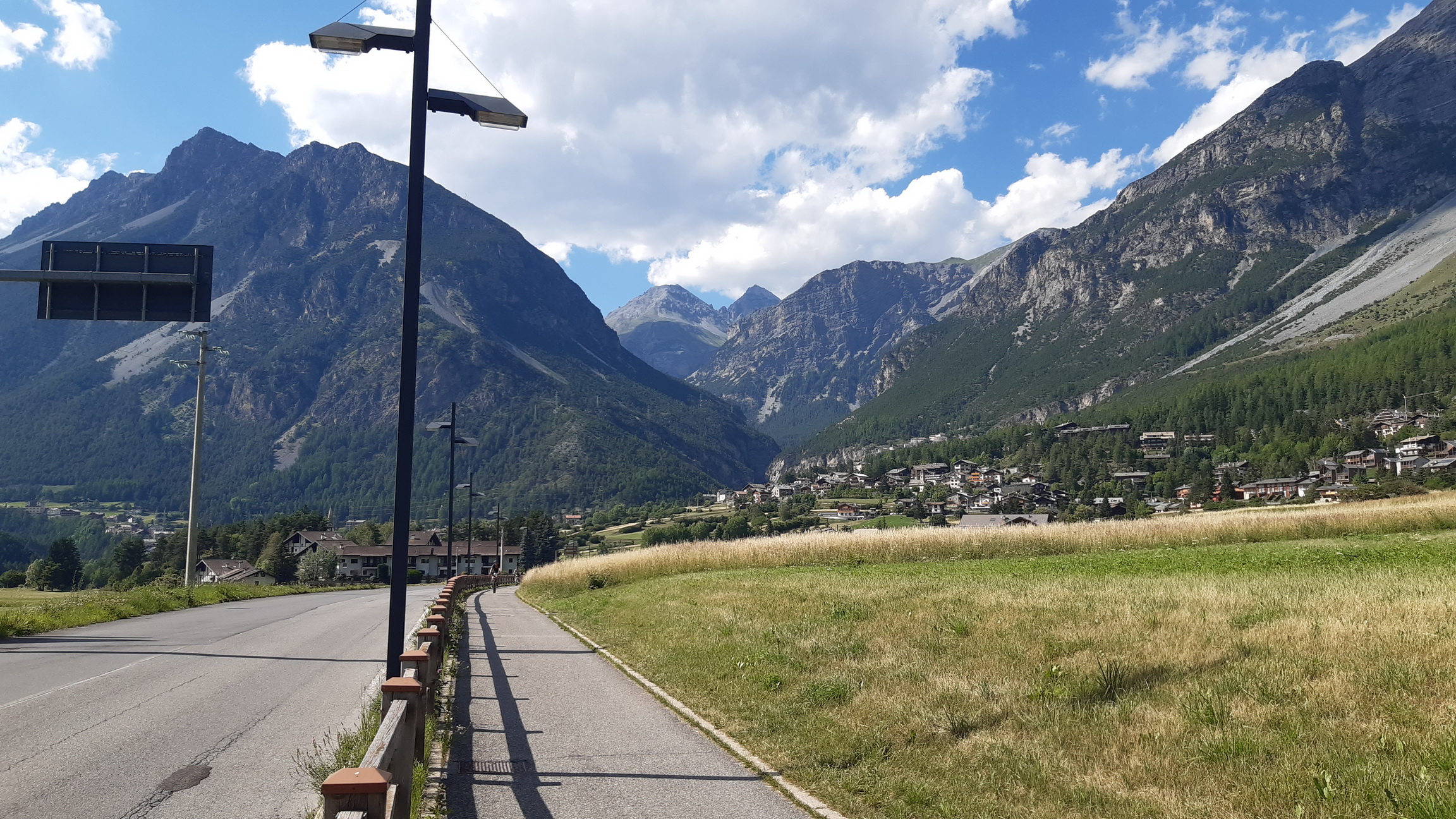 Prechádzam hlavnou ulicou, známa zmrzlináreň ešte zavretá. Odbočujem na známy asfaltový cyklochodník vedúci celou Valtellinou a začínam šliapať v smere na Bormio. Na chodníku je fajn, žiadna premávka. Tovo di San Agatha a už prichádzam do dedinky Mazzo di Valtellina kde sa začína stúpanie na Mortirolo.