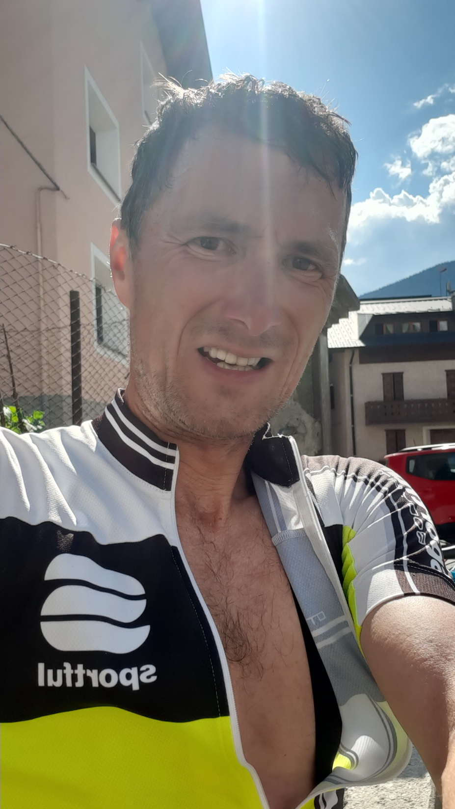 Minútky pred ôsmou zjazdujem z Rosegu do Pontresiny. Mám na sebe všetko, čiže rukávy, termotričko, šuštiačku. Hneď v Pontresine si ju dávam dole, vyzerá, že bude teplo. Prvé stúpanie na passo Bernina je pohoda na zahriatie, vietor mám dobrý a tak za hodku a pár minút som hore. Nezastavujem nemám prečo a hneď sa púšťam do zjazdu. Stojím až na semaforoch. Trikrát sakra. Do Tirána prichádzam až cca dve hoďky po štarte. Ten zjazd mi aj so semaformi niečo trval, veď je to zas asi 1800 výškových dole a nejaké tie kilometre k tomu.