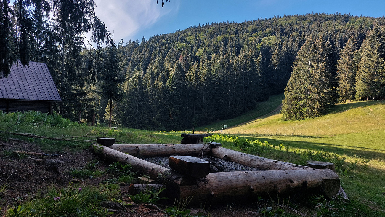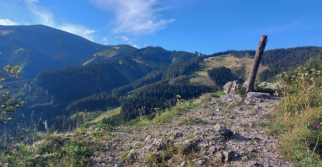 Potom ide chodník viac lesom, pohodlnejšie ako na Valientovom dieli (menší sklon aj menej suti pod nohami). A nie je to jednosmerka, dá sa tu motať pomedzi skaly a odskakovať na viaceré vyhliadky. Zostup na druhú stranu je poriadne prudký až do sedielka, kde sú zasa dve možnosti. Prvá je doprava - spomínaný záver Anakondy, veľmi pekný chodník. Ale ten som už spoznal, tak som to stočil doľava na „obchvat“ Hoblíka z východu. Tiež veľmi pekný singlík, aj popri ňom sú početné malé bralká. Záver má strmší, spája sa so zostupovým chodníkom priamo z vrcholu a lezie z lesa pod stožiarom elektrického vedenia. Tam si už každý vyberie, či sa hodí doľava a strmo zostúpi chodníkom do doliny, alebo menej strmo po ceste doprava, na lúku nad dedinou.