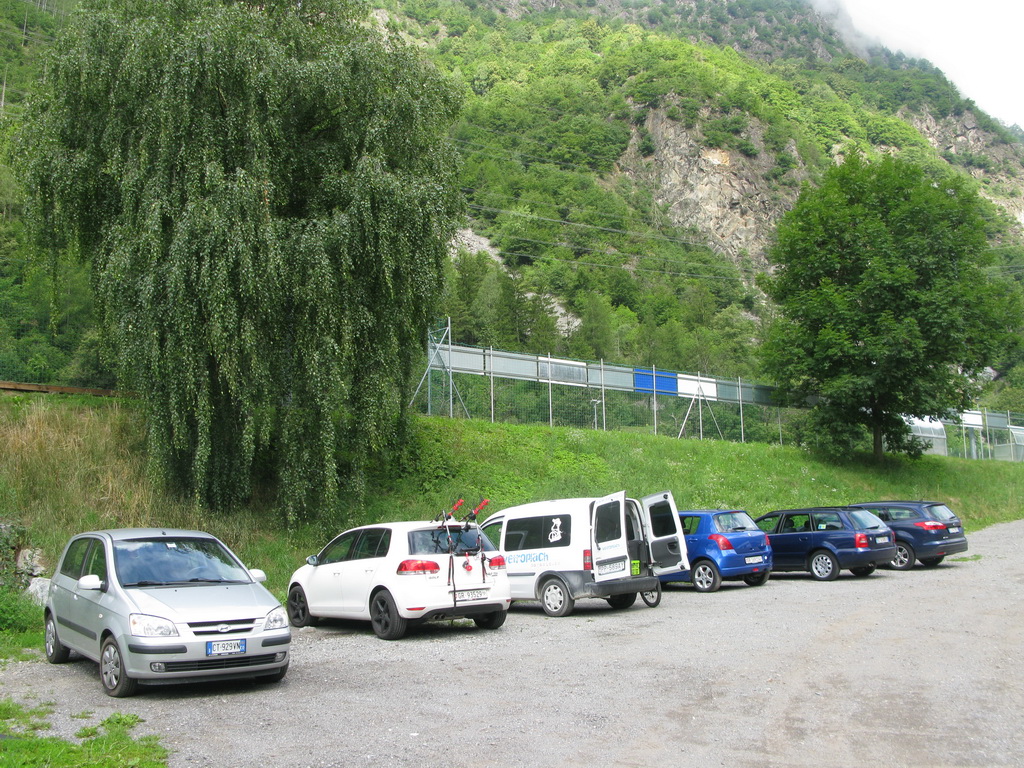 Parkujem v dedinke Campascio cca 600m. Je to dedinka hneď za Brusiom v smere do Talianska. Parádne parkovisko je pri futbalovom štadióne asi 250 metrov od hlavnej cesty (foto).