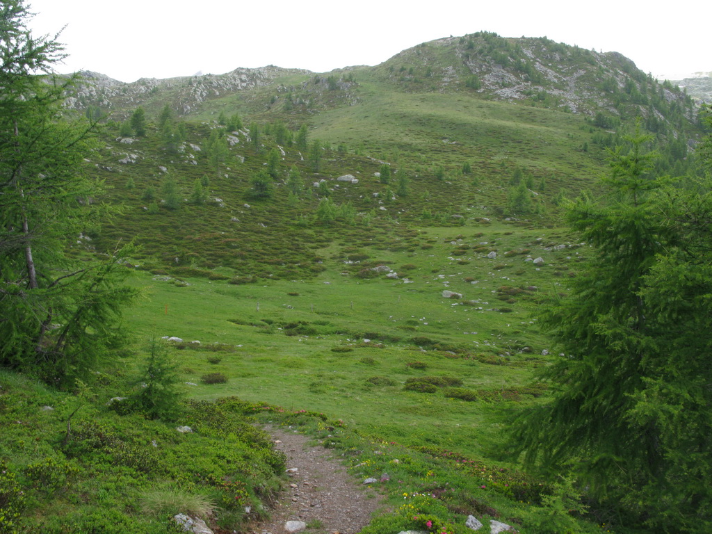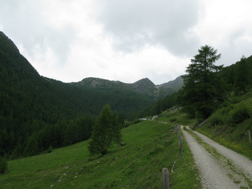 Stúpanie je na začiatku asfaltové, premávka žiadna, výhľady parádne. Postupne cesta prejde do kvalitnej šotoliny, až v závere sa zmení na singltrail. Úzky chodníček na ktorom treba trošku aj potlačiť, ale to už som skoro hore. Začína pršať, nič neobvyklé. Robím si trošku starosti o kvalitu fotiek :))