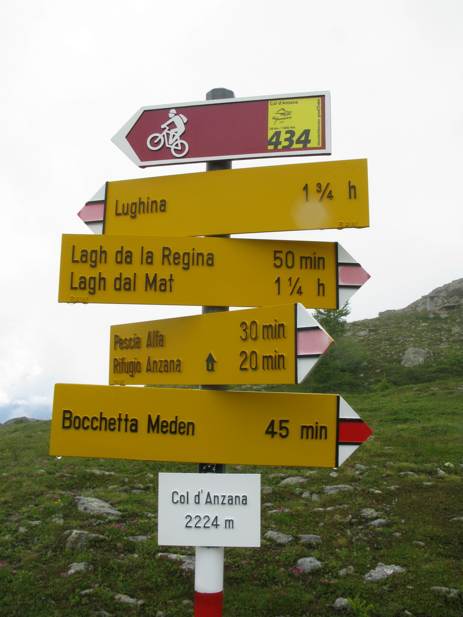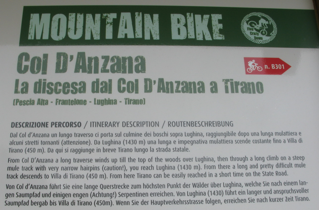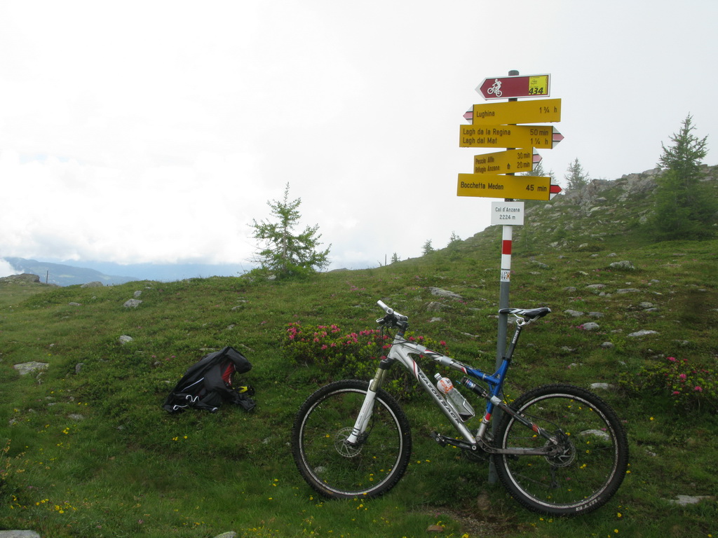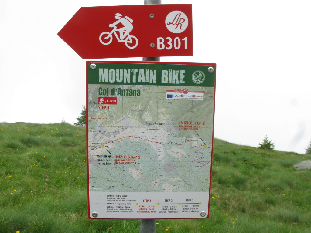 Vyberám bajk z auta. Štartujem priamo od rázcestníka s turistickými značkami a jednou bajkerskou tabuľkou. Čaká ma stúpanie smer Col dAnzana, sedlo vysoké 2224m. čiže musím vystúpať 1620 výškových metrov.