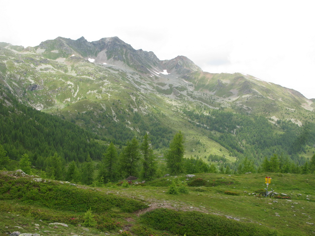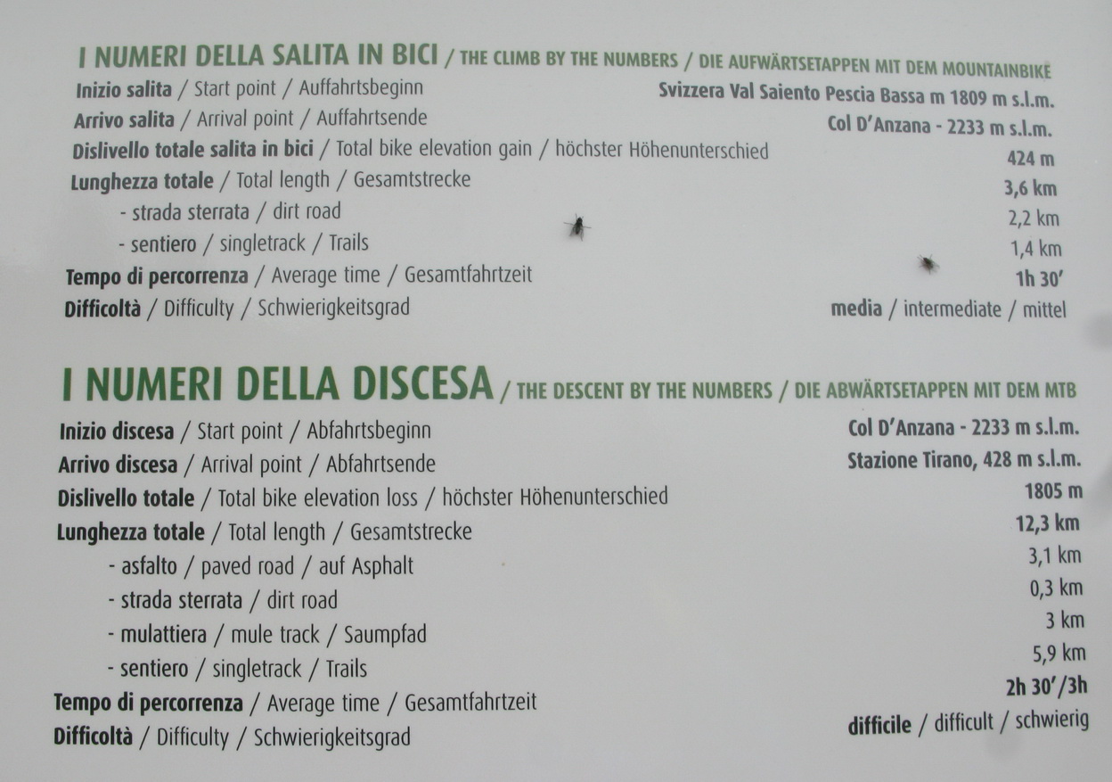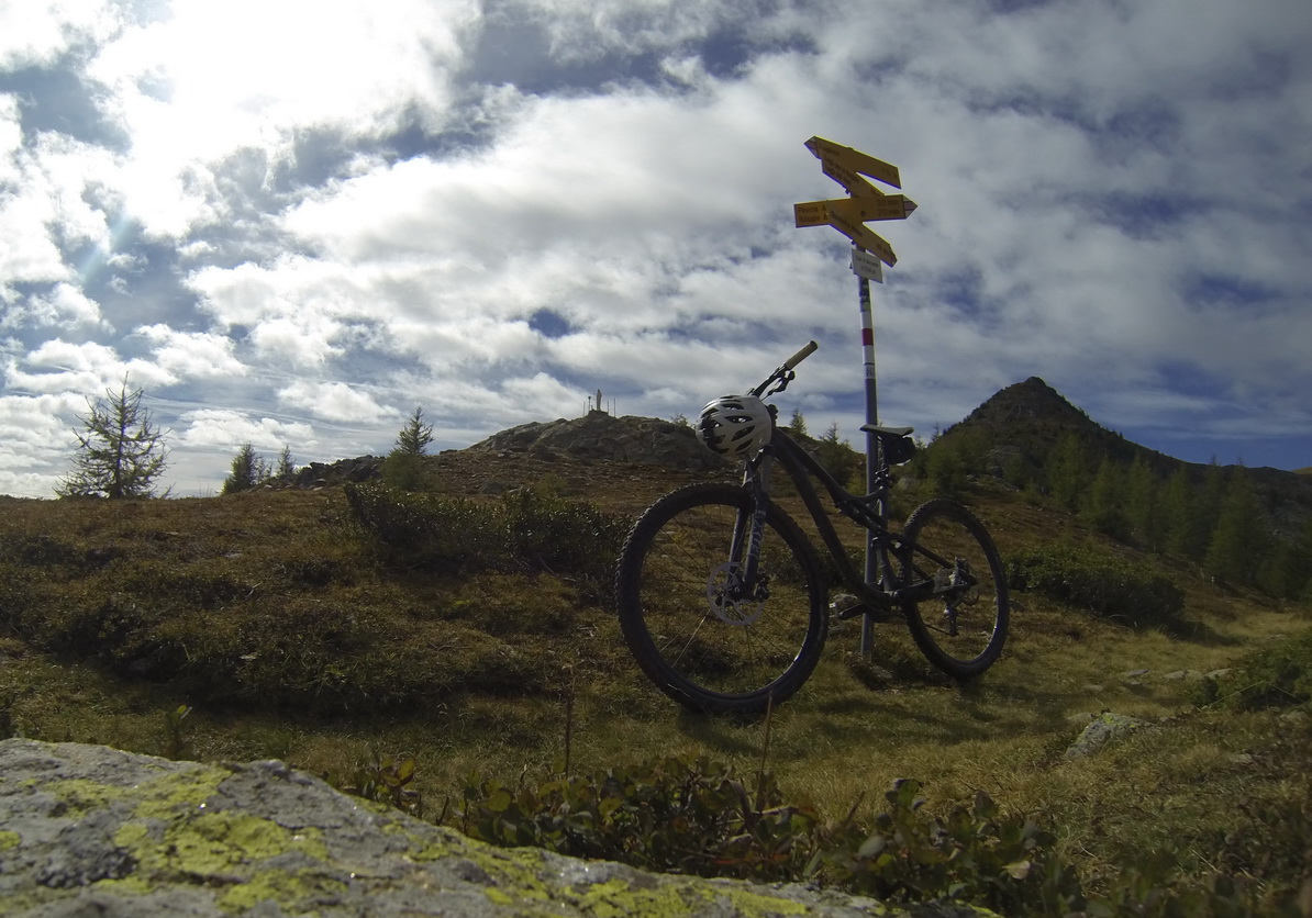 Vyberám bajk z auta. Štartujem priamo od rázcestníka s turistickými značkami a jednou bajkerskou tabuľkou. Čaká ma stúpanie smer Col dAnzana, sedlo vysoké 2224m. čiže musím vystúpať 1620 výškových metrov.
