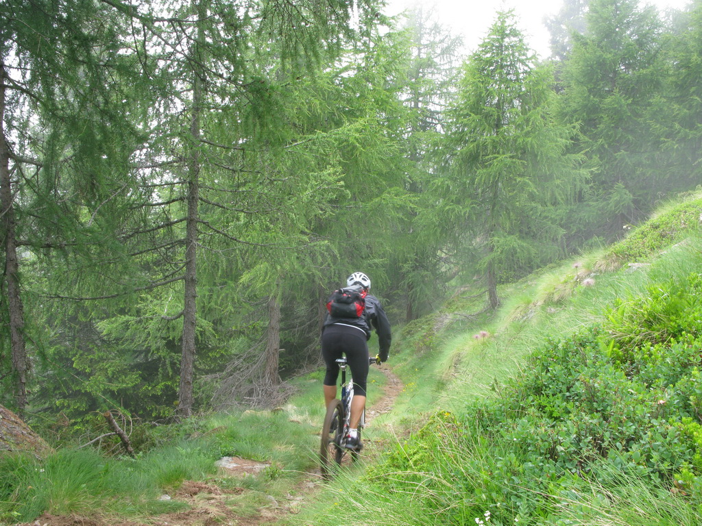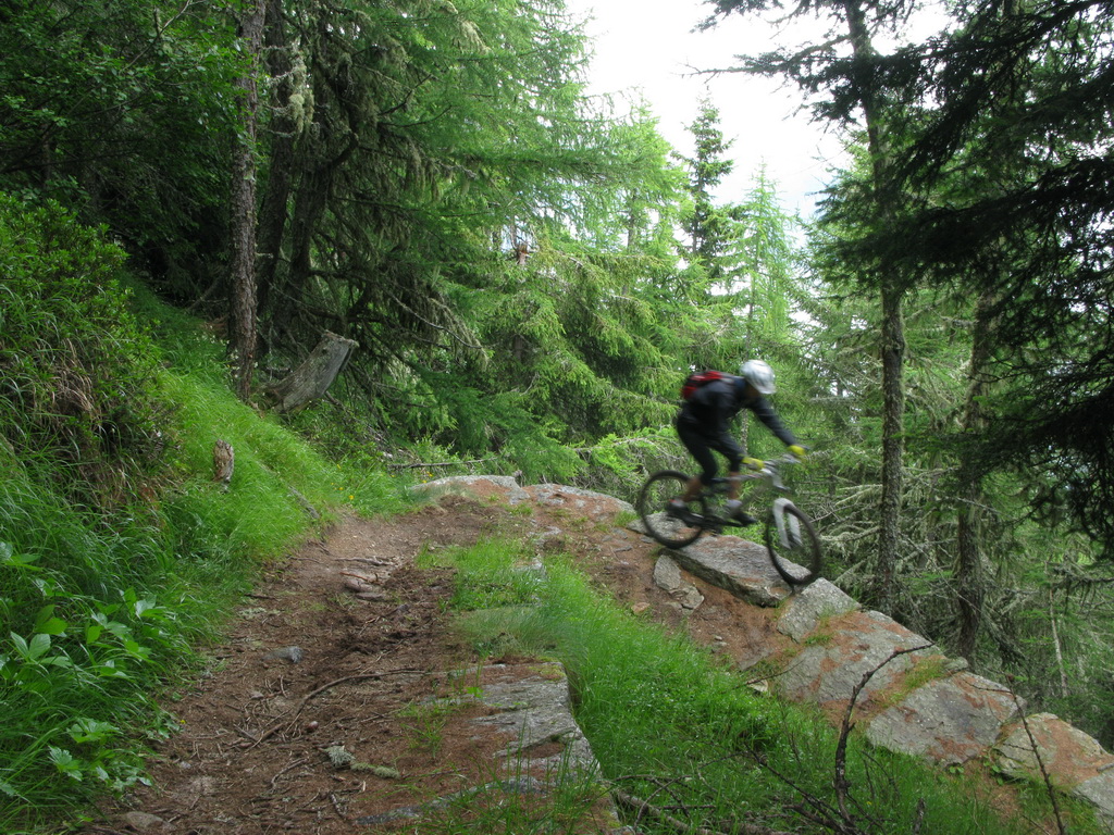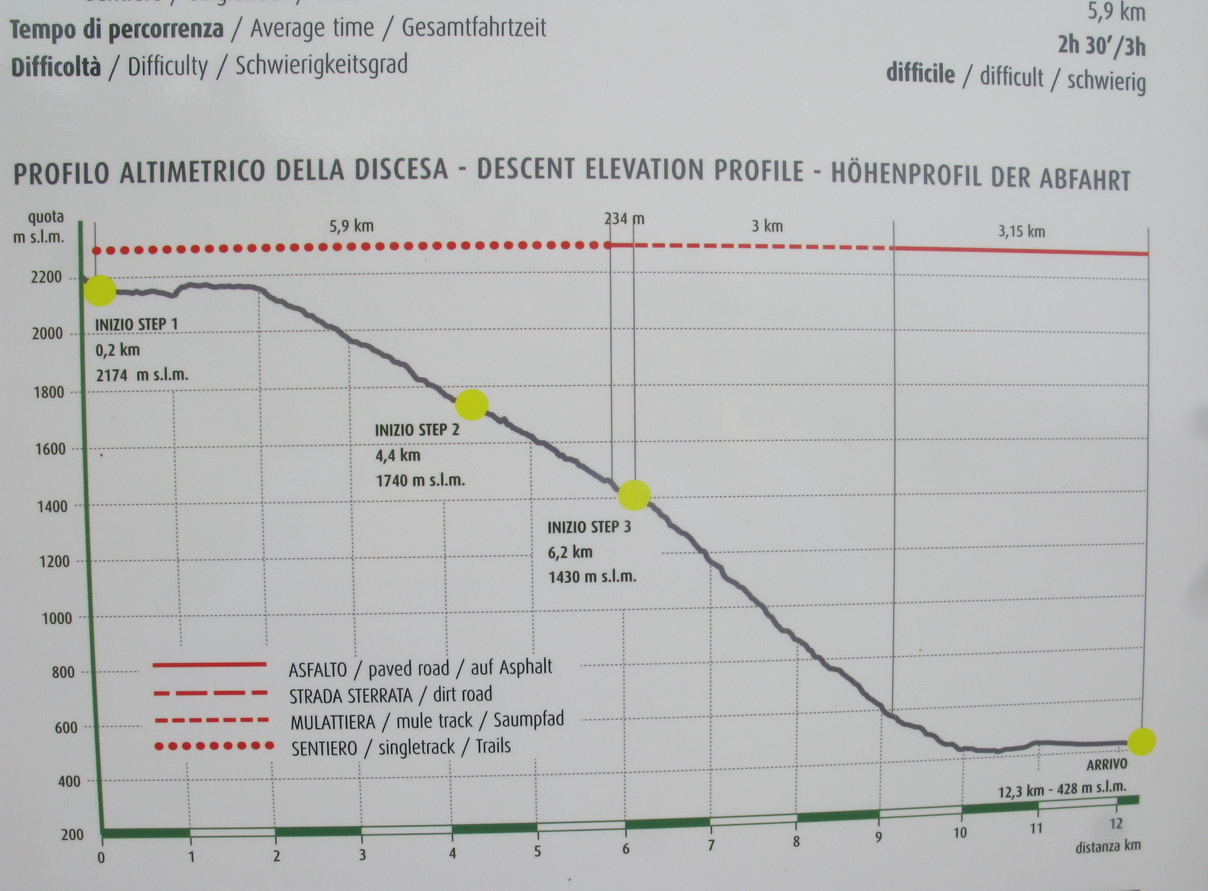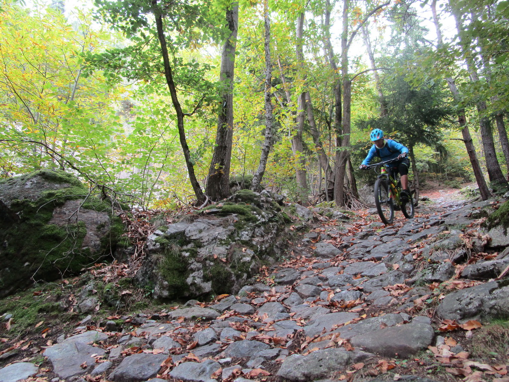 Nádherný zjazd. Strmé serpentíny. Z bajku som nezosadol, nebolo to až také ťažké. Nasleduje tretia časť vedúca starou mulatierou - chodníčkom pre muly, ktoré zásobovali vojenské pevnosti na kopci. Muly vystriedali bajkeri. Chodníček je vydlaždený veľkými kameňmi. Sú hladké a miestami aj mokré... zjazd veľmi náročný, miestami veľmi delikátne dobrzďovanie.